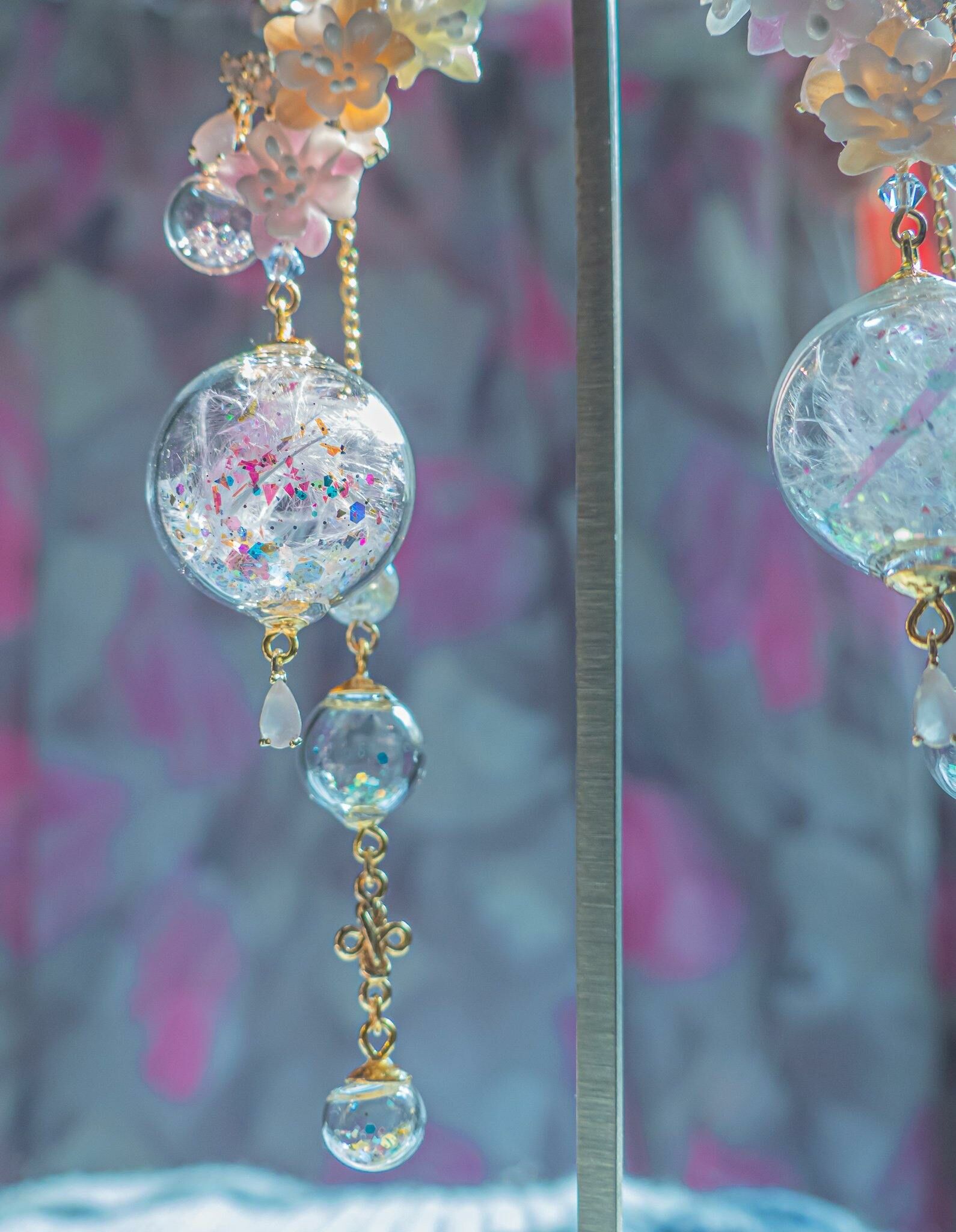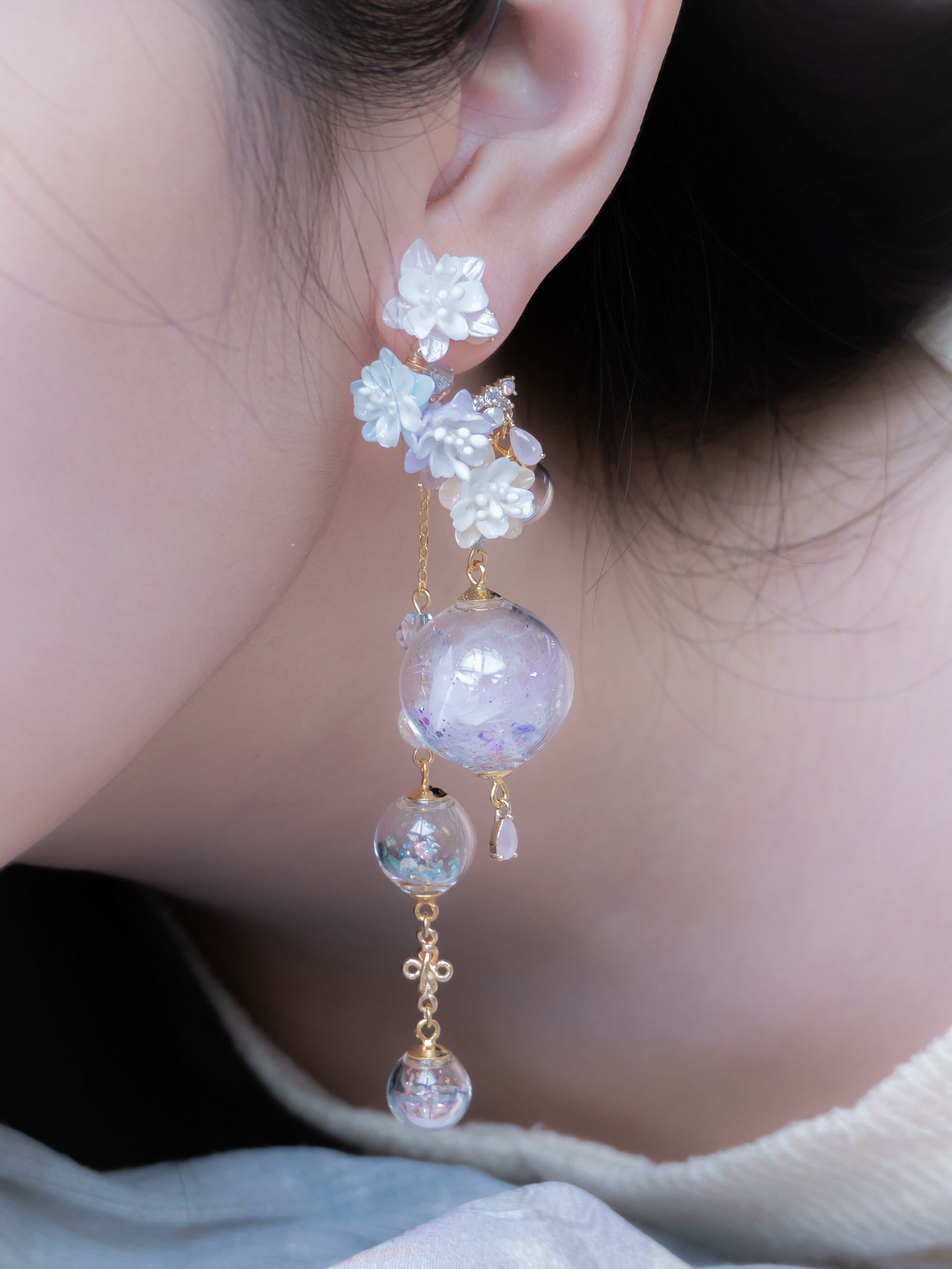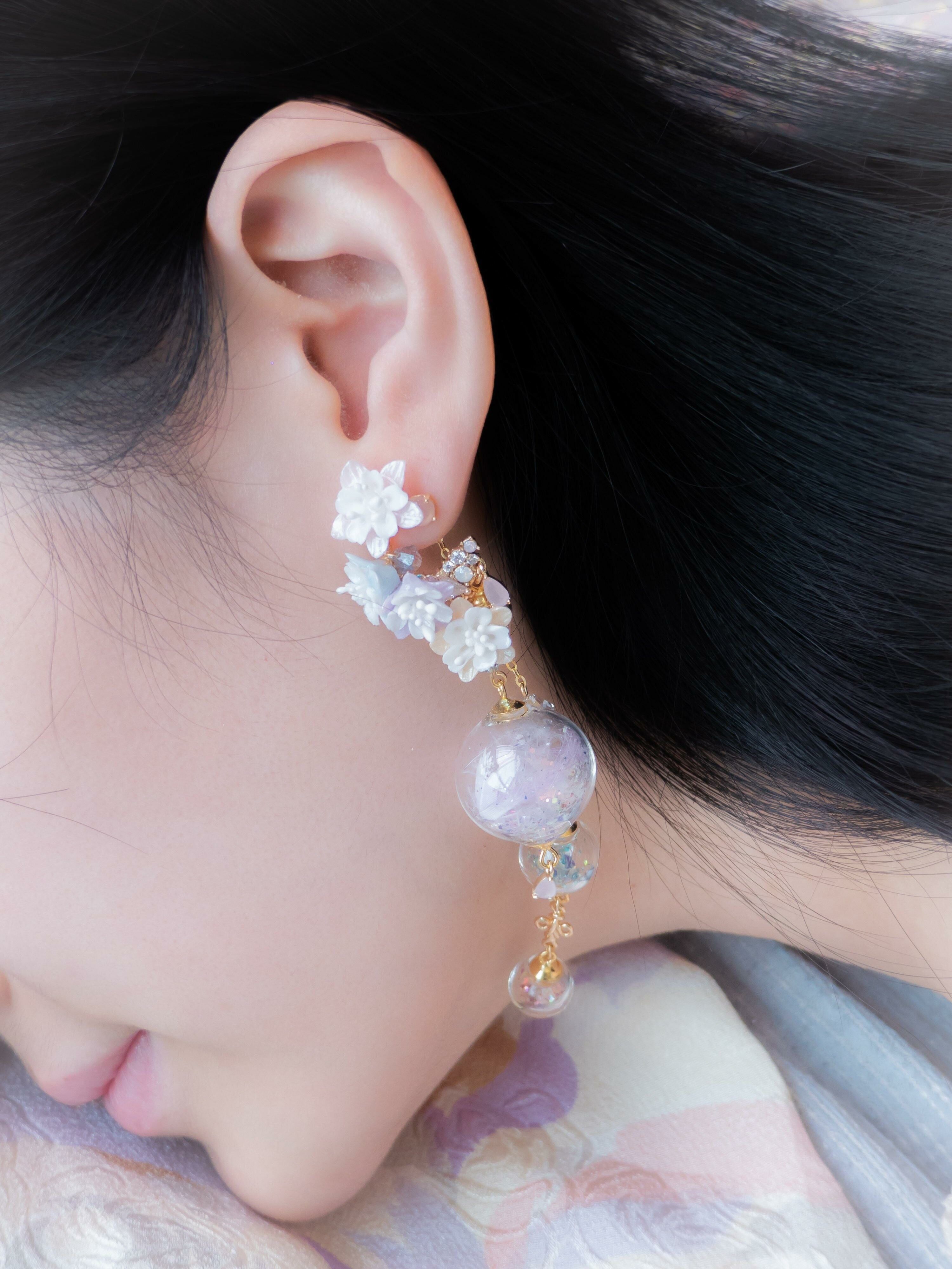 Gold Plated Artistic Wire | Austrian Crystal | Natural Quartz | Glass Globe | Japanese CZ | Handcrafted Resin Clay Flowers | UV Hardening Coating | 14K Gold-plated S925 CZ Ear Stud