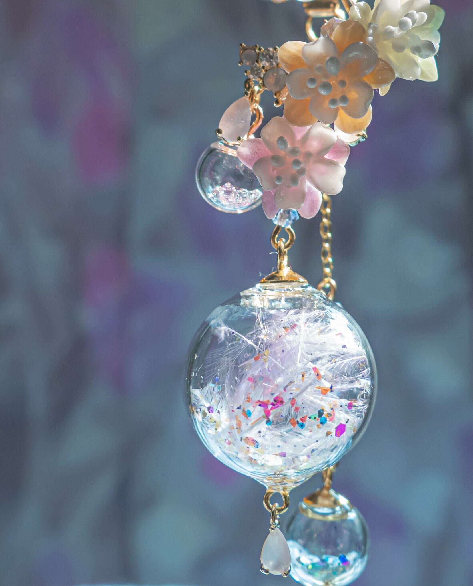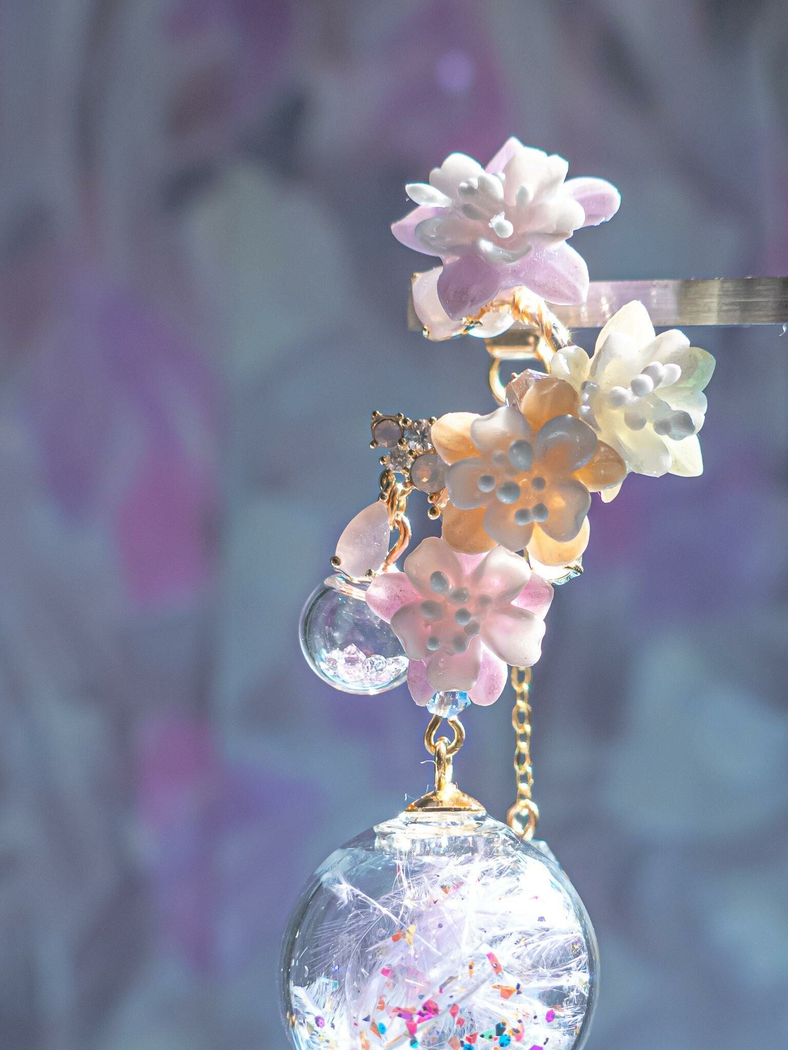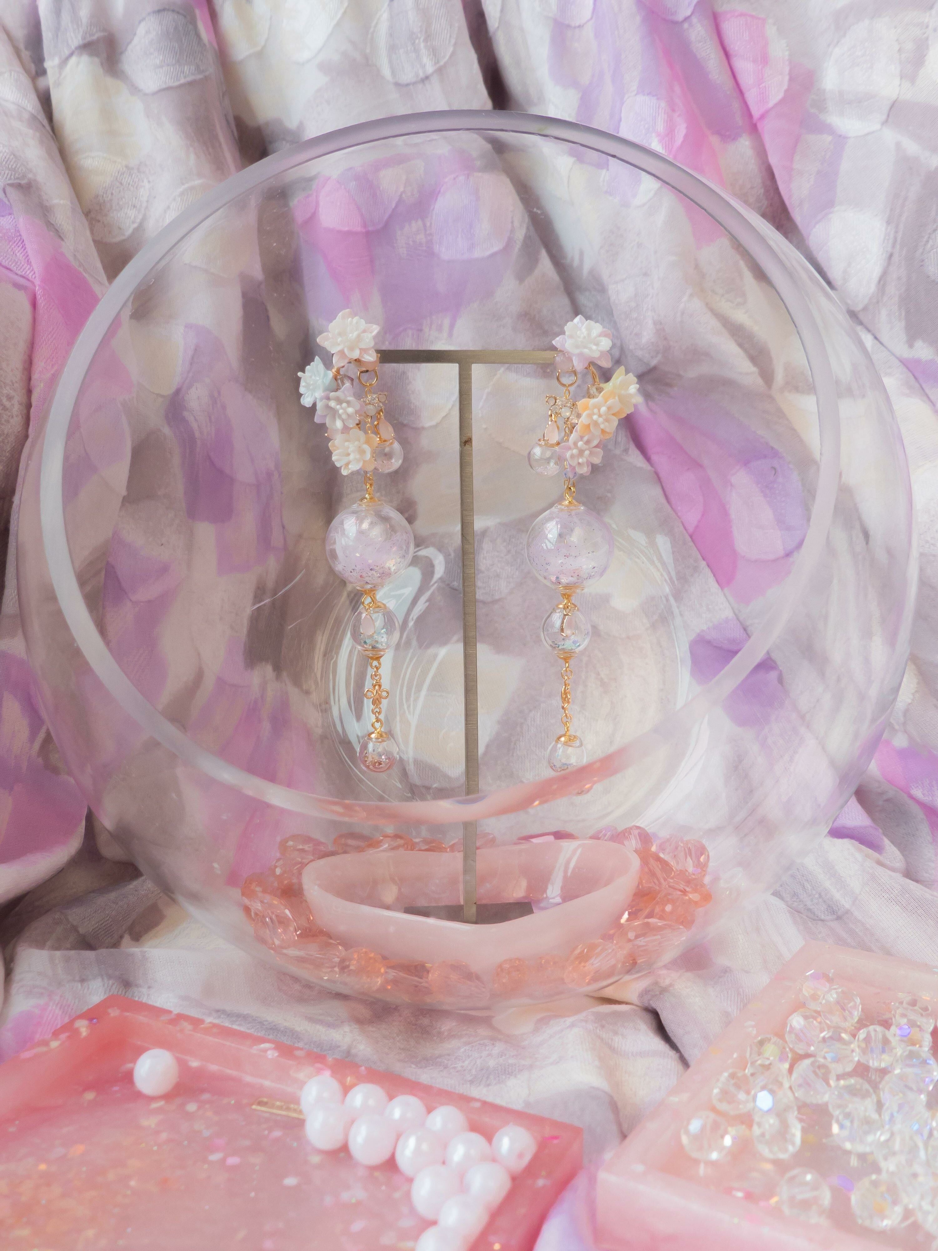 Gold Plated Artistic Wire | Austrian Crystal | Natural Quartz | Glass Globe | Japanese CZ | Handcrafted Resin Clay Flowers | UV Hardening Coating | 14K Gold-plated S925 CZ Ear Stud