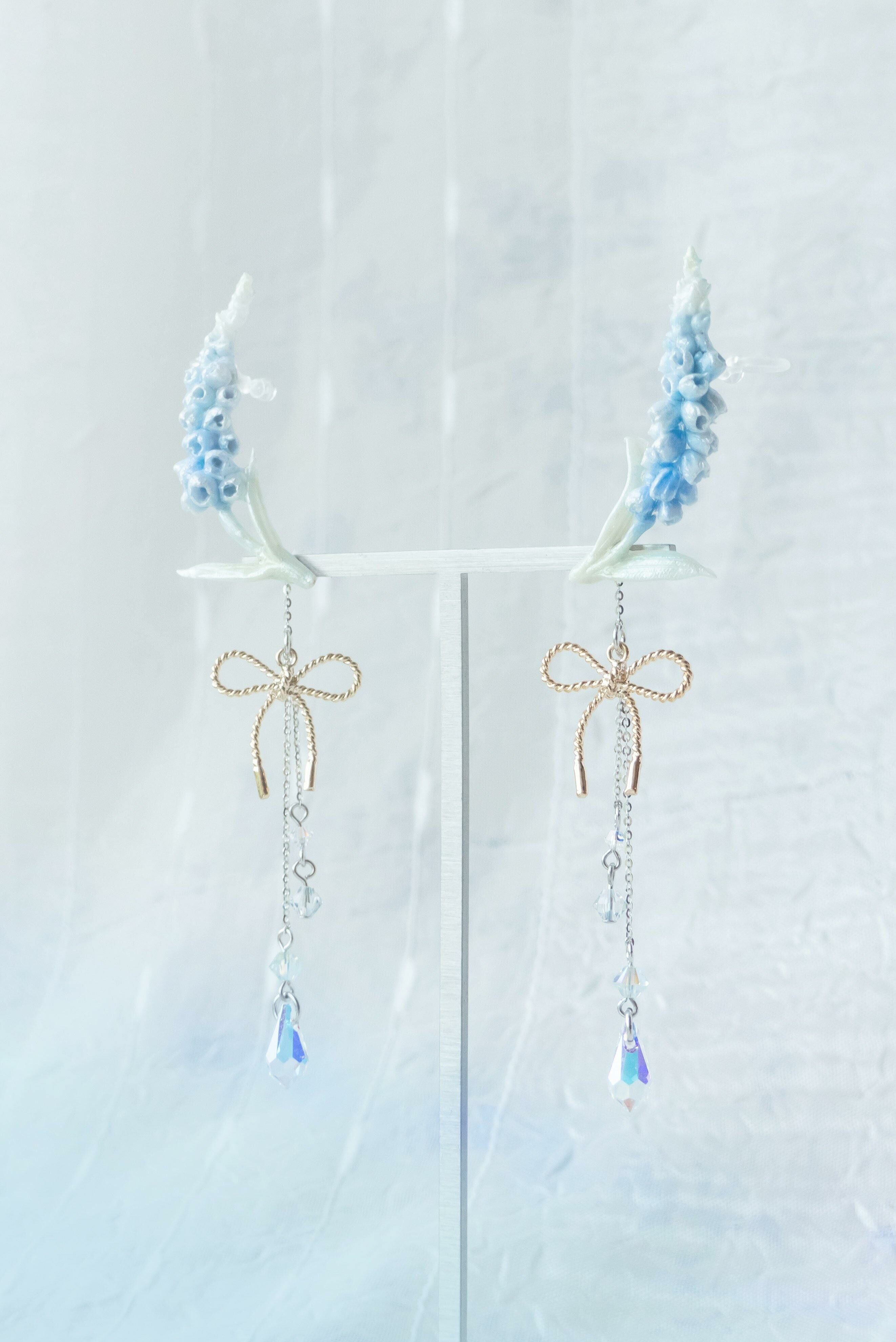 Gold Plated Artistic Wire | Austrian Crystal | Handcrafted Resin Clay Muscari | UV Hardening Coating | Gold-Plated Ribbon | 925 Silver Ear Stud