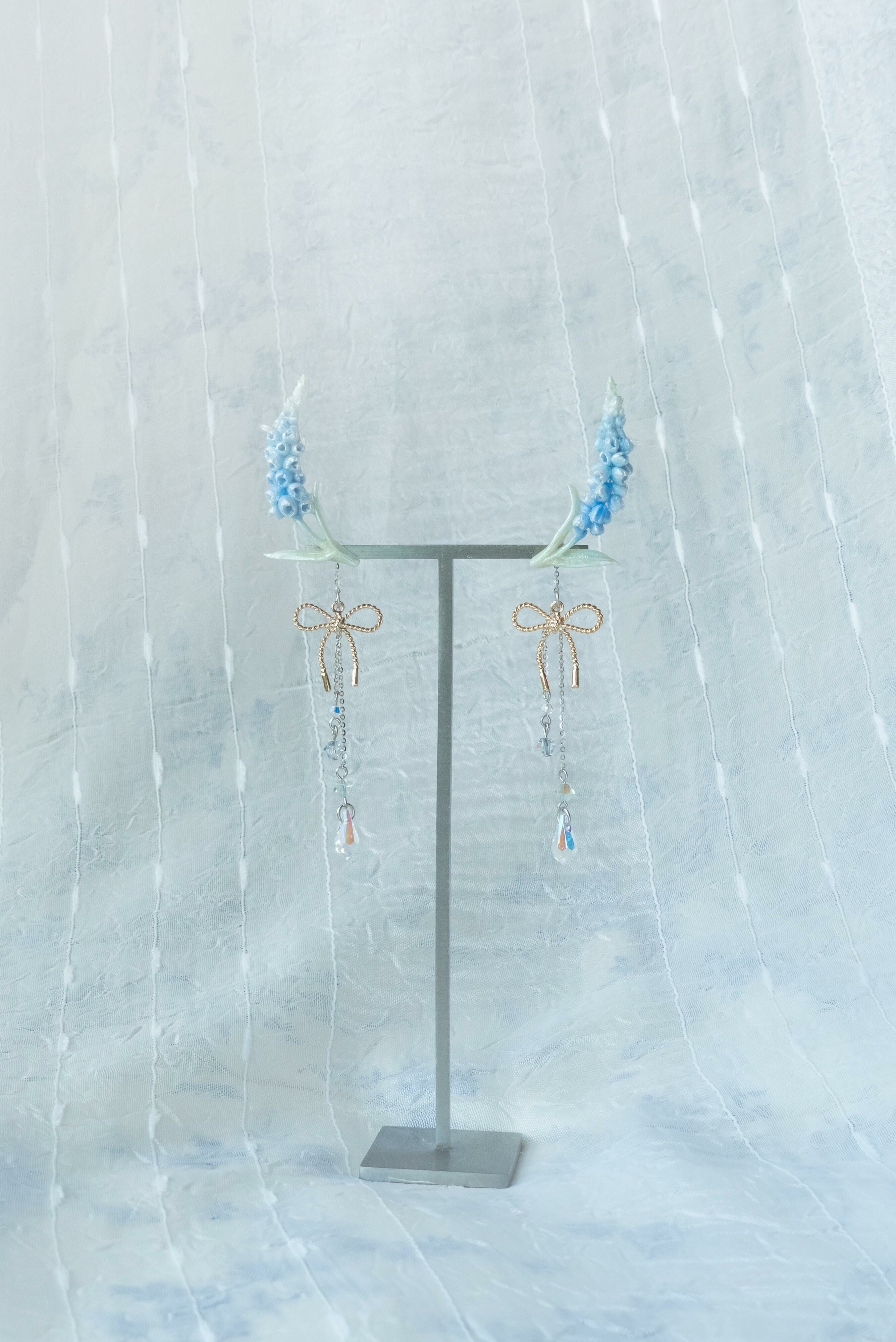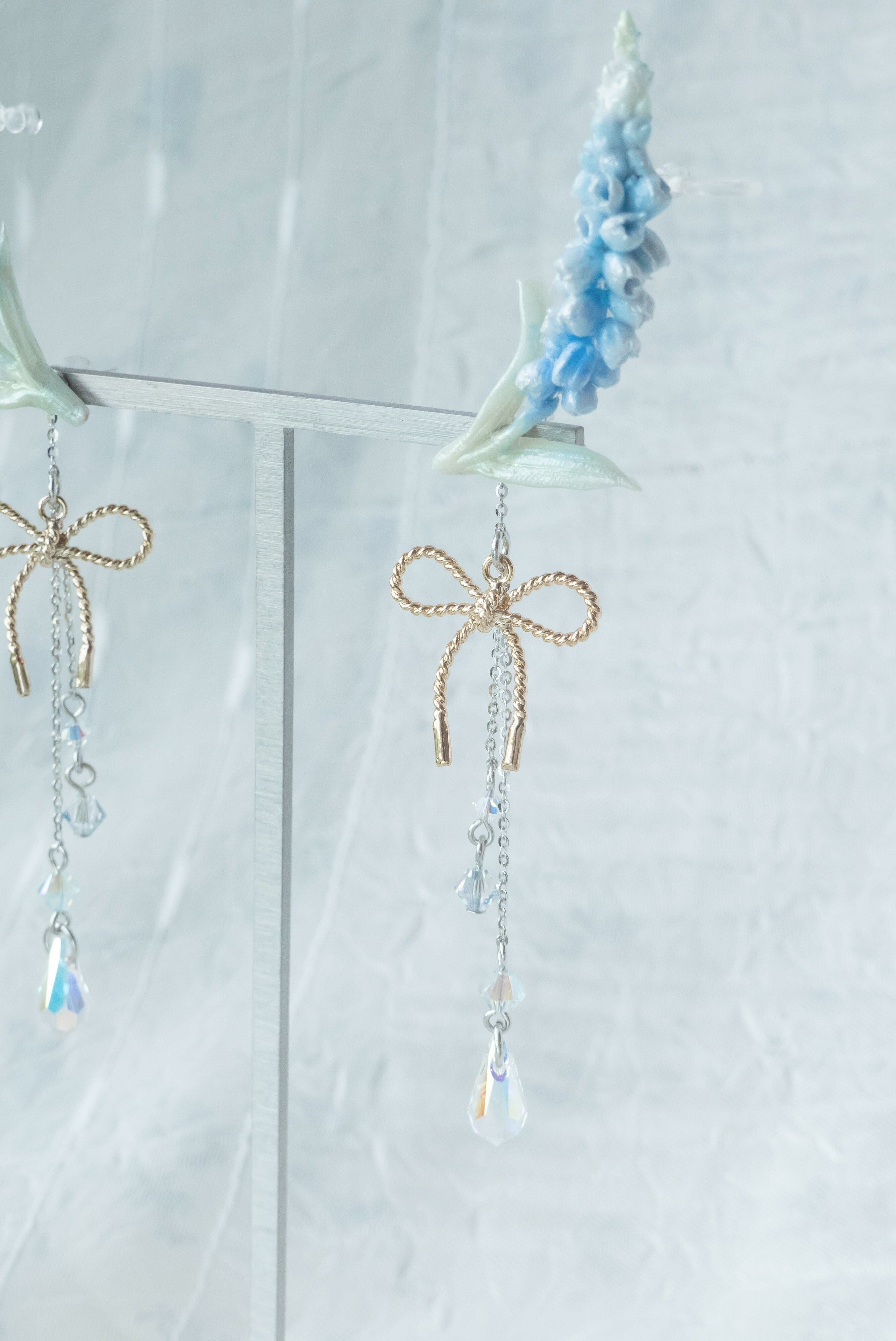 美國進口Beadsmith純銀線 | 奧地利水晶 | 手製樹脂黏土風信子 | UV強化保護層 | 鍍金蝴蝶結 | 925純銀耳針