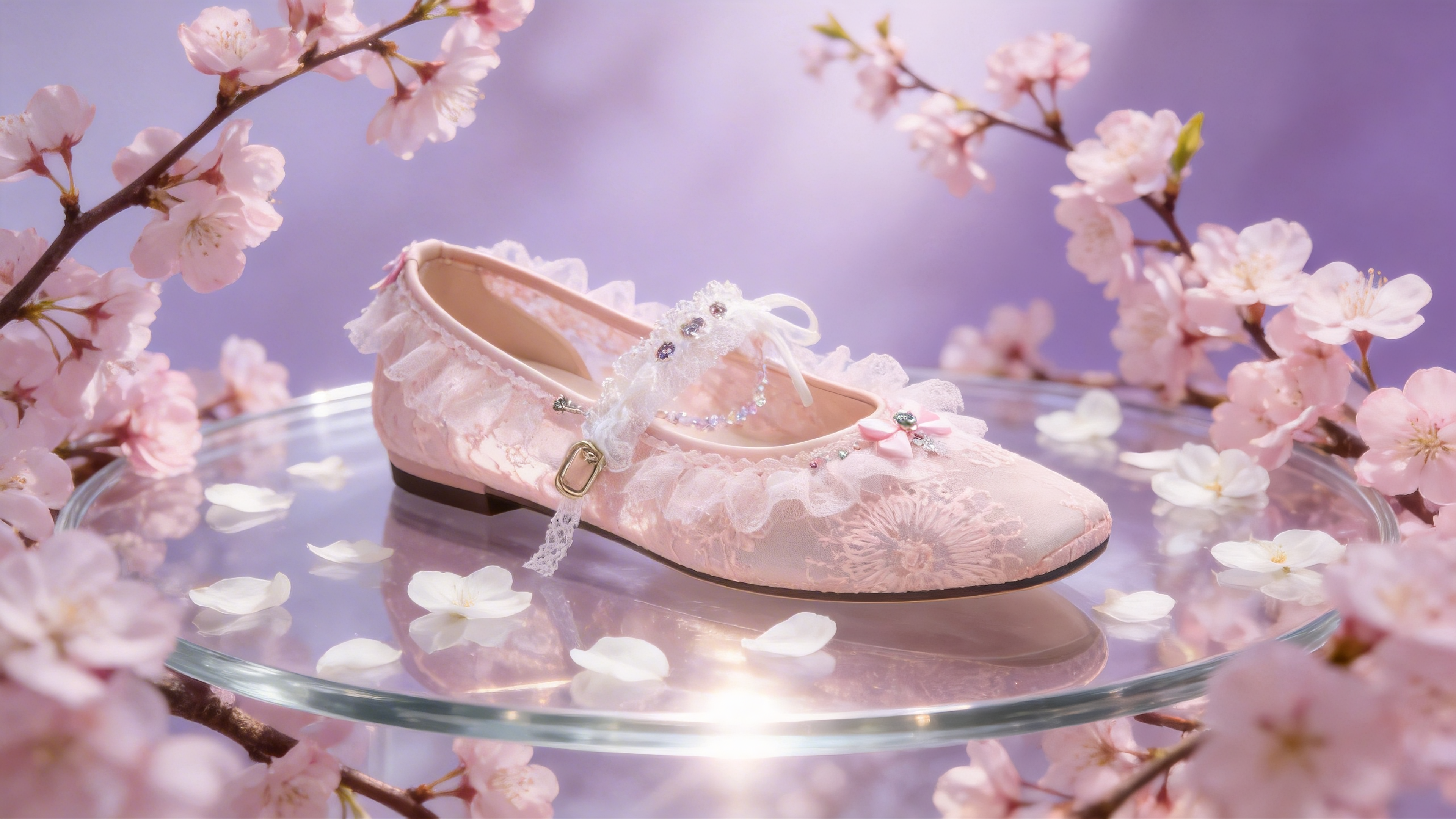 以經典 D+AF 瑪麗珍鞋為基礎重新改造,加入櫻花與水晶元素,呈現夢幻而細膩的芭蕾氛圍。鞋面覆以柔和蕾絲紋理,搭配立體蕾絲花邊與晶亮鋯石細節,營造出溫柔而閃耀的光感。水晶與小寶石的點綴讓整體造型更顯精緻,一眼便能看出與別不同。