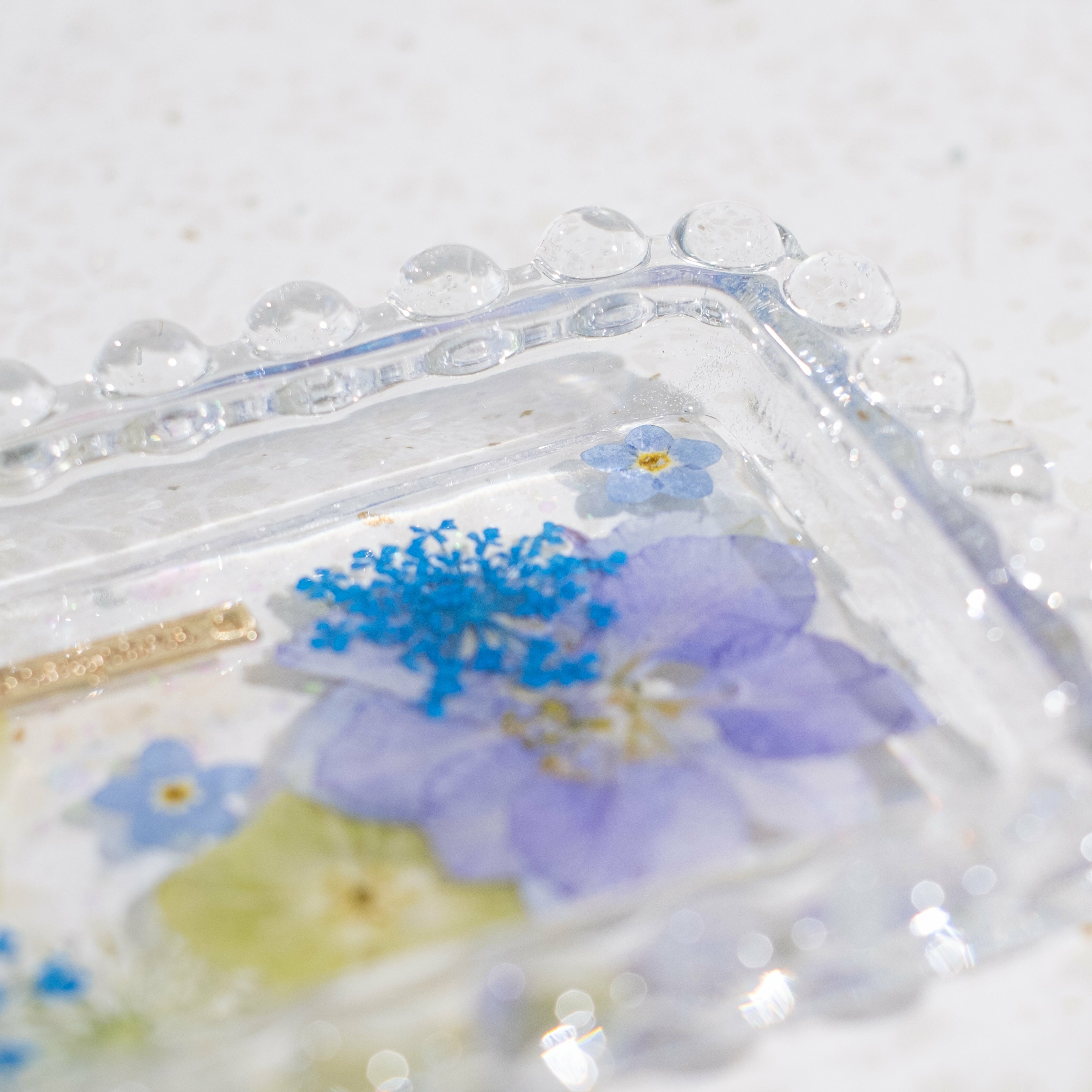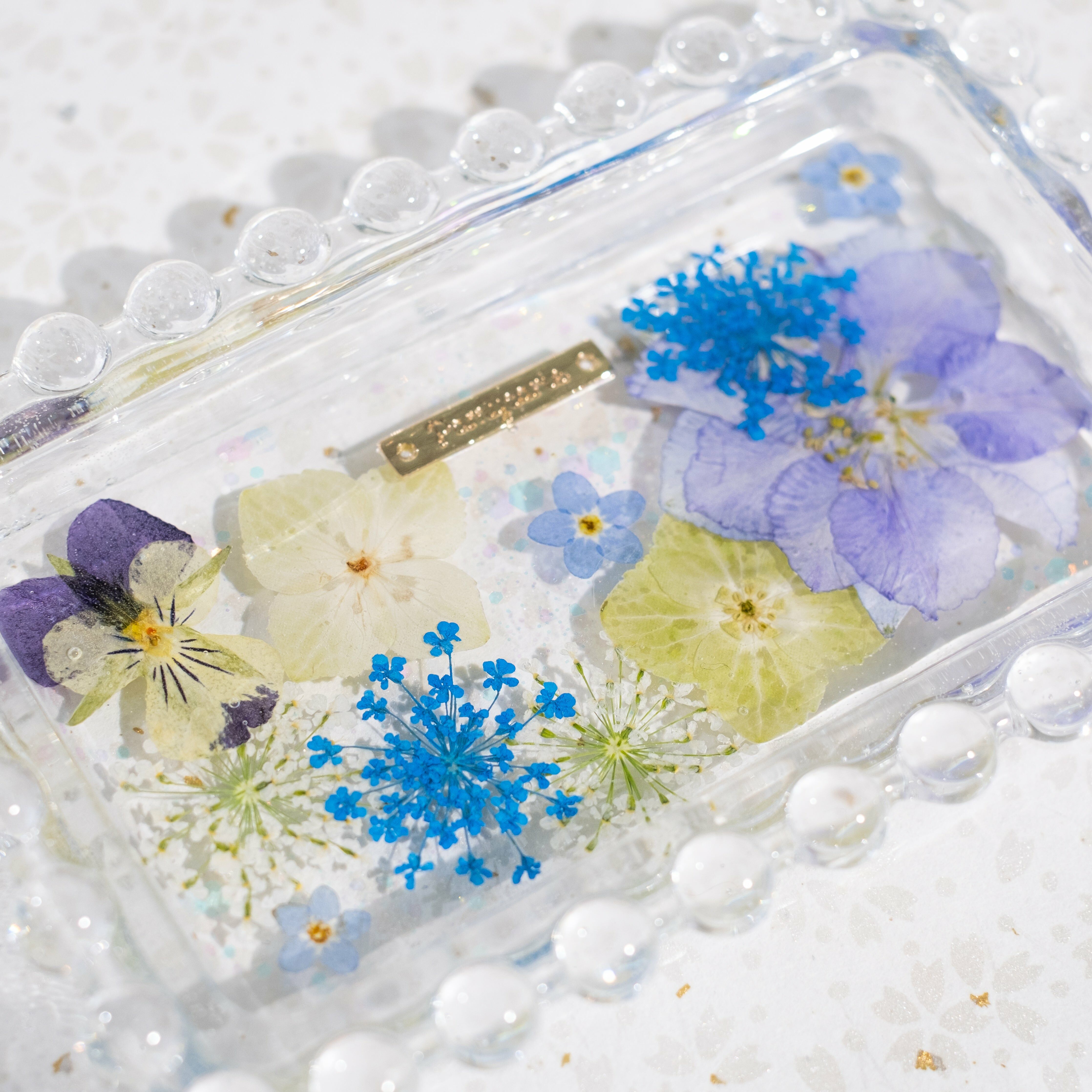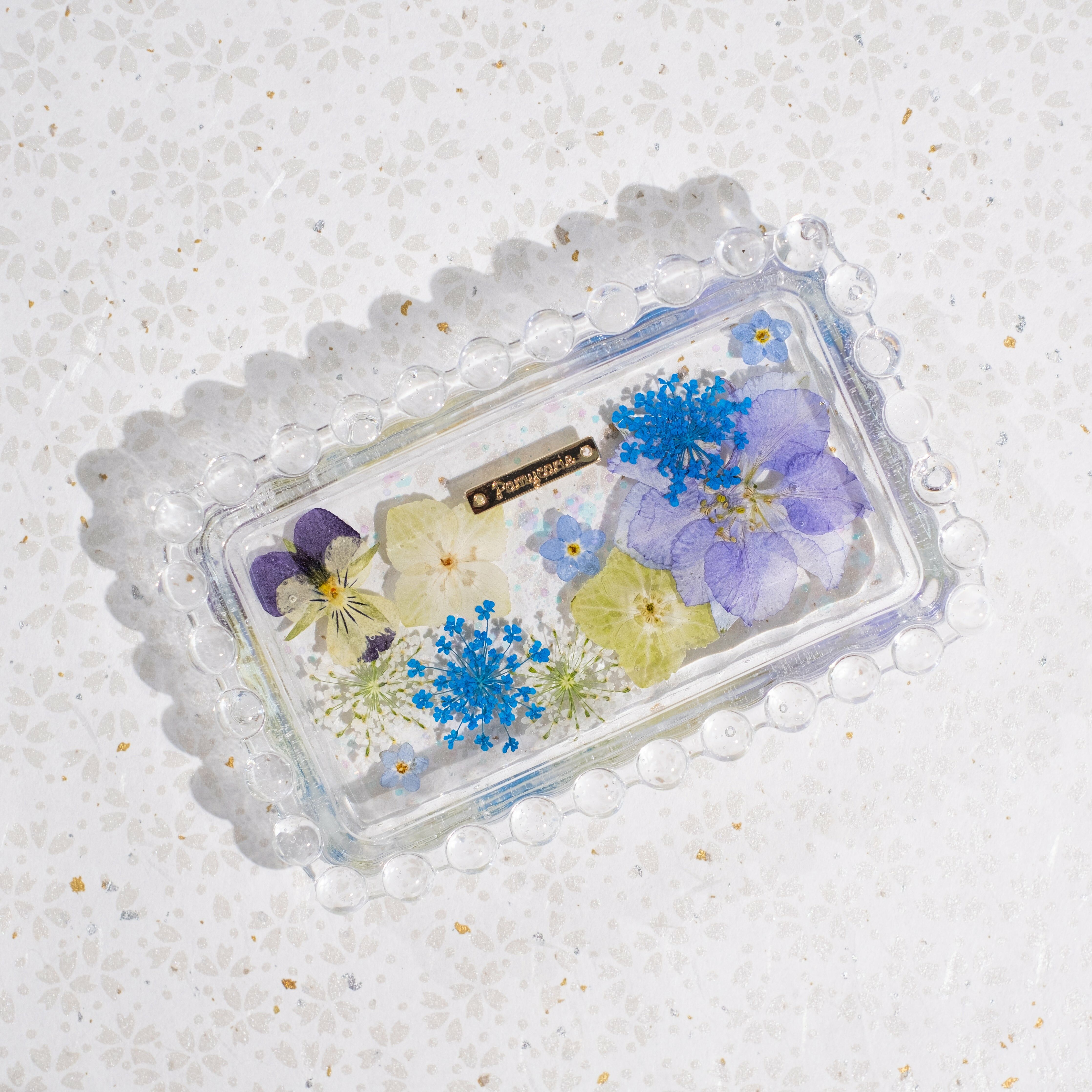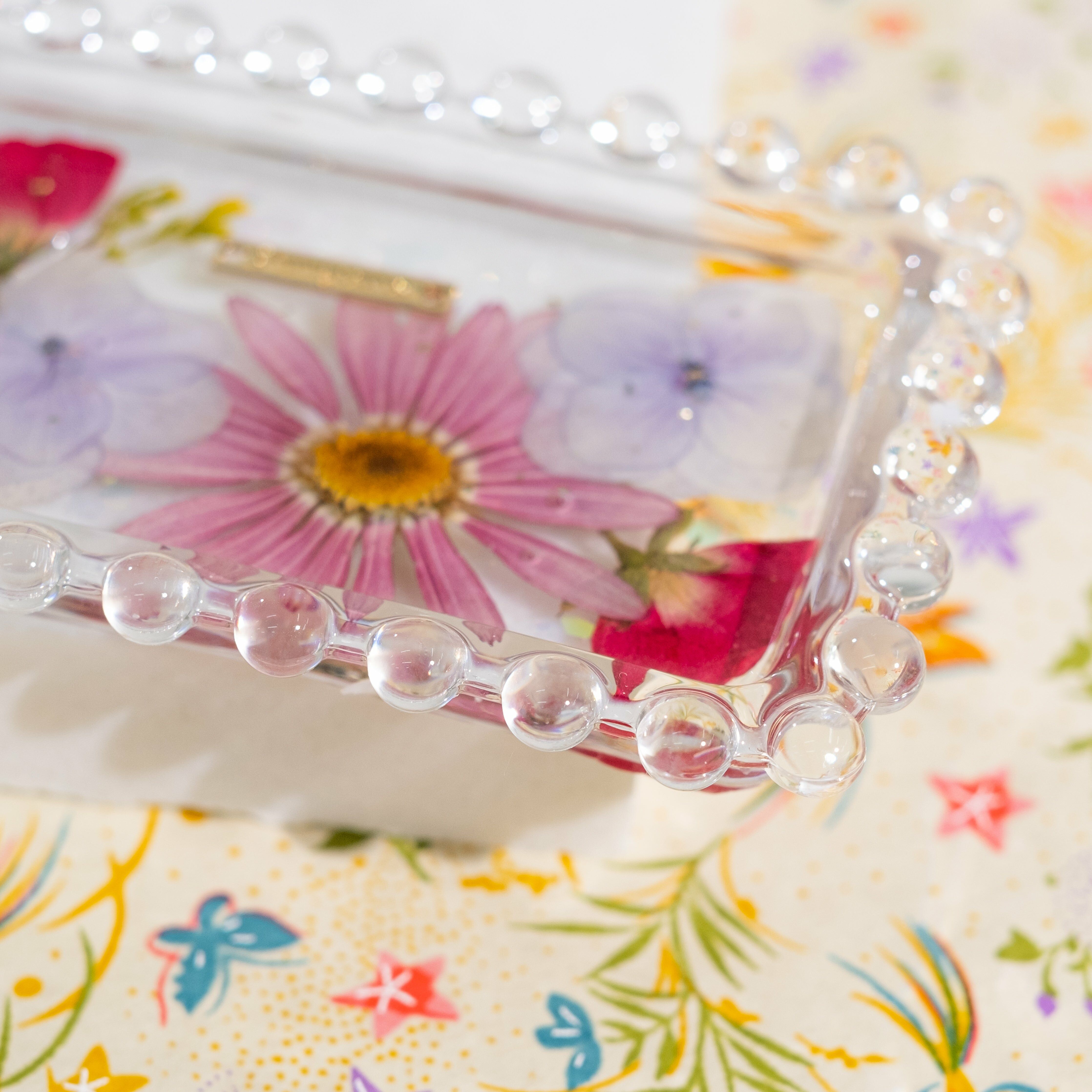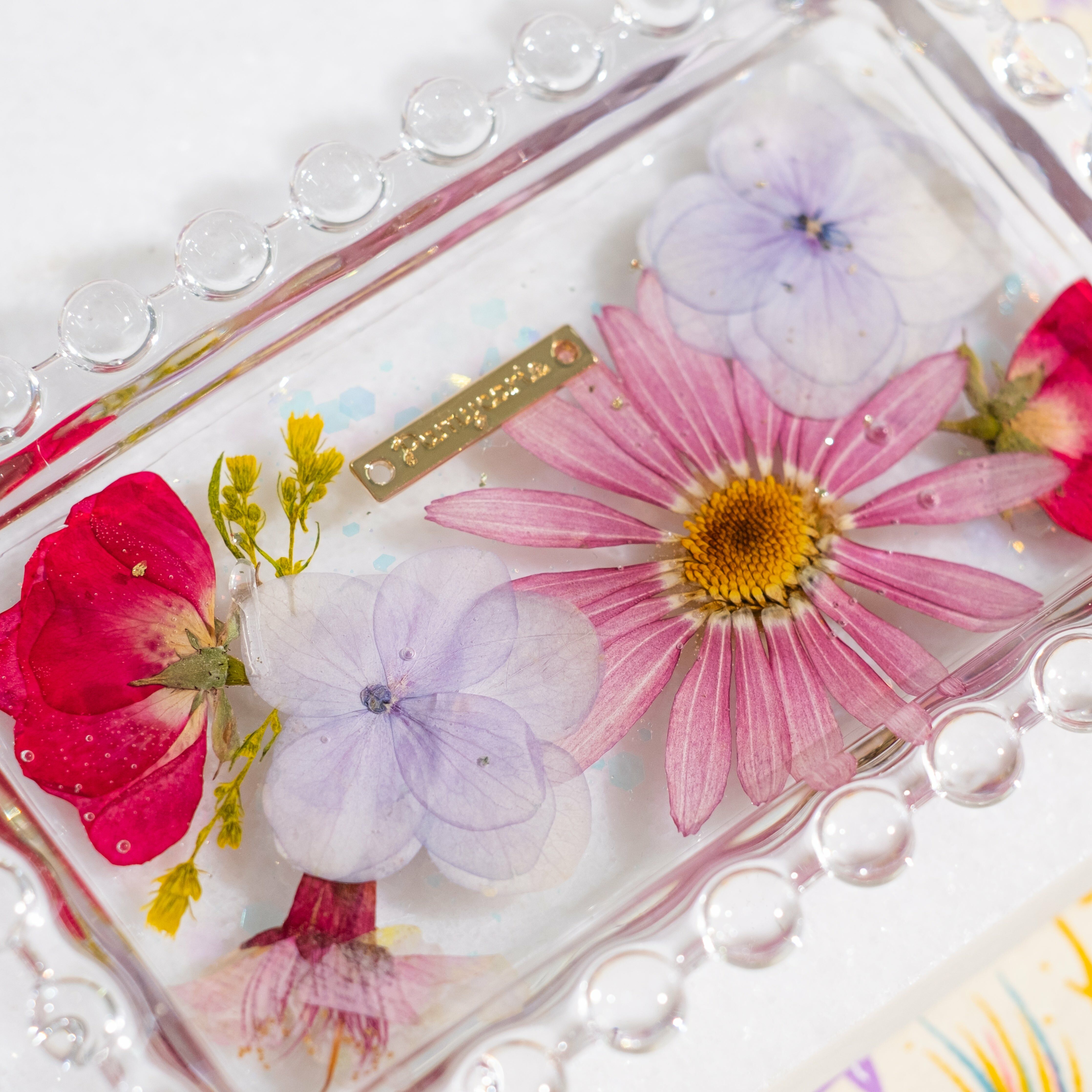 Perfect size for daily accessories. Preserved real flowers in a clear resin design are elegant enough in their own right.