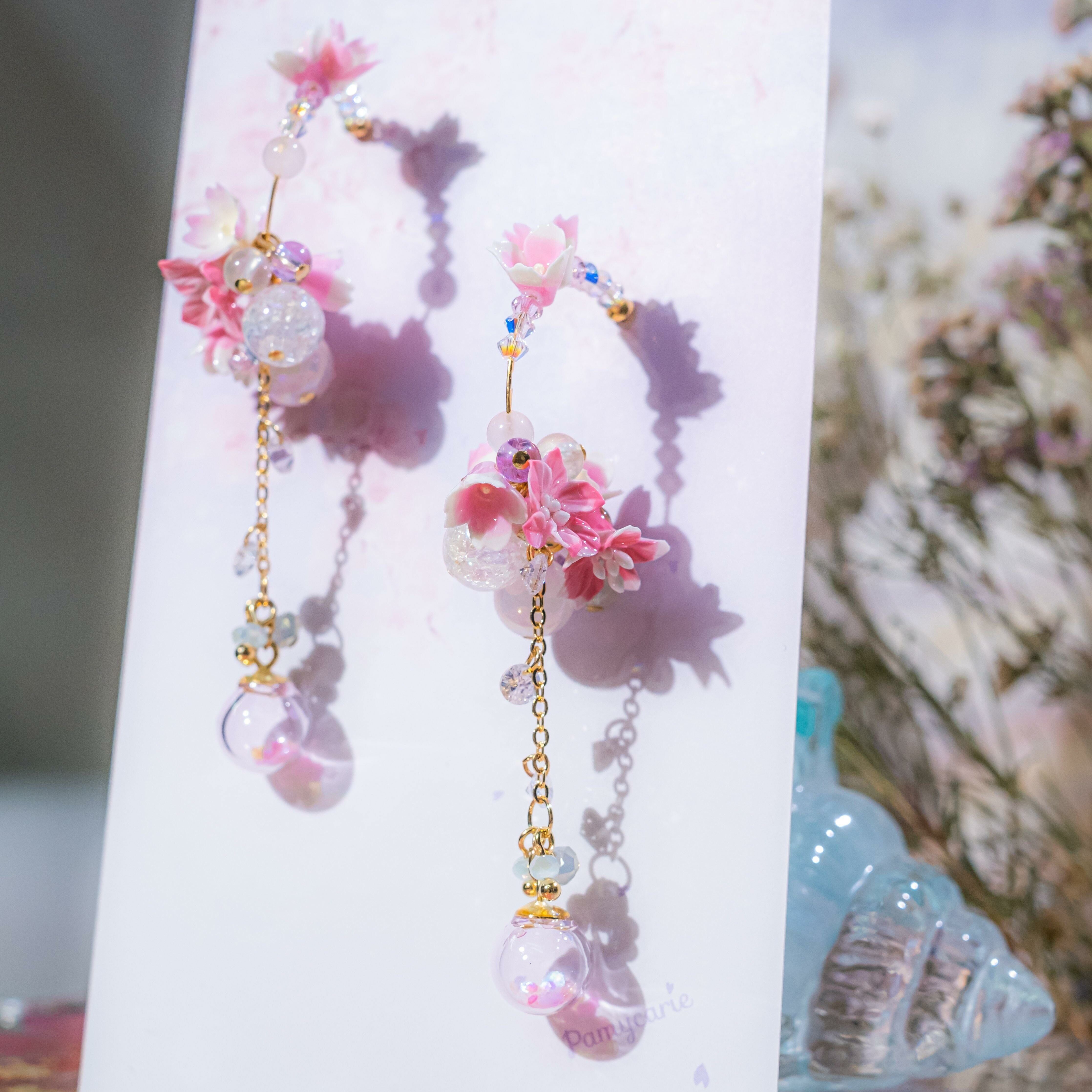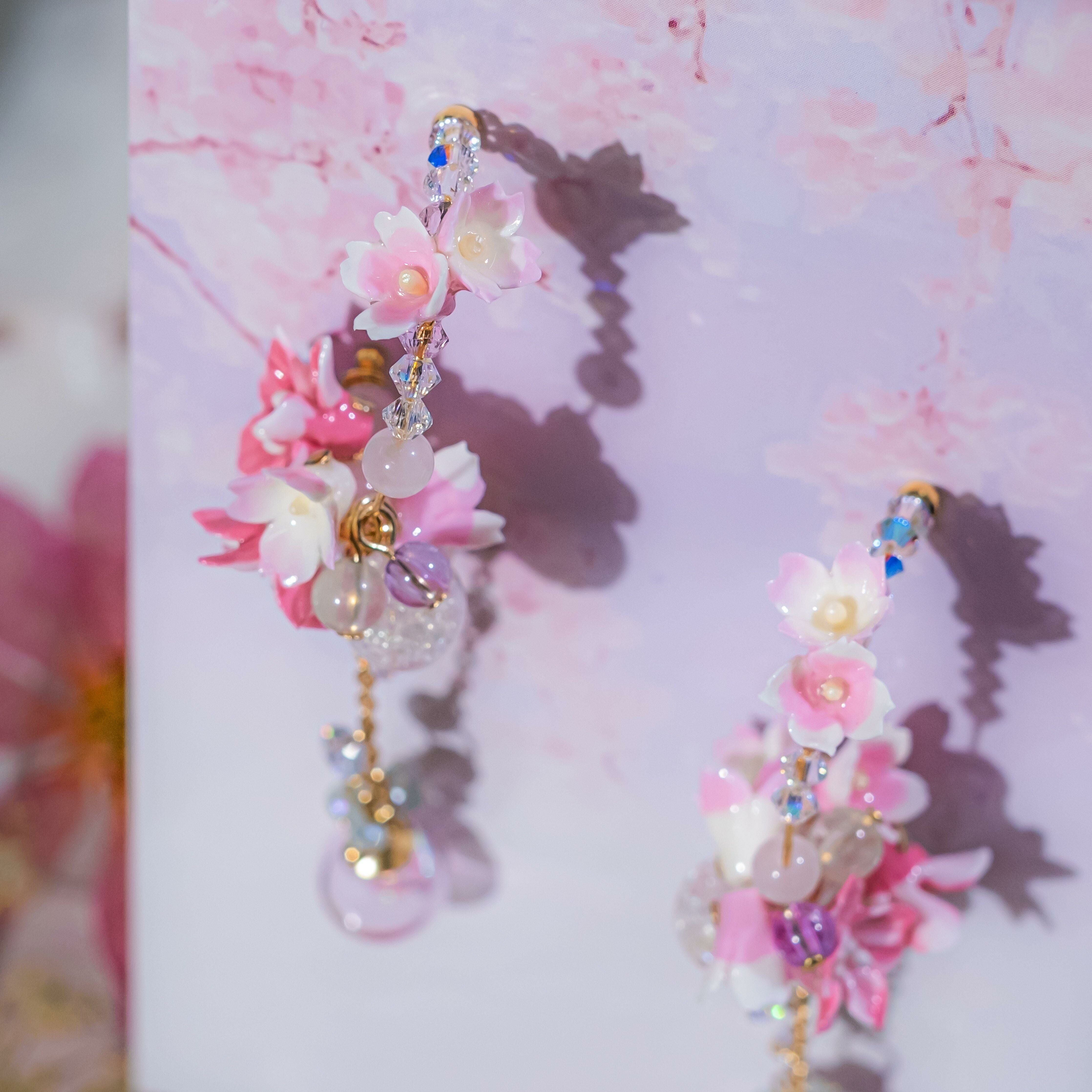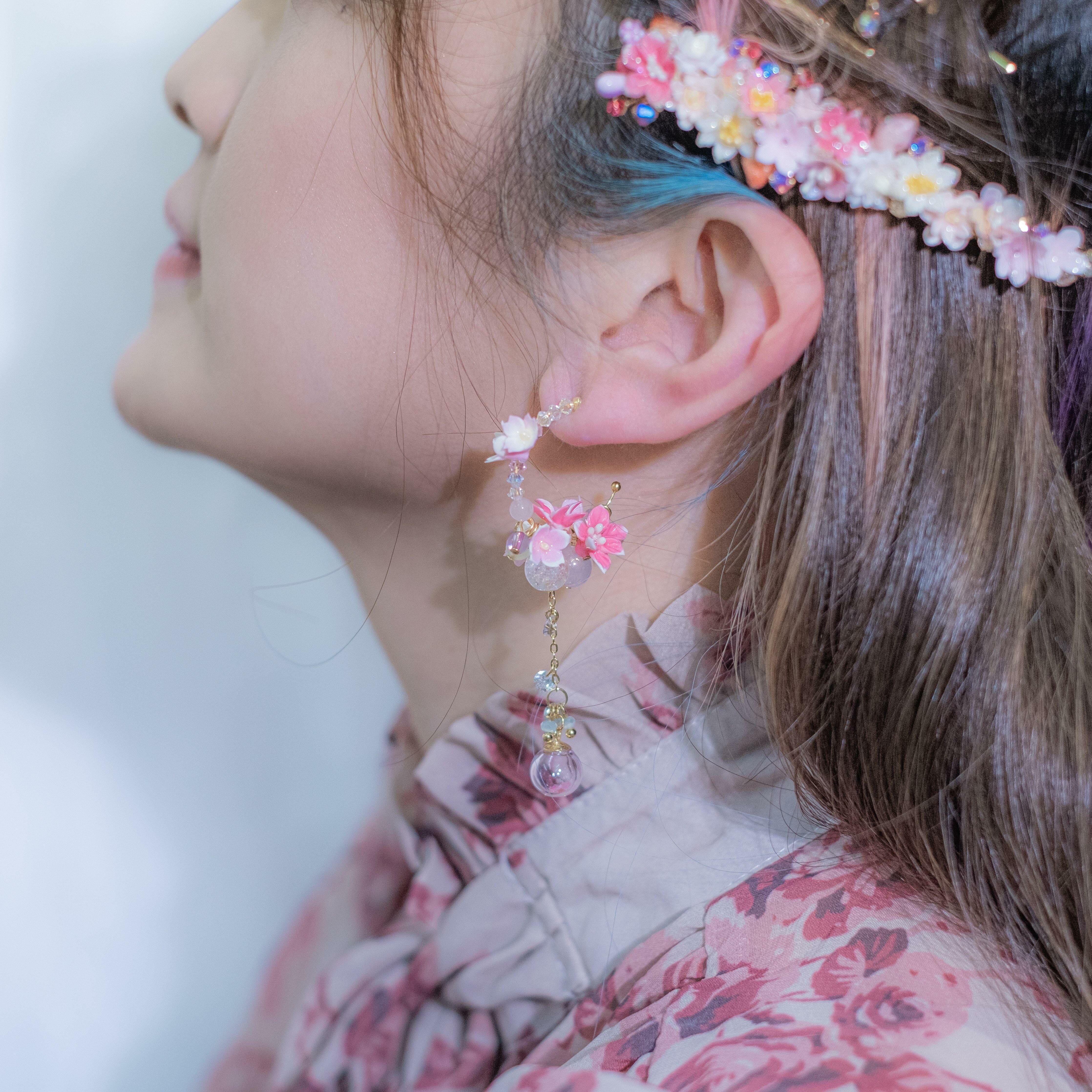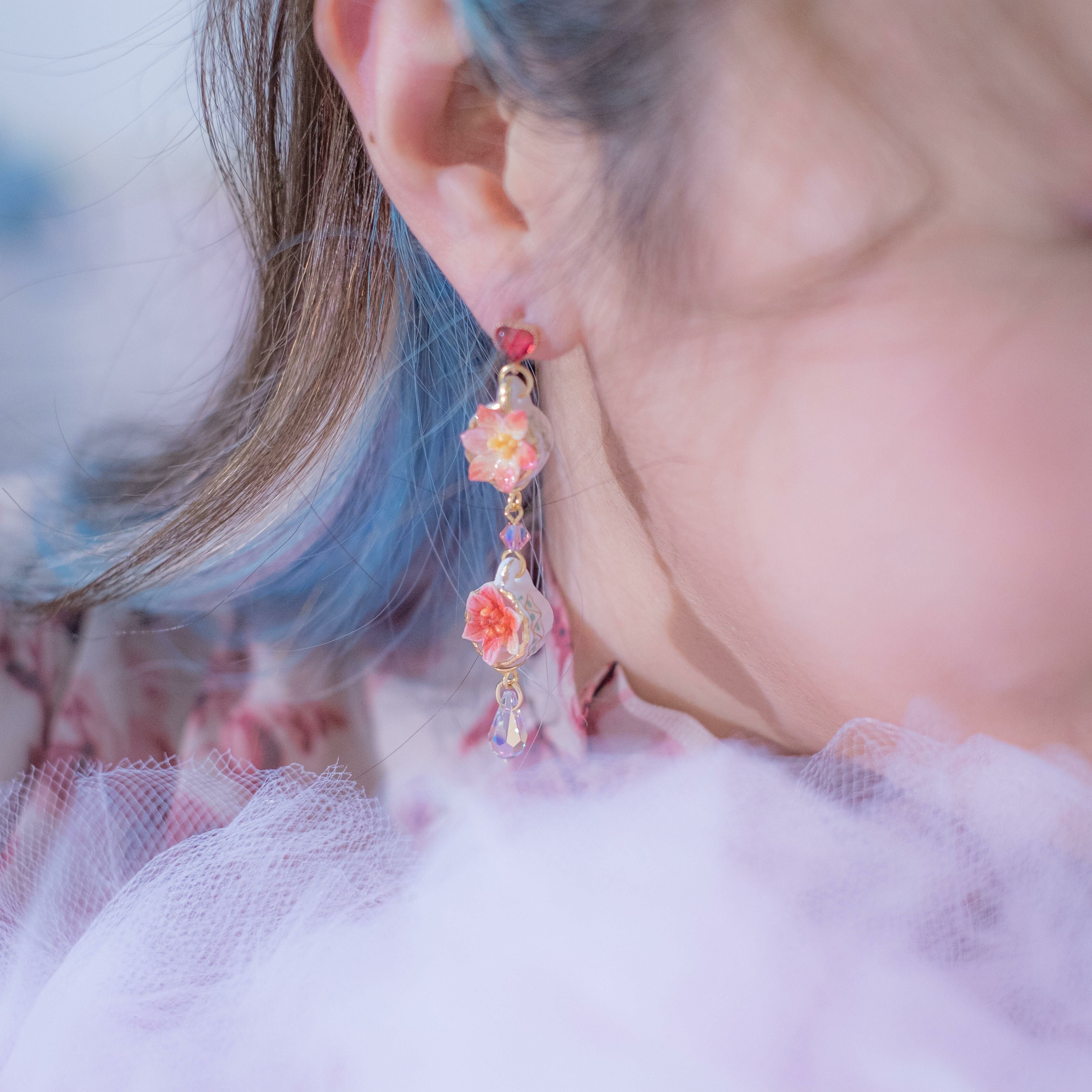 鍍金線 | 施華洛世奇水晶 | 手製樹脂黏土花 | UV膠強化保護層 | 鍍金925純銀耳釘