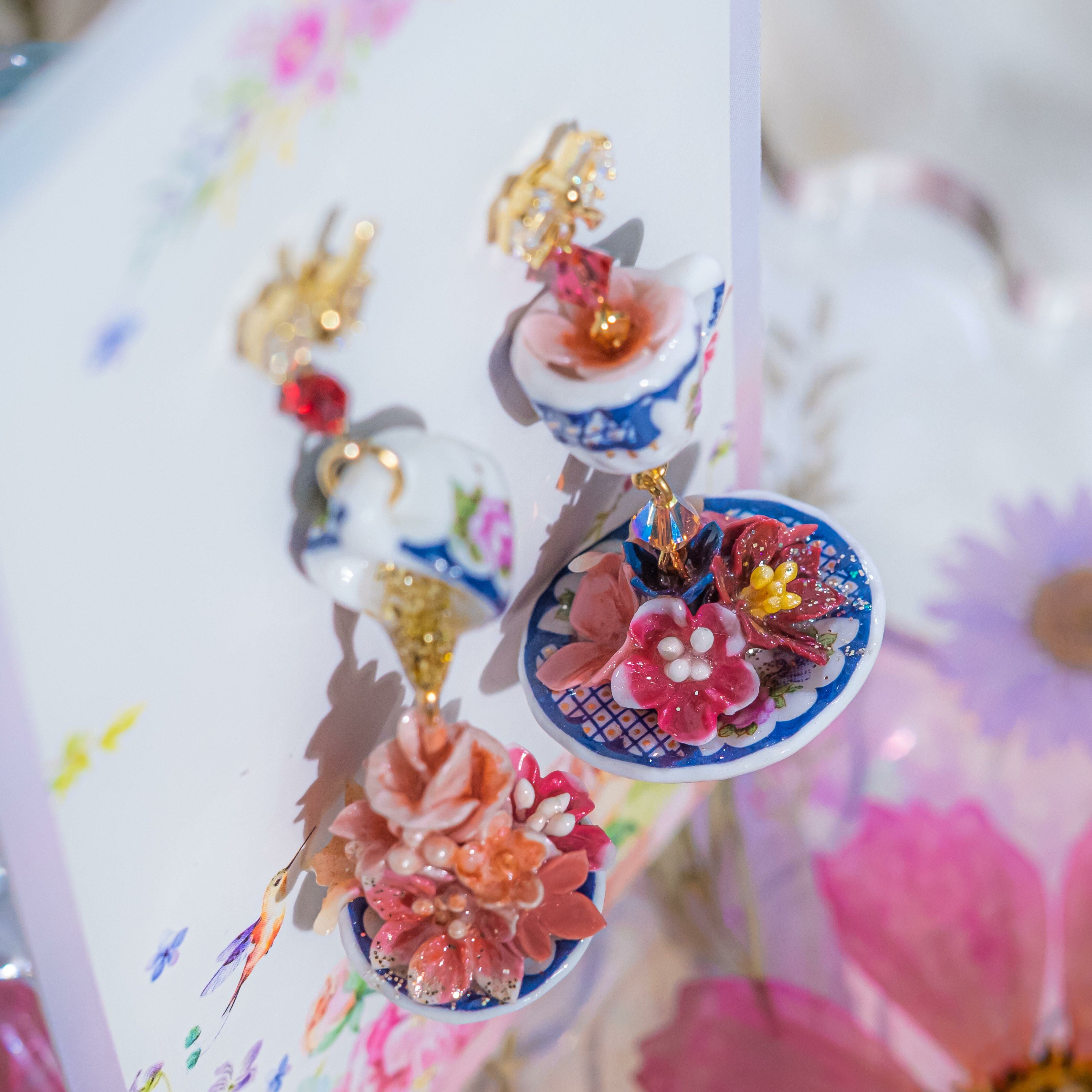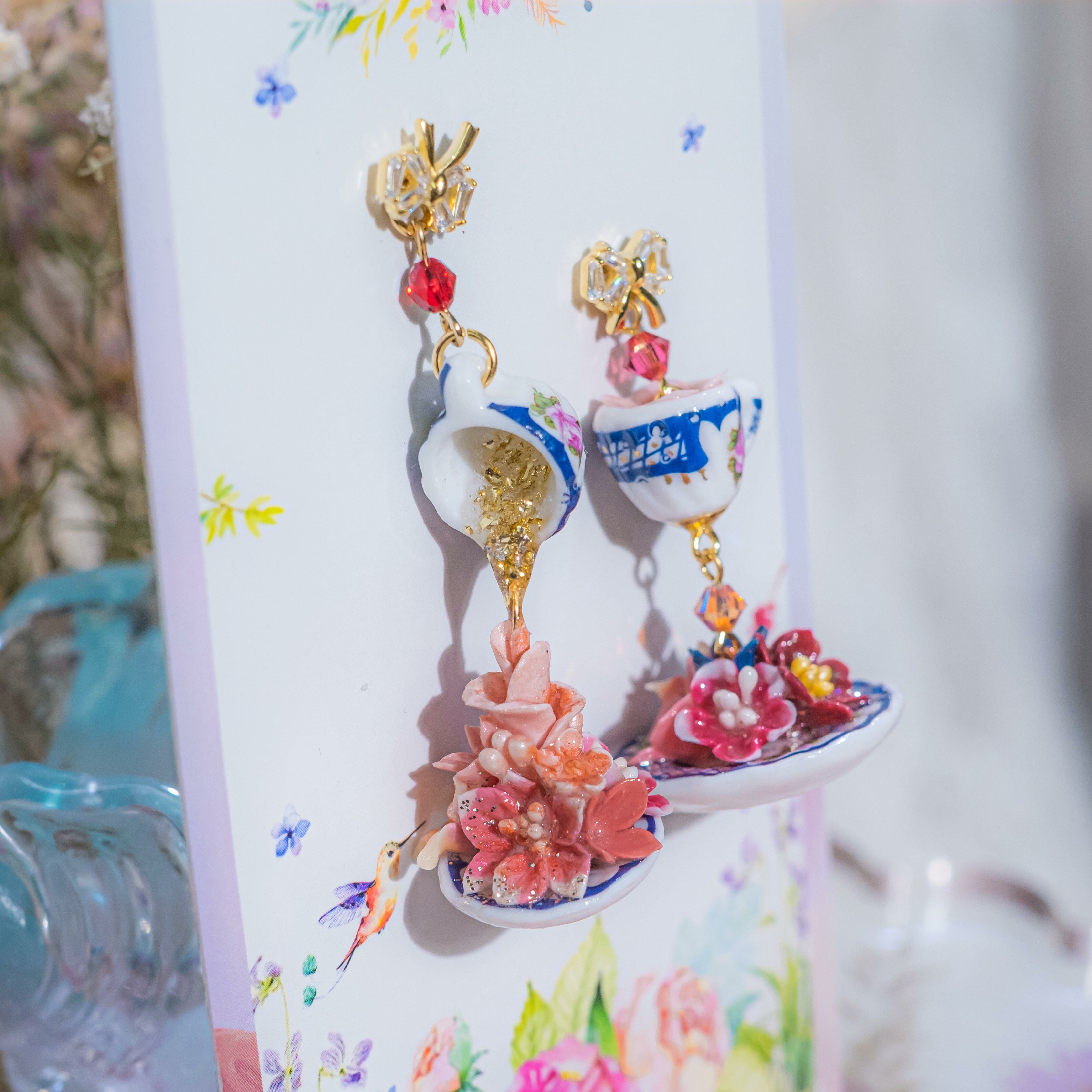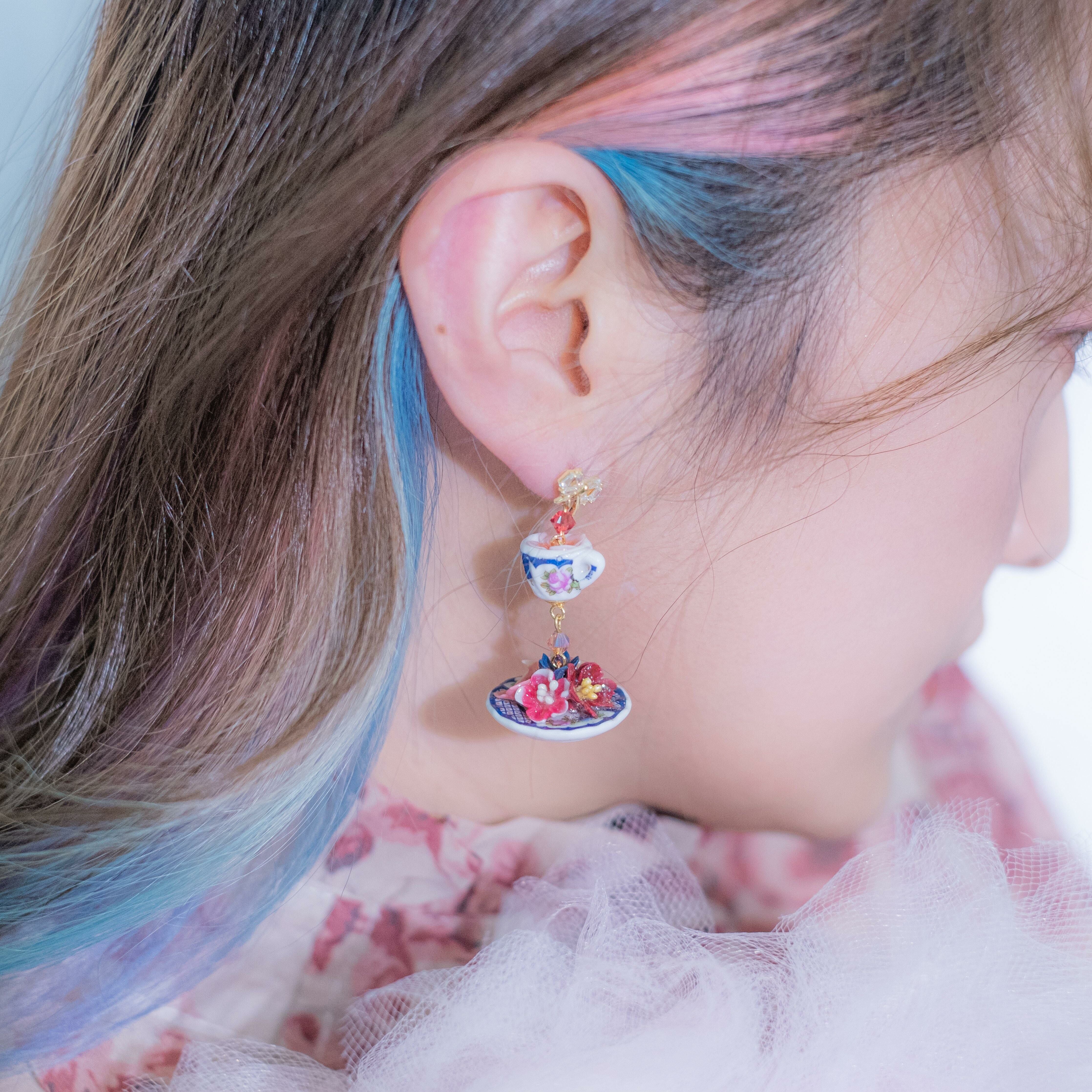 6 ❅ 寶藍棗紅聖誕花茶杯S925鍍金耳環(2-way)