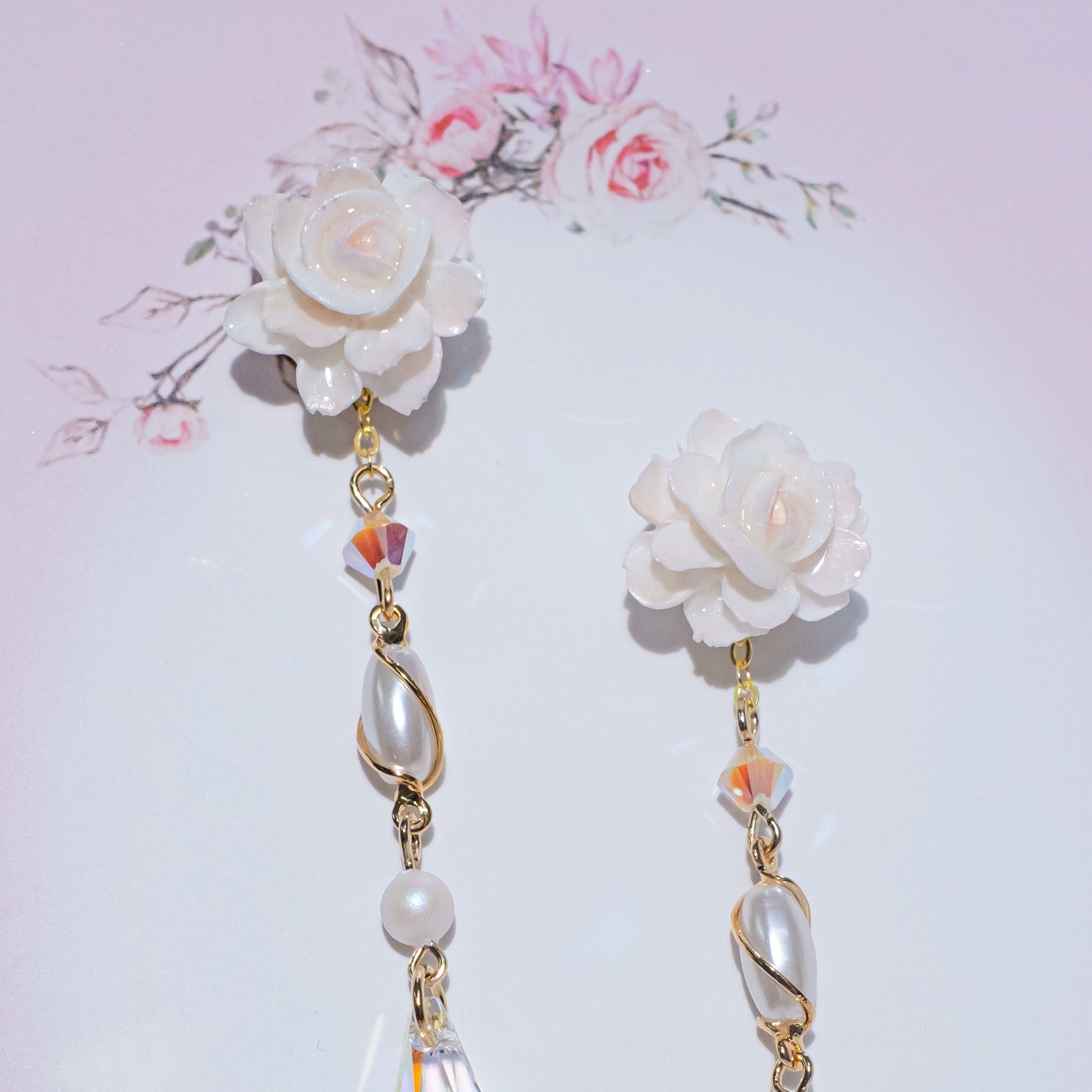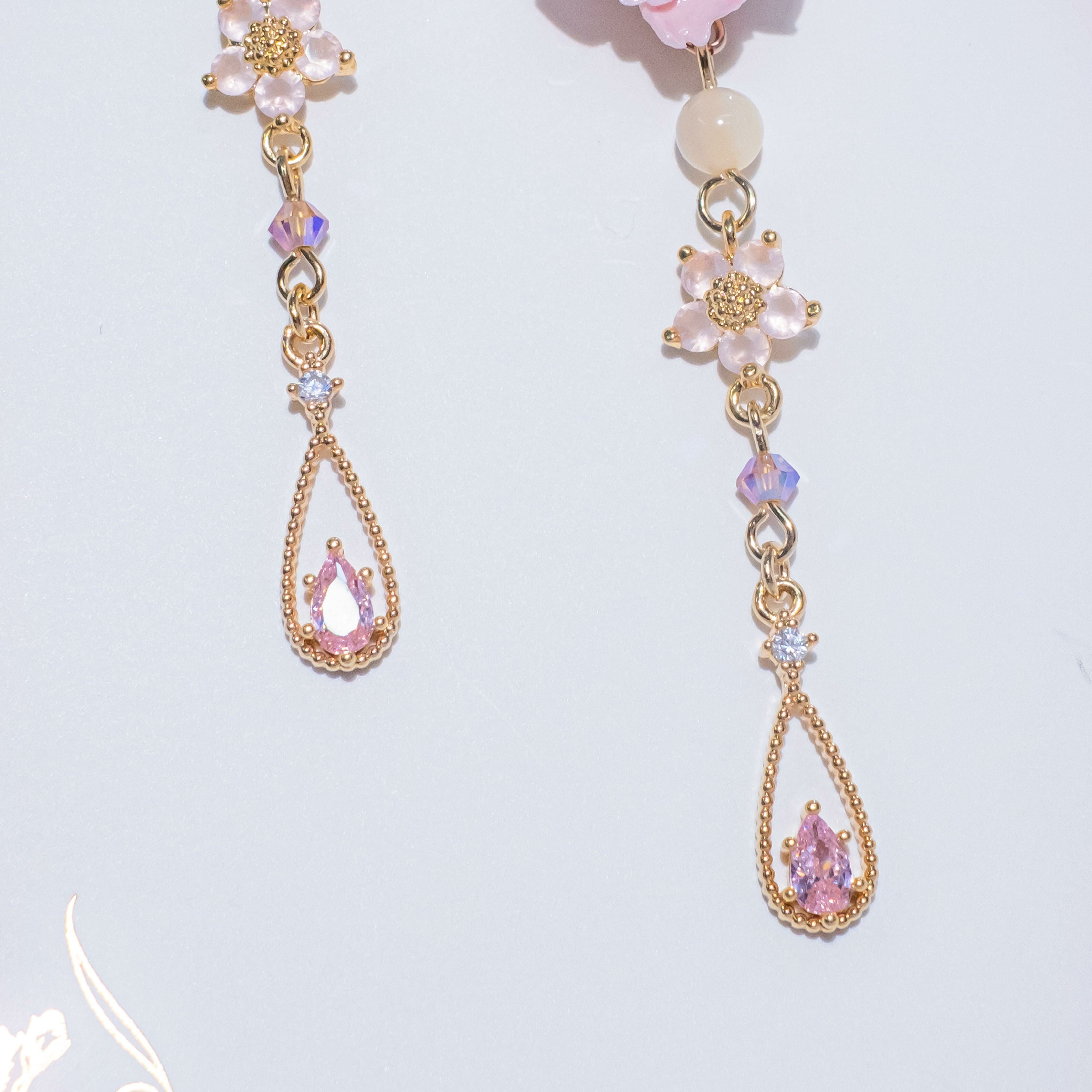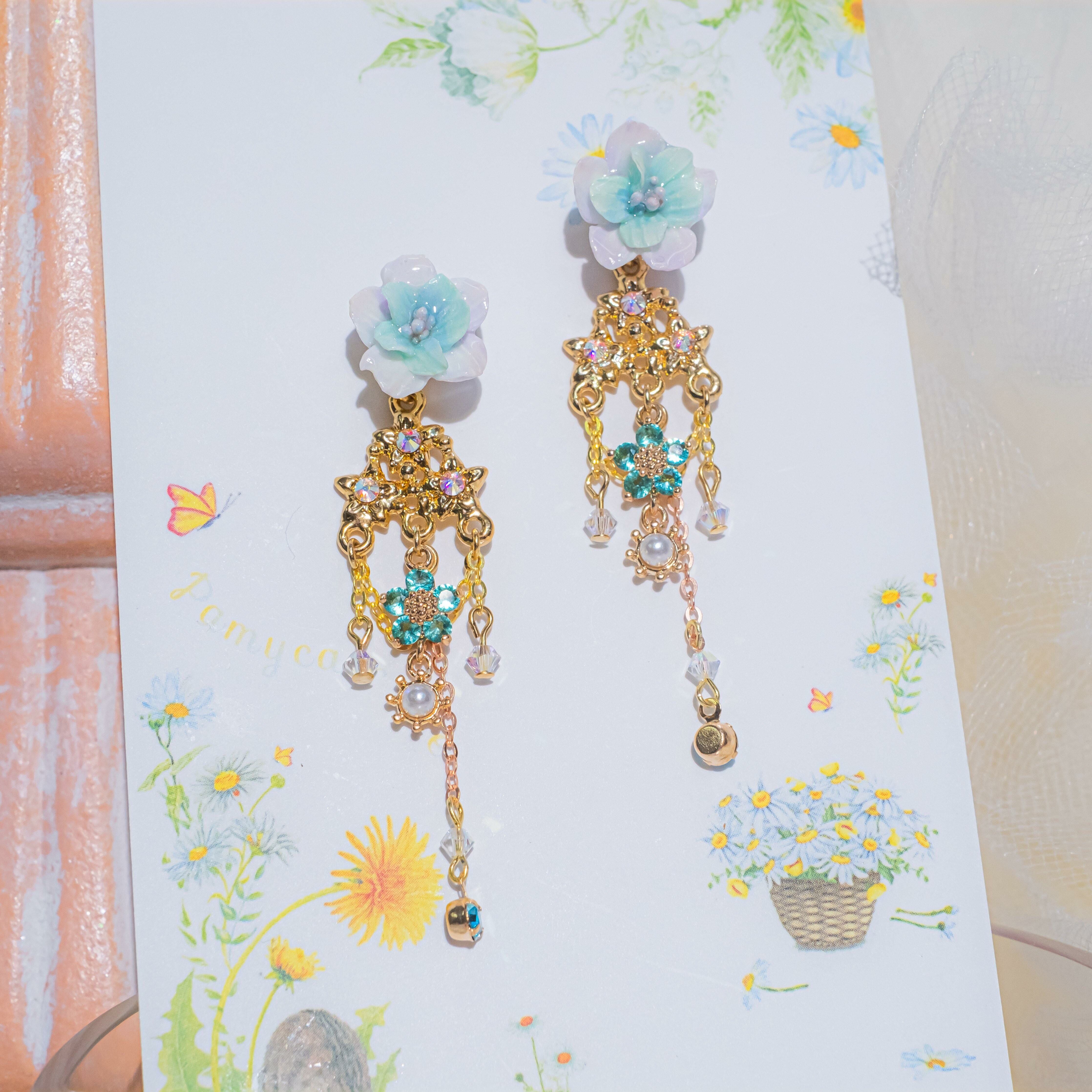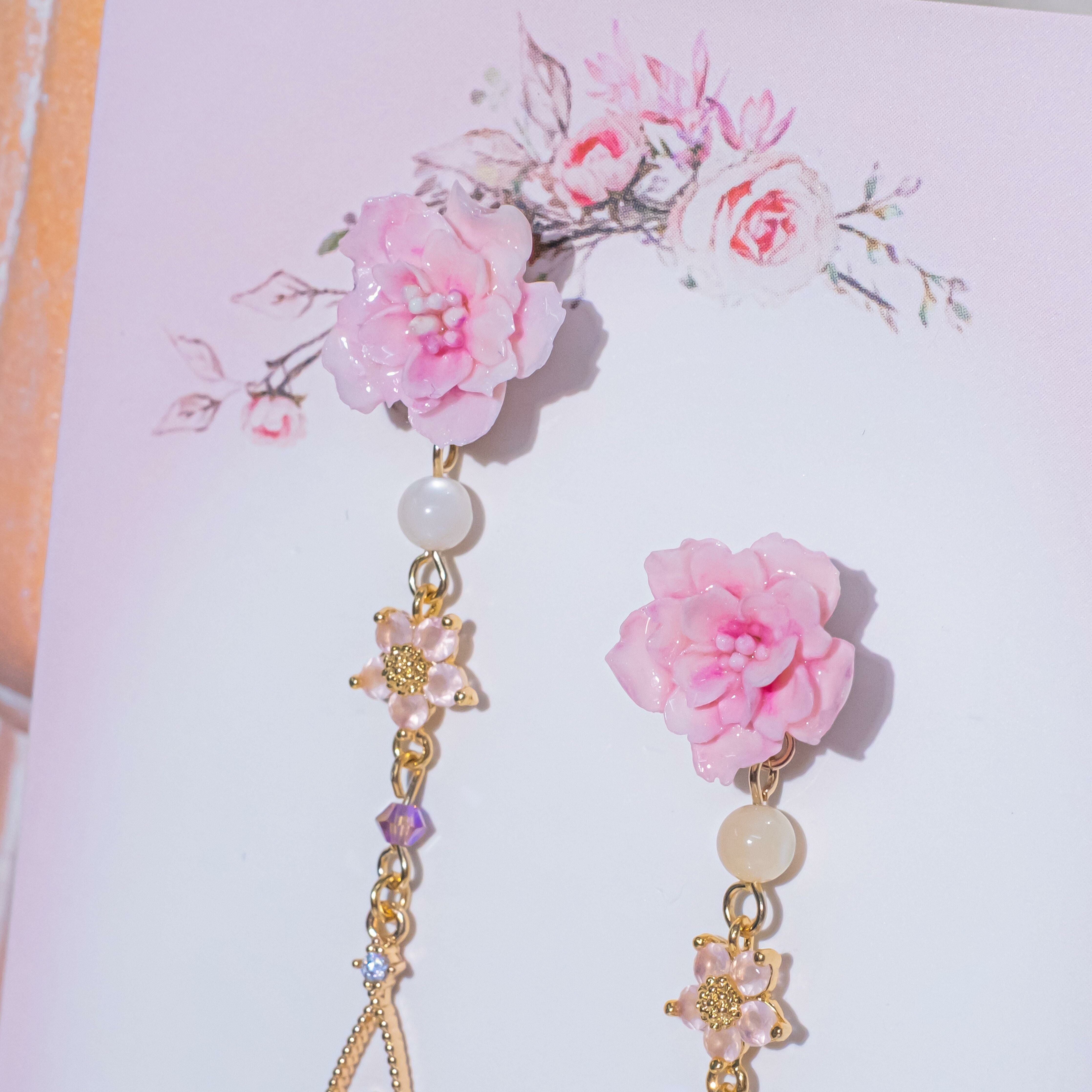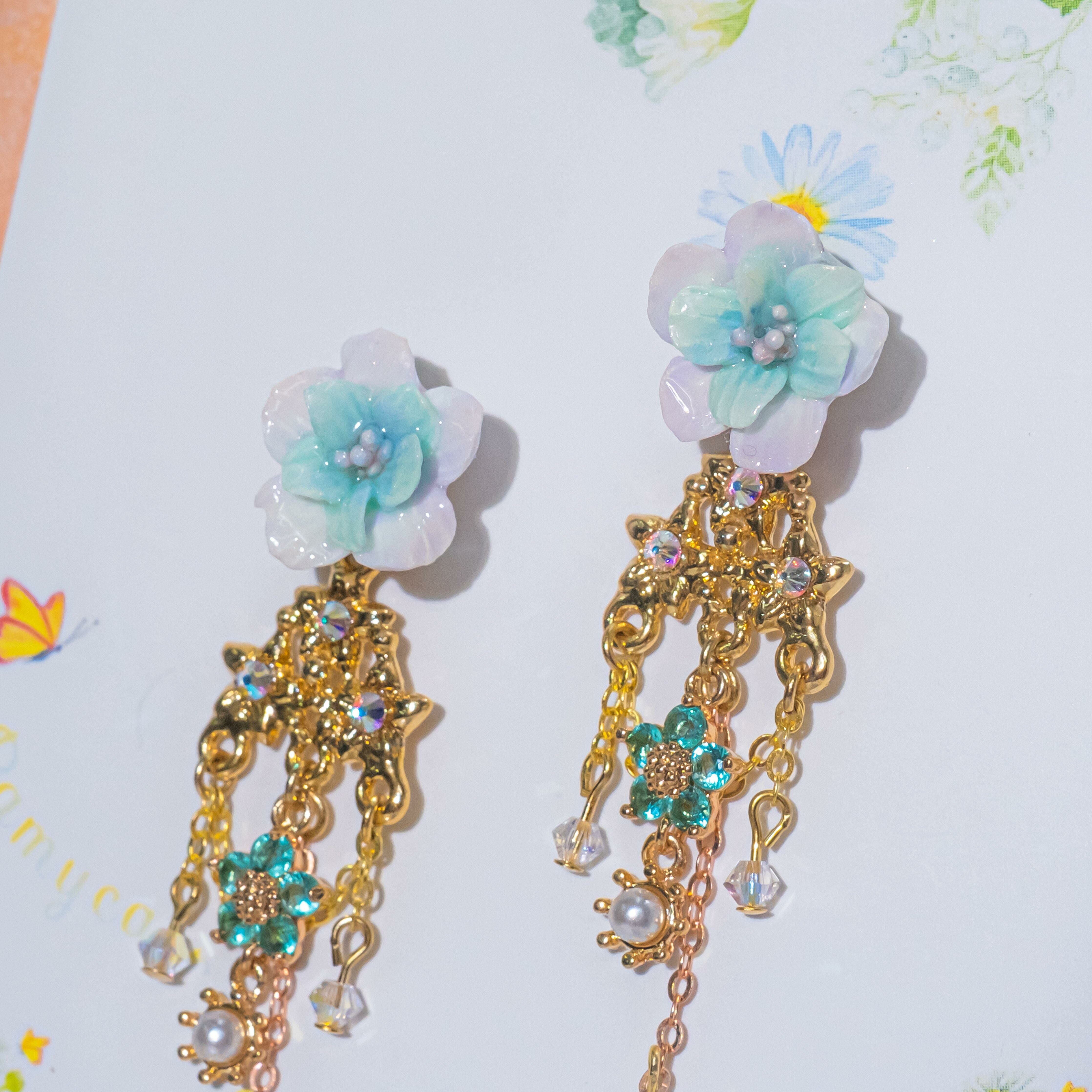 鍍金線 | 施華洛世奇水晶 | 手製樹脂黏土花 | UV膠強化保護層 | 鍍金925純銀耳釘