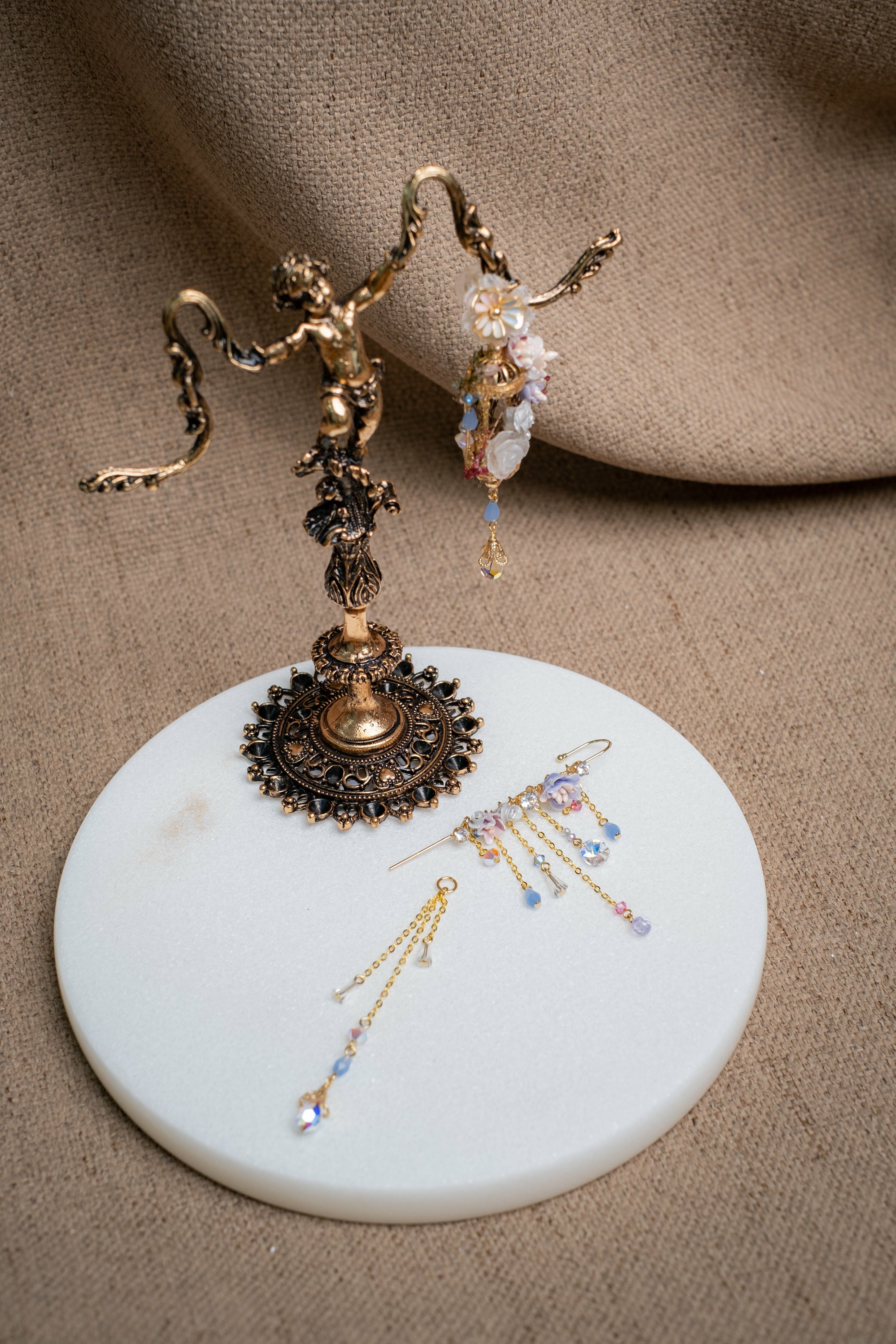鍍14K金S925耳針 | 施華洛世奇水晶 | 手製樹脂黏土花朵 | 強化樹脂保護層