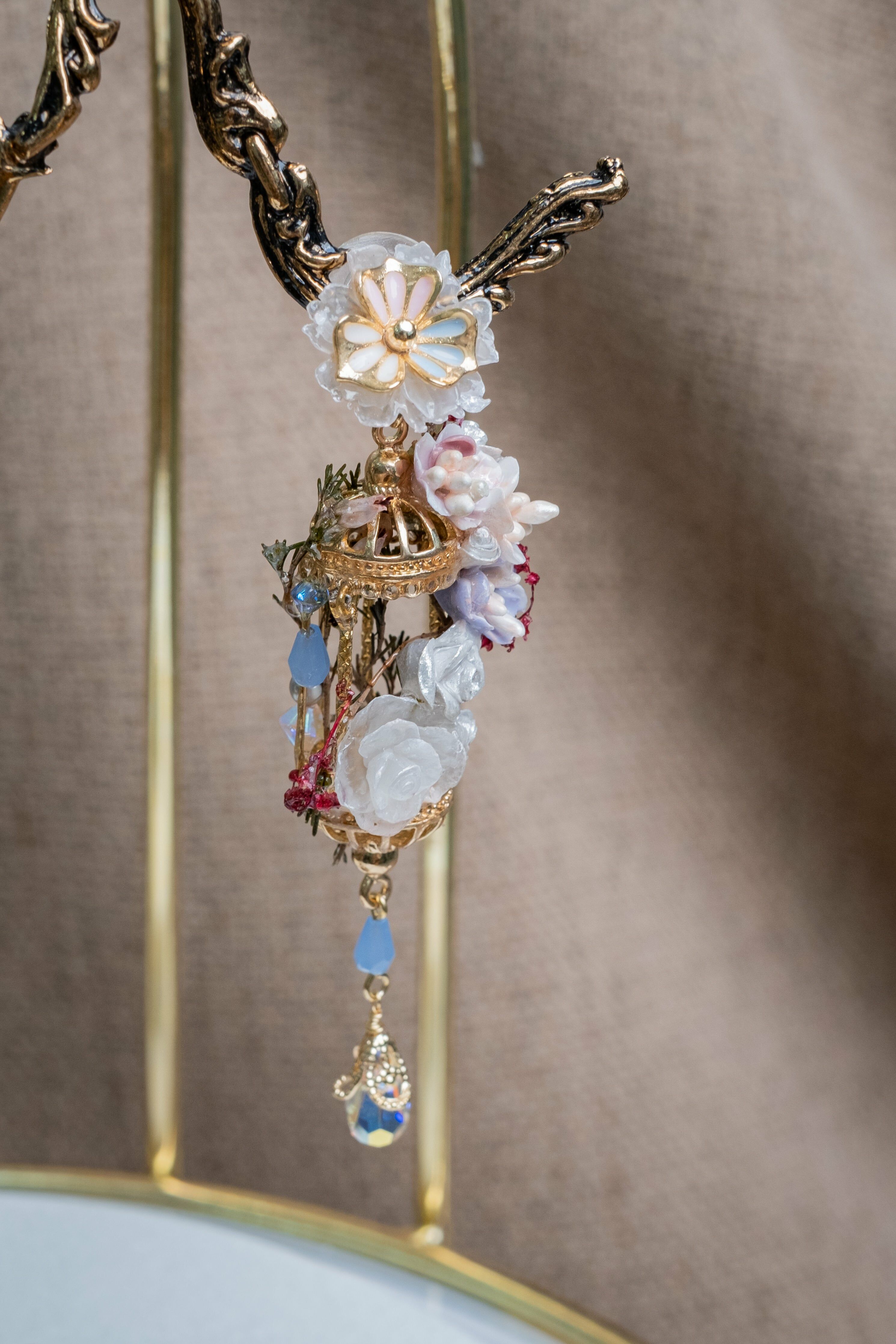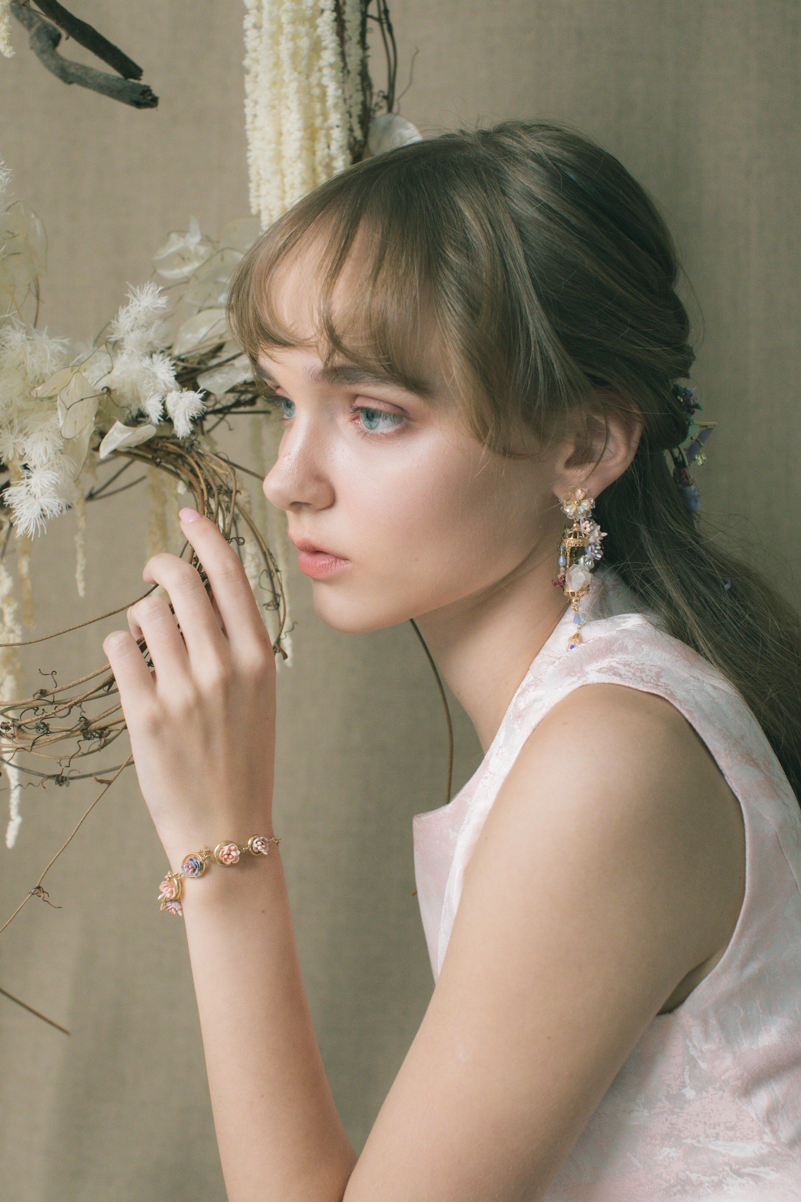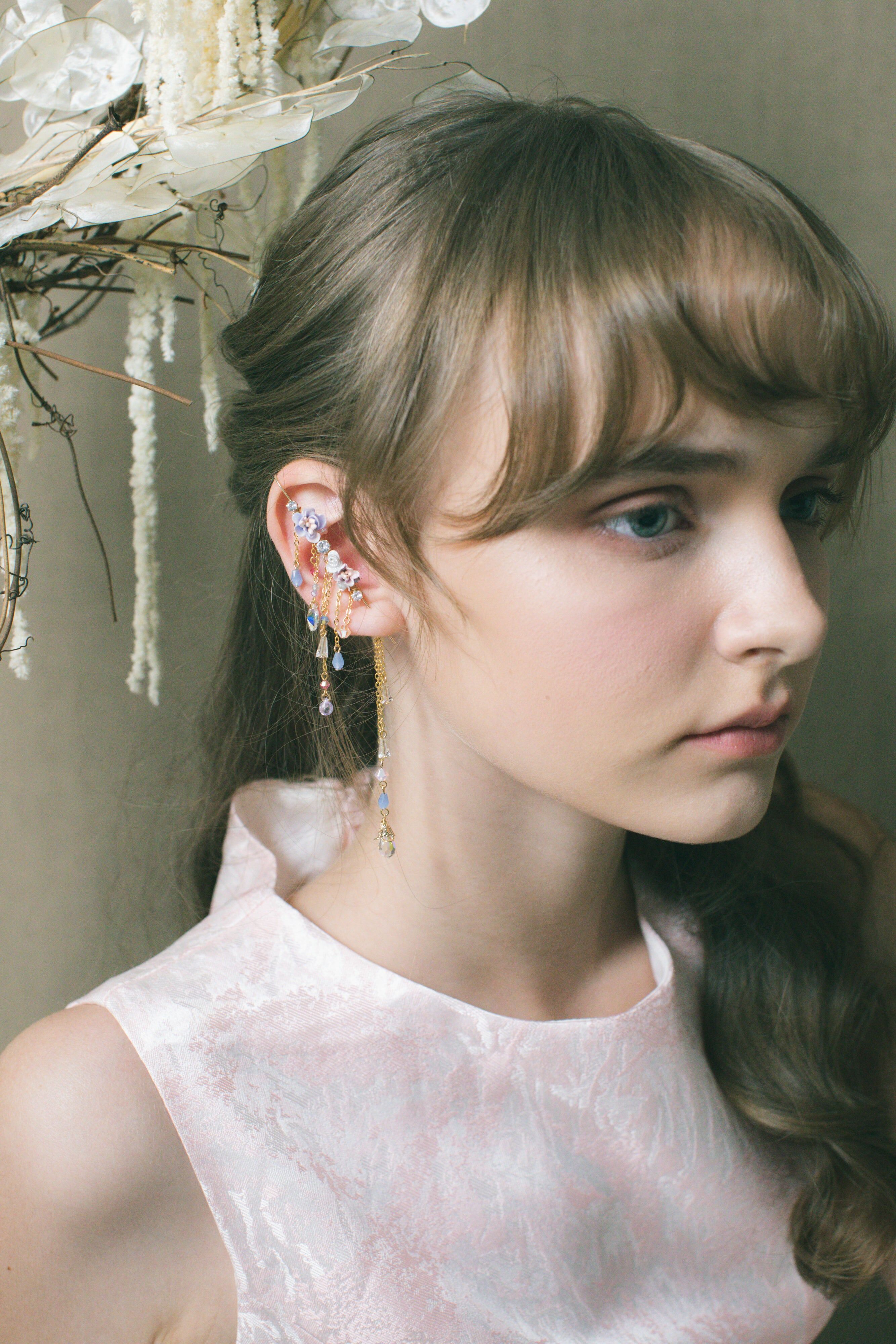 突破 “一對耳環”的框架,就如我們嘗試掙脫心的牢籠一樣,不對稱的設計正要流行。垂簾設計的針式耳環有著滿滿的華麗感,並附有一組可拆式的飾鍊;而大熱的金屬鳥籠設計則揉合了黏土花藝與乾燥植物,配上首次登場的透明玫瑰,充滿復古感覺。
