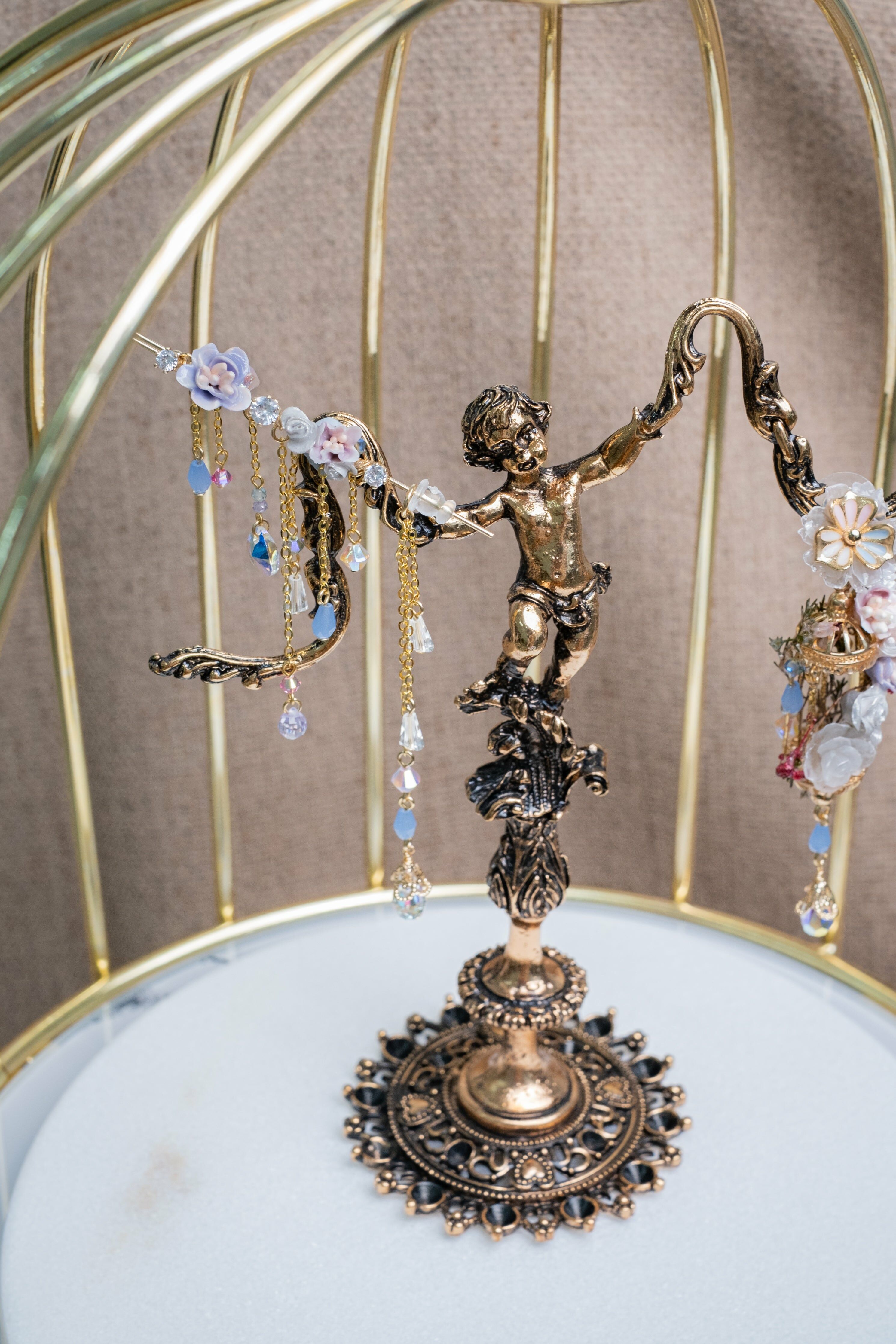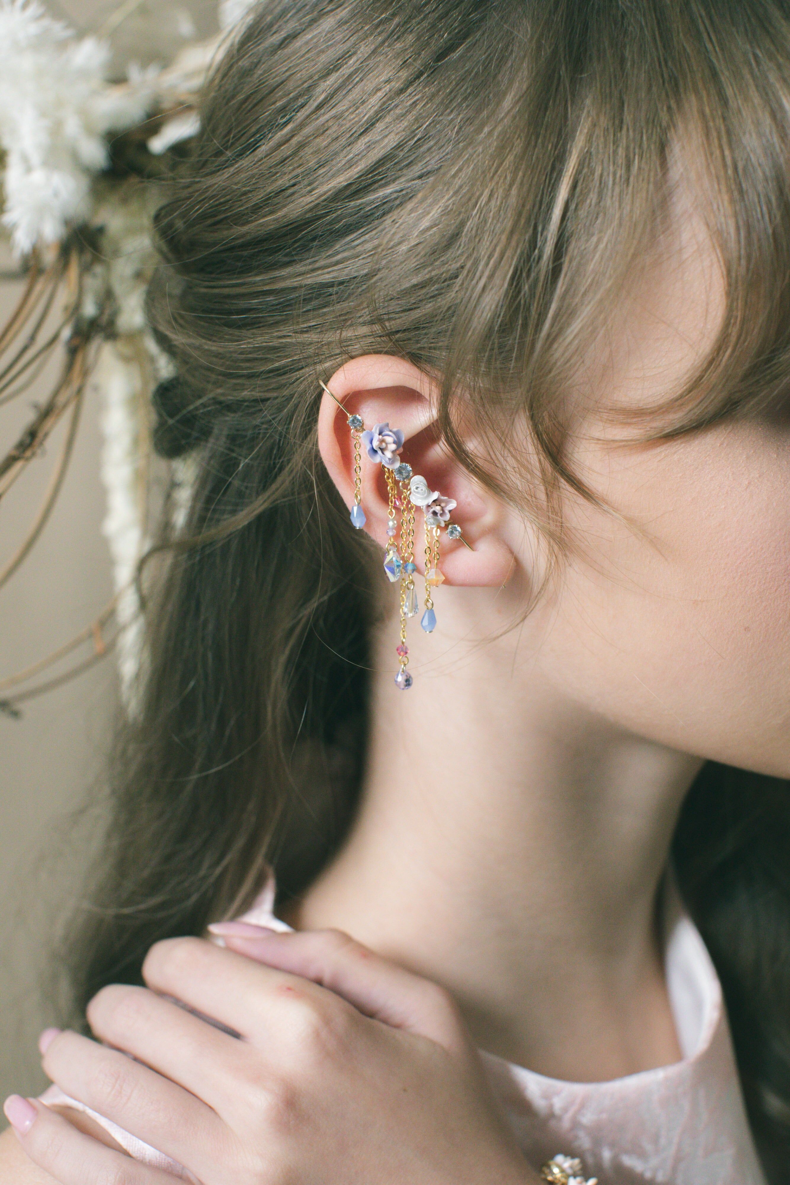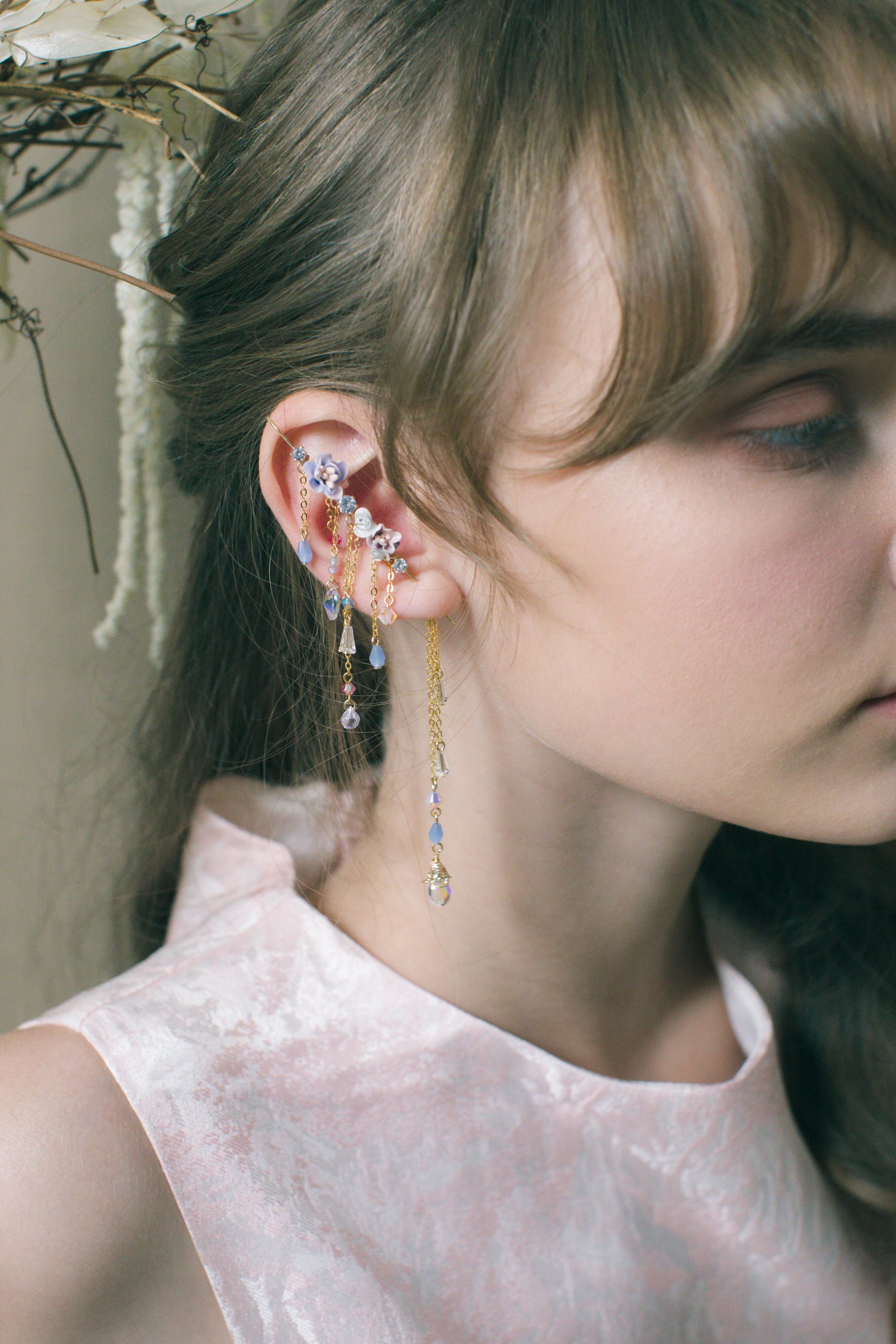 突破 “一對耳環”的框架,就如我們嘗試掙脫心的牢籠一樣,不對稱的設計正要流行。垂簾設計的針式耳環有著滿滿的華麗感,並附有一組可拆式的飾鍊;而大熱的金屬鳥籠設計則揉合了黏土花藝與乾燥植物,配上首次登場的透明玫瑰,充滿復古感覺。