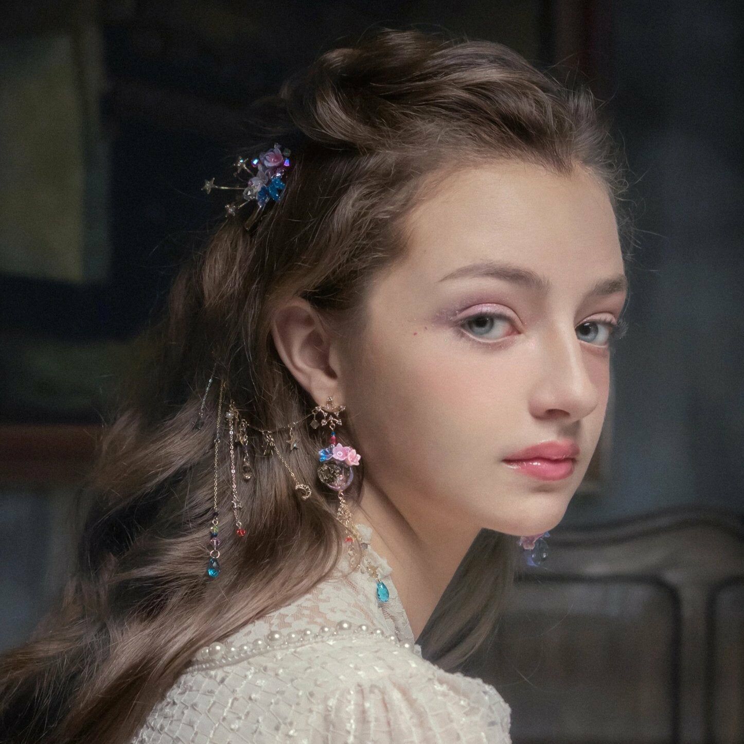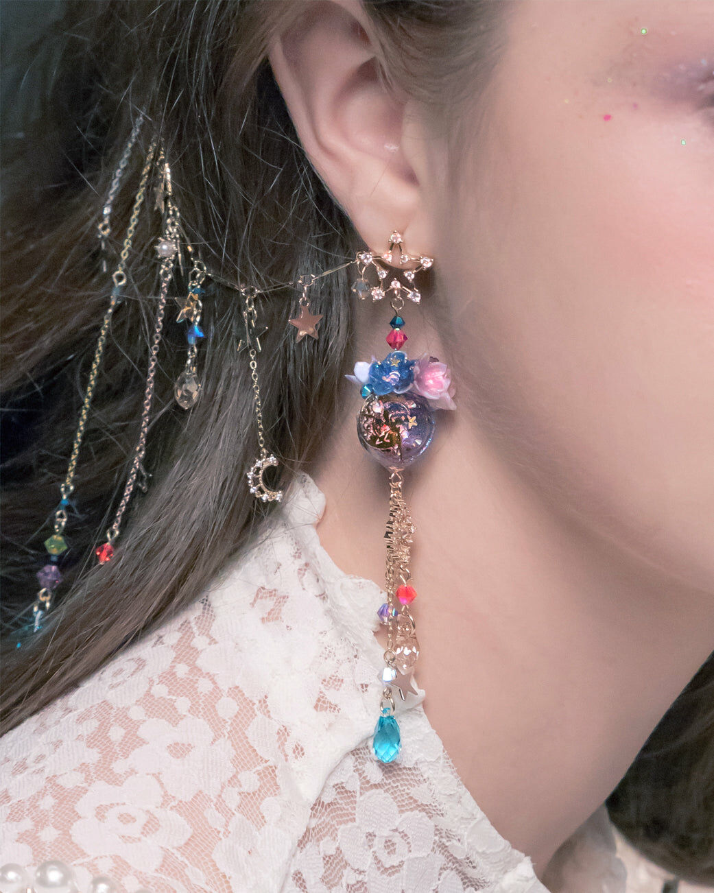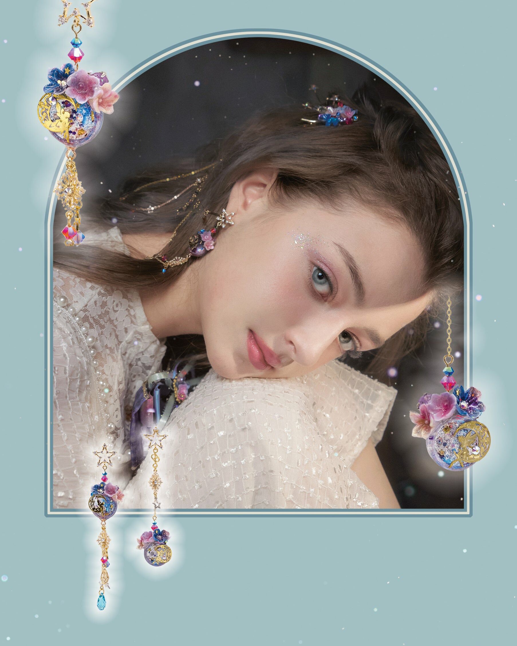 鍍金銀線 | 施華洛世奇水晶 | 人手渲染玻璃球 | 手製樹脂黏土花 | 幻彩樹脂膠 | UV膠強化保護層 | 鍍14K金925純銀耳釘