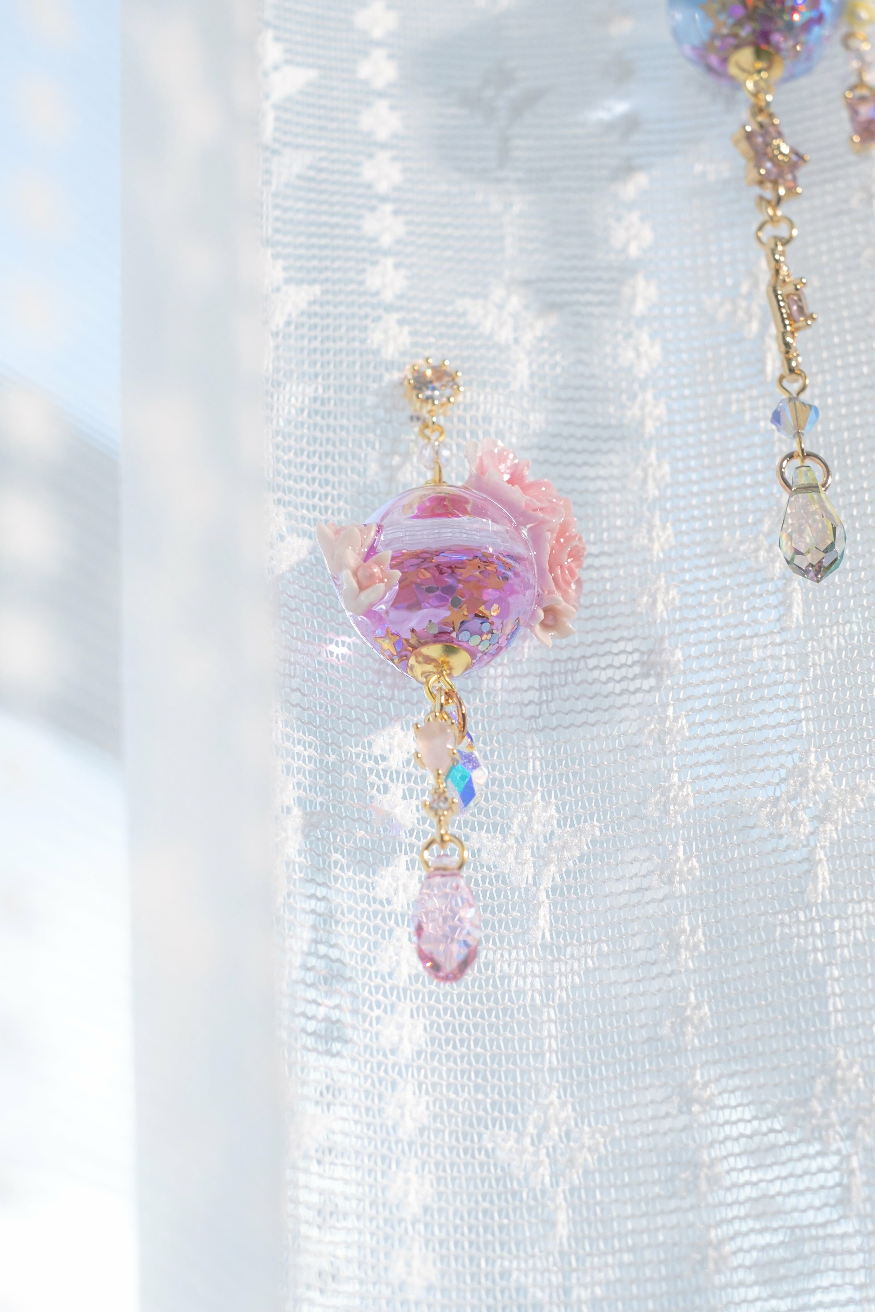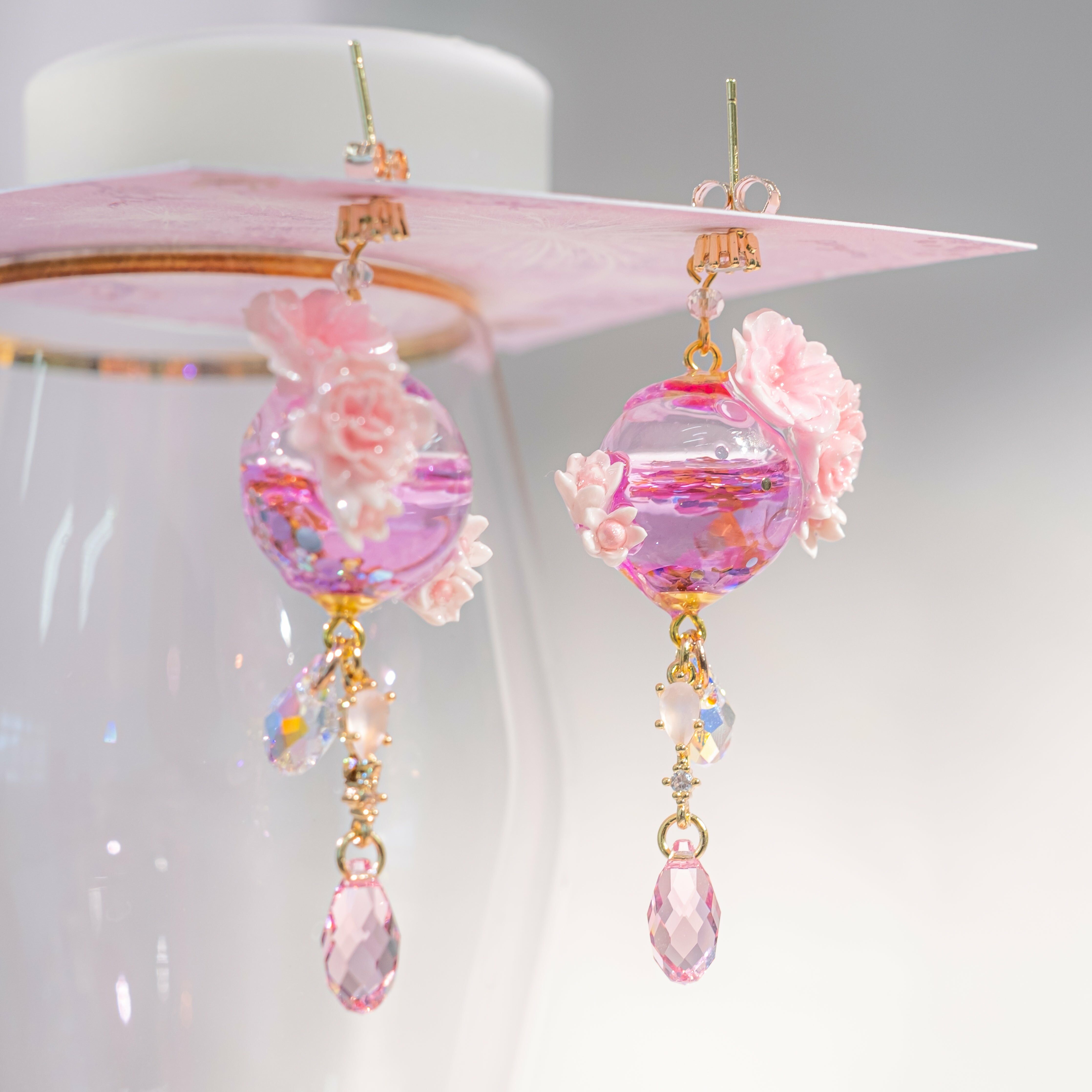 鍍金線 | 施華洛世奇水晶 | 手製樹脂黏土花 | UV膠強化保護層 | 鍍金925純銀耳釘