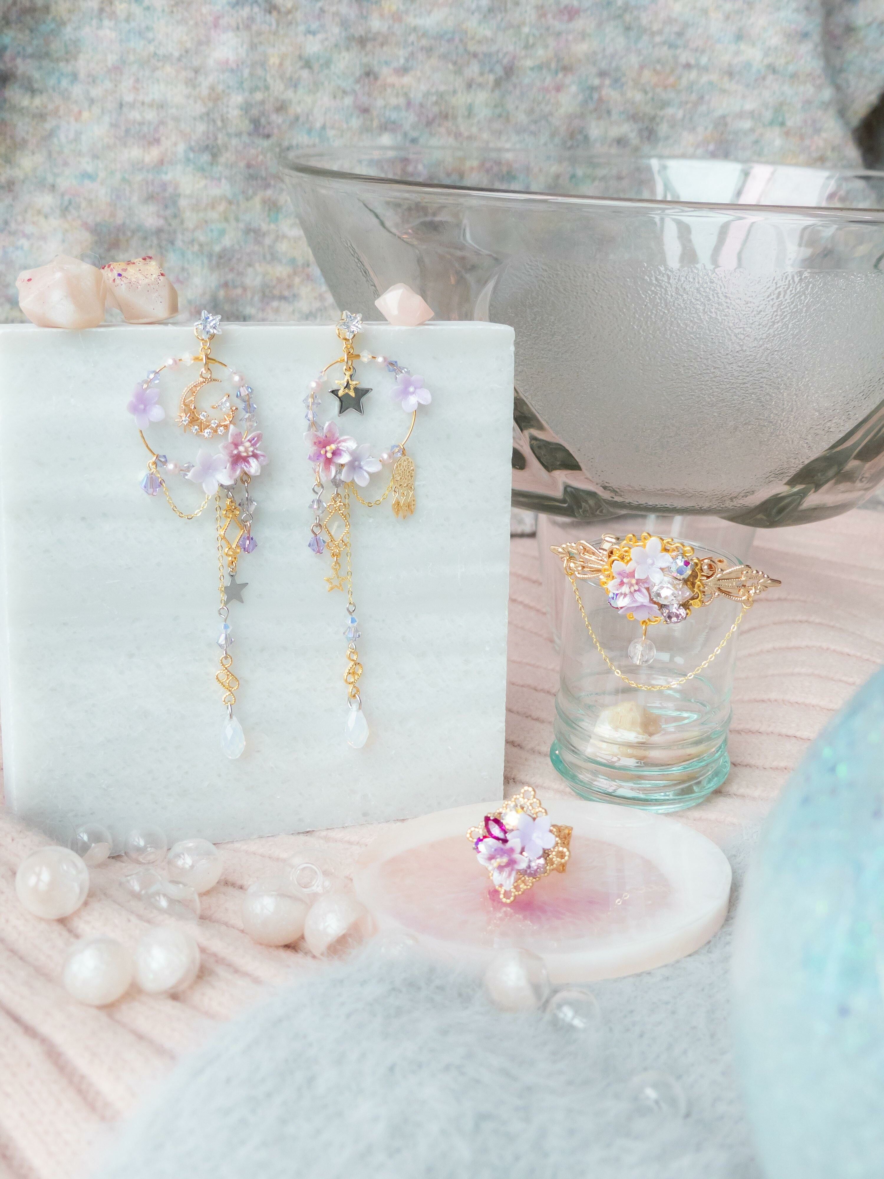 美國進口Beadsmith銀線 | 奧地利水晶 | 日本鋯石 | 天然紫水晶 | 手製樹脂黏土花| UV強化保護層 | 鍍14K金戒指