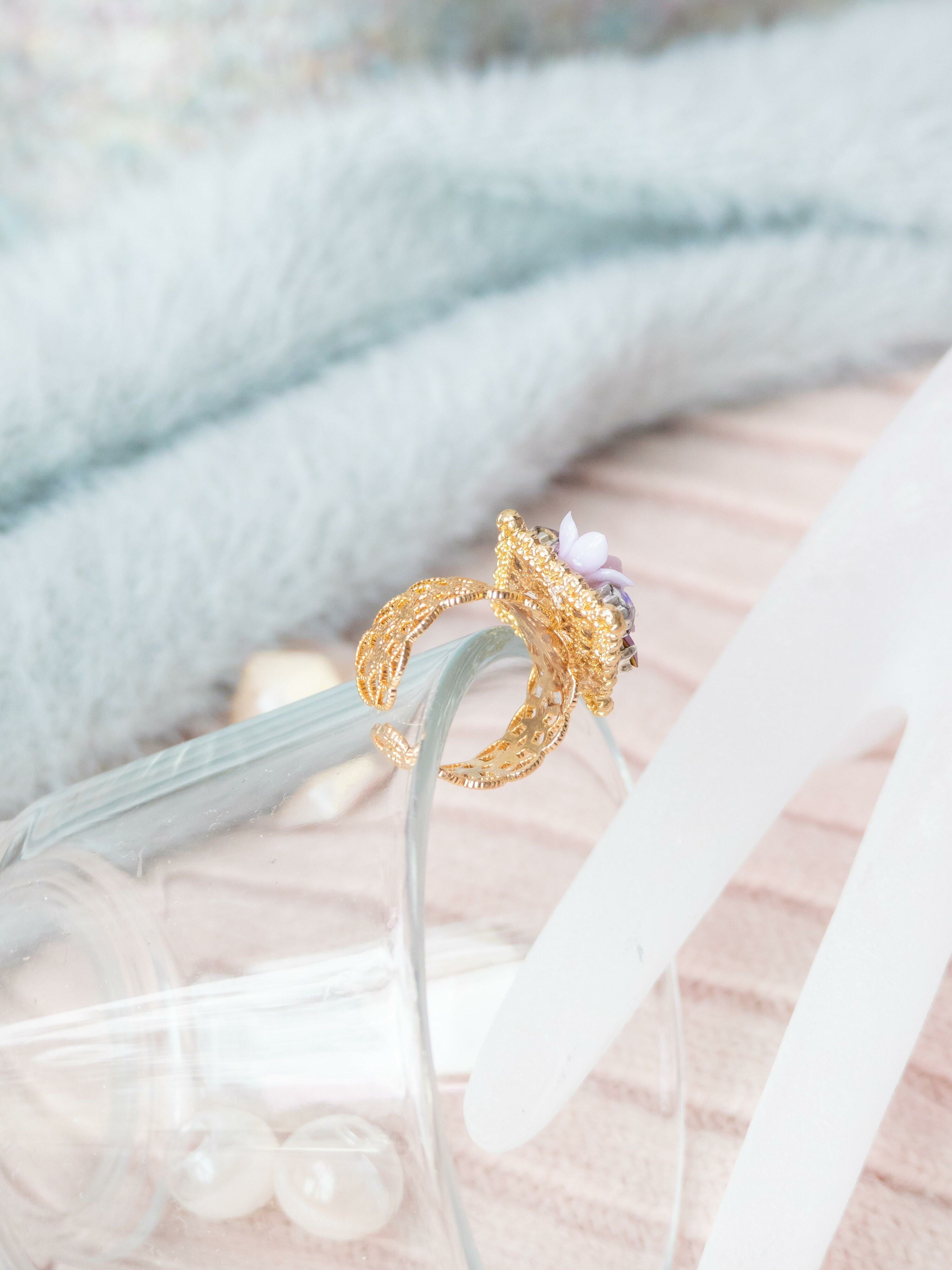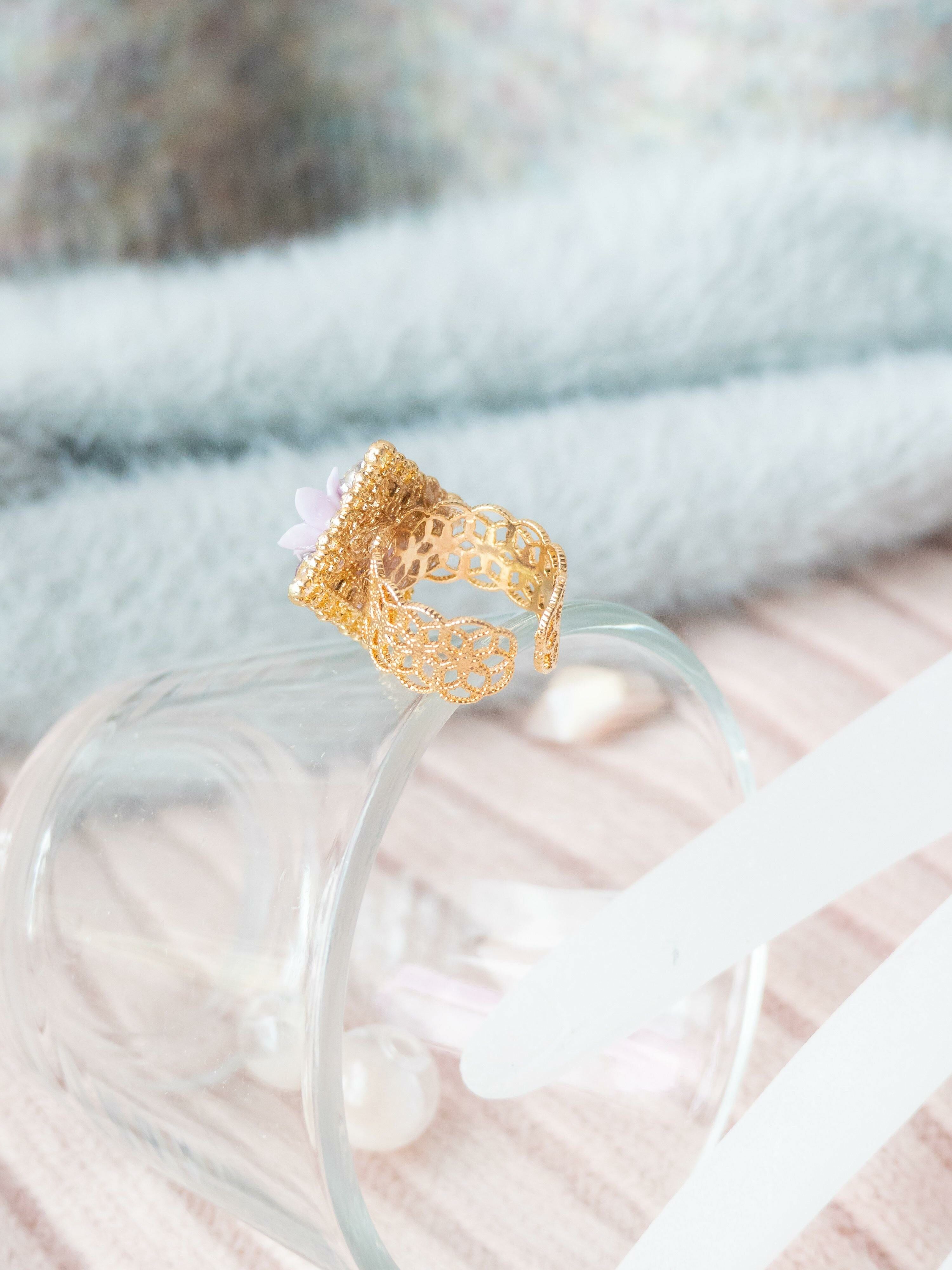 Gold Plated Artistic Wire | Austrian Crystal | Japanese CZ | Amethyst | Handcrafted Resin Clay Flowers | UV Hardening Coating | 14K Gold-plated Metal Ring