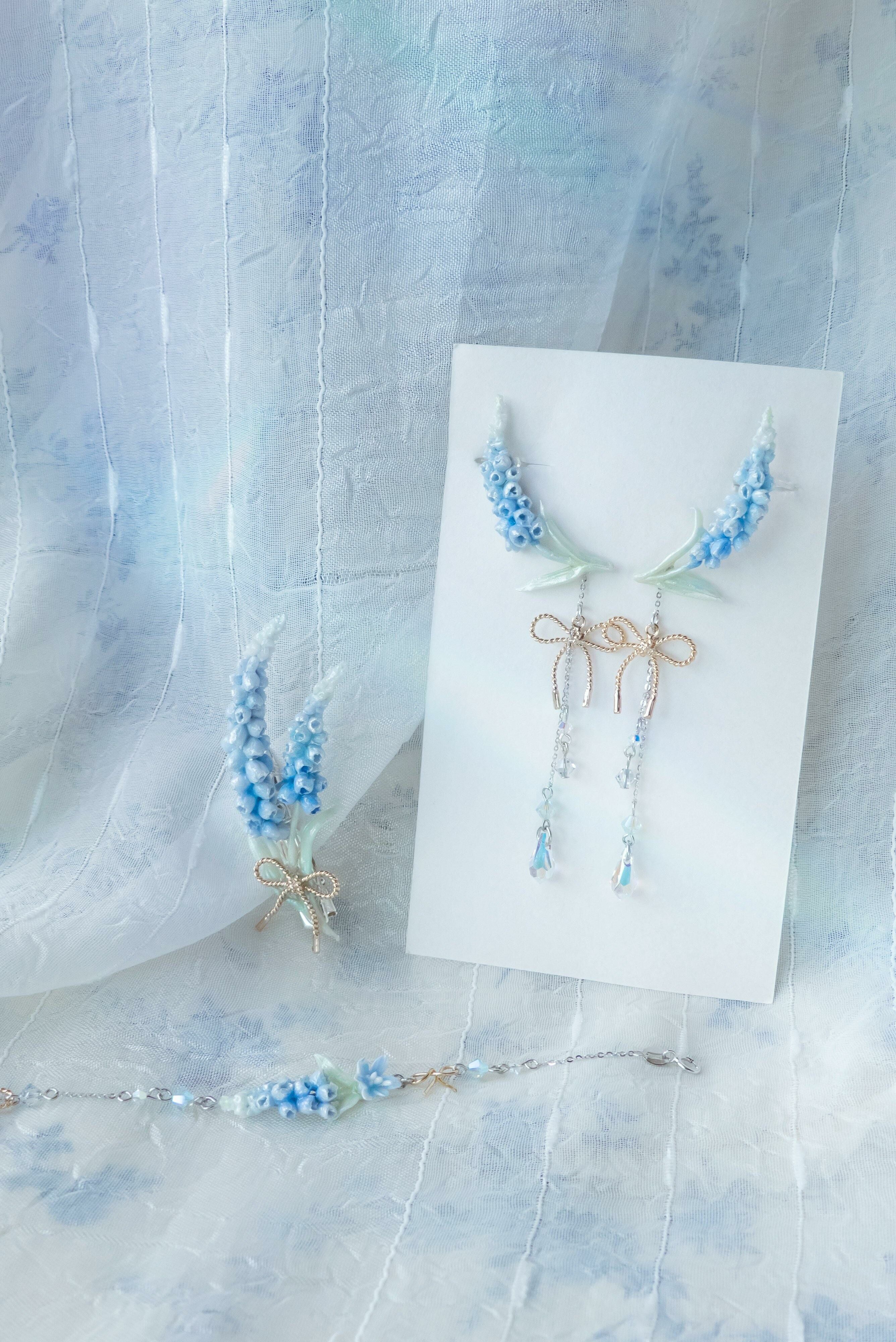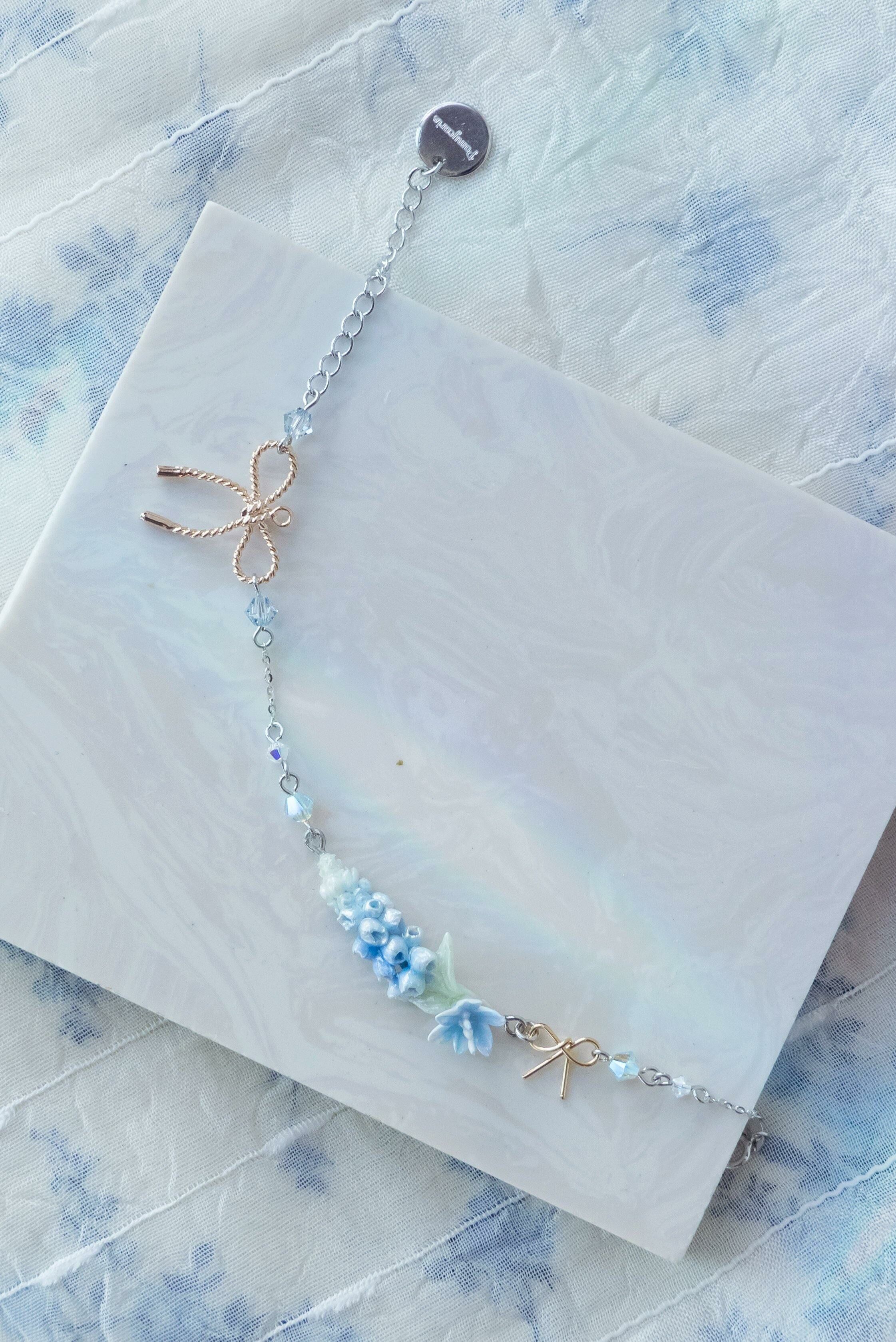 美國進口Beadsmith純銀線 | 奧地利水晶 | 手製樹脂黏土風信子 | UV強化保護層 | 鍍金蝴蝶結 | 925純銀鏈