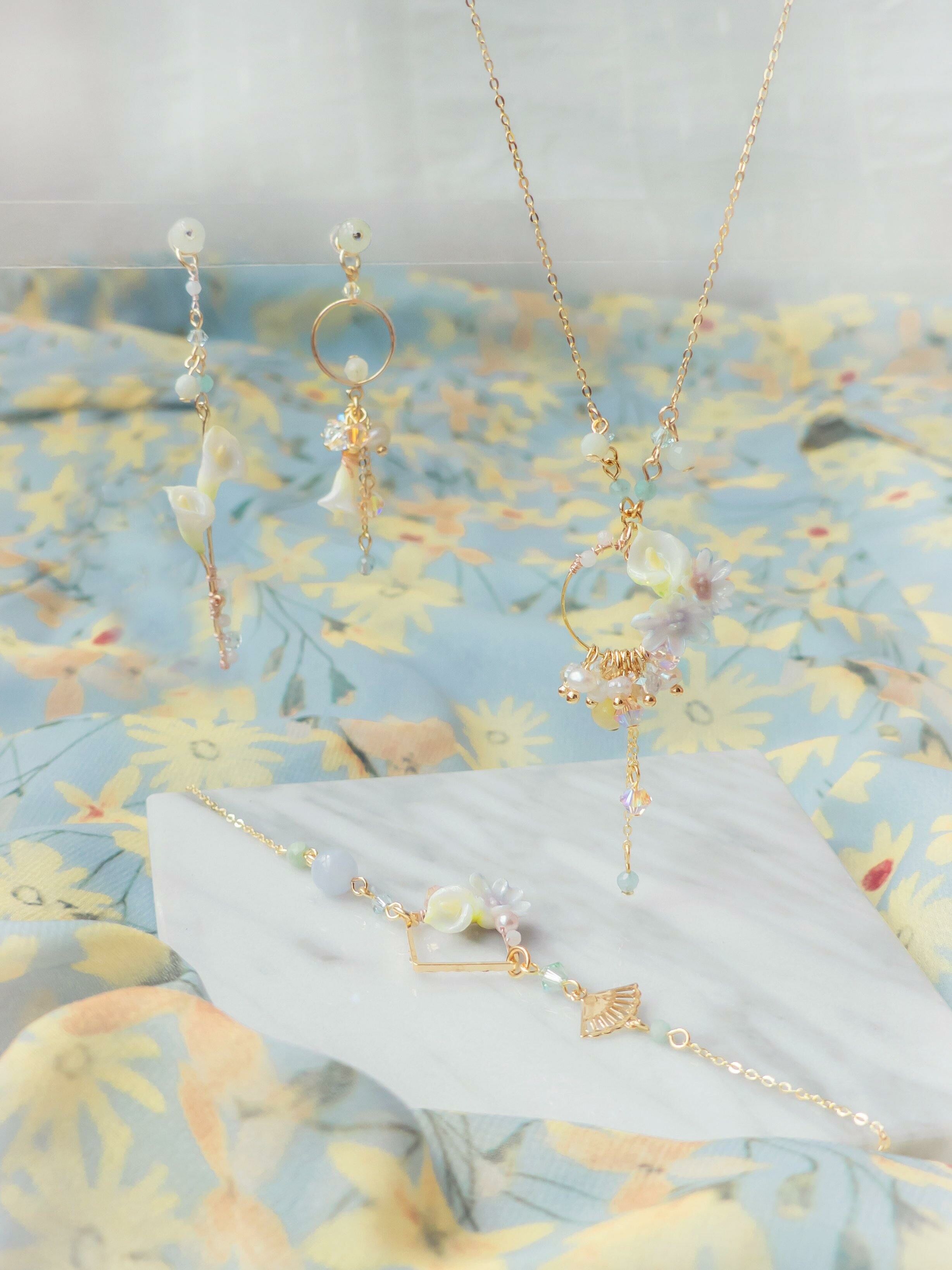 美國進口Beadsmith純銀線 | 奧地利水晶 | 淡水珍珠 | 手製樹脂黏土花| UV強化保護層 | 鍍14K金925純銀耳項鍊