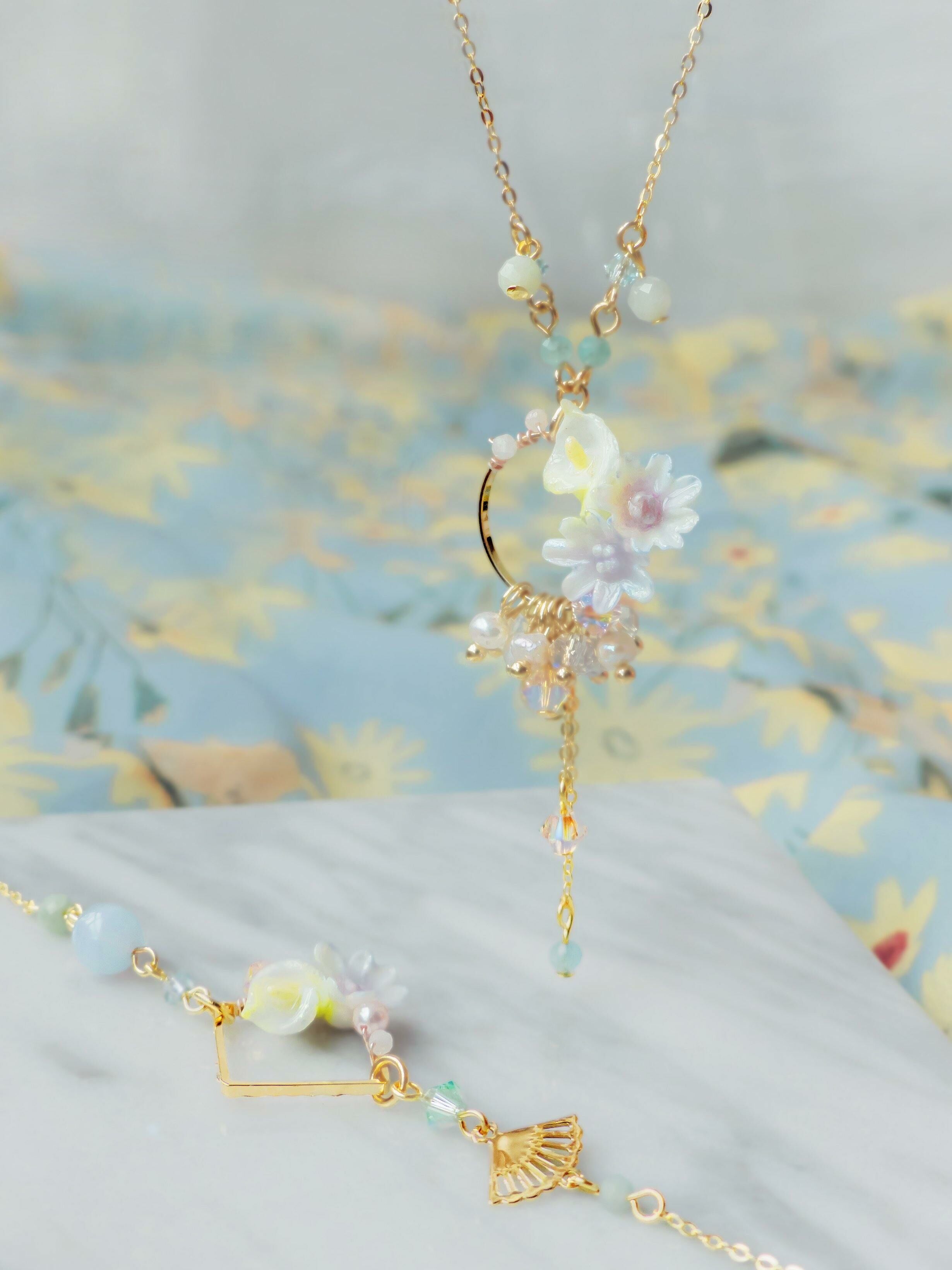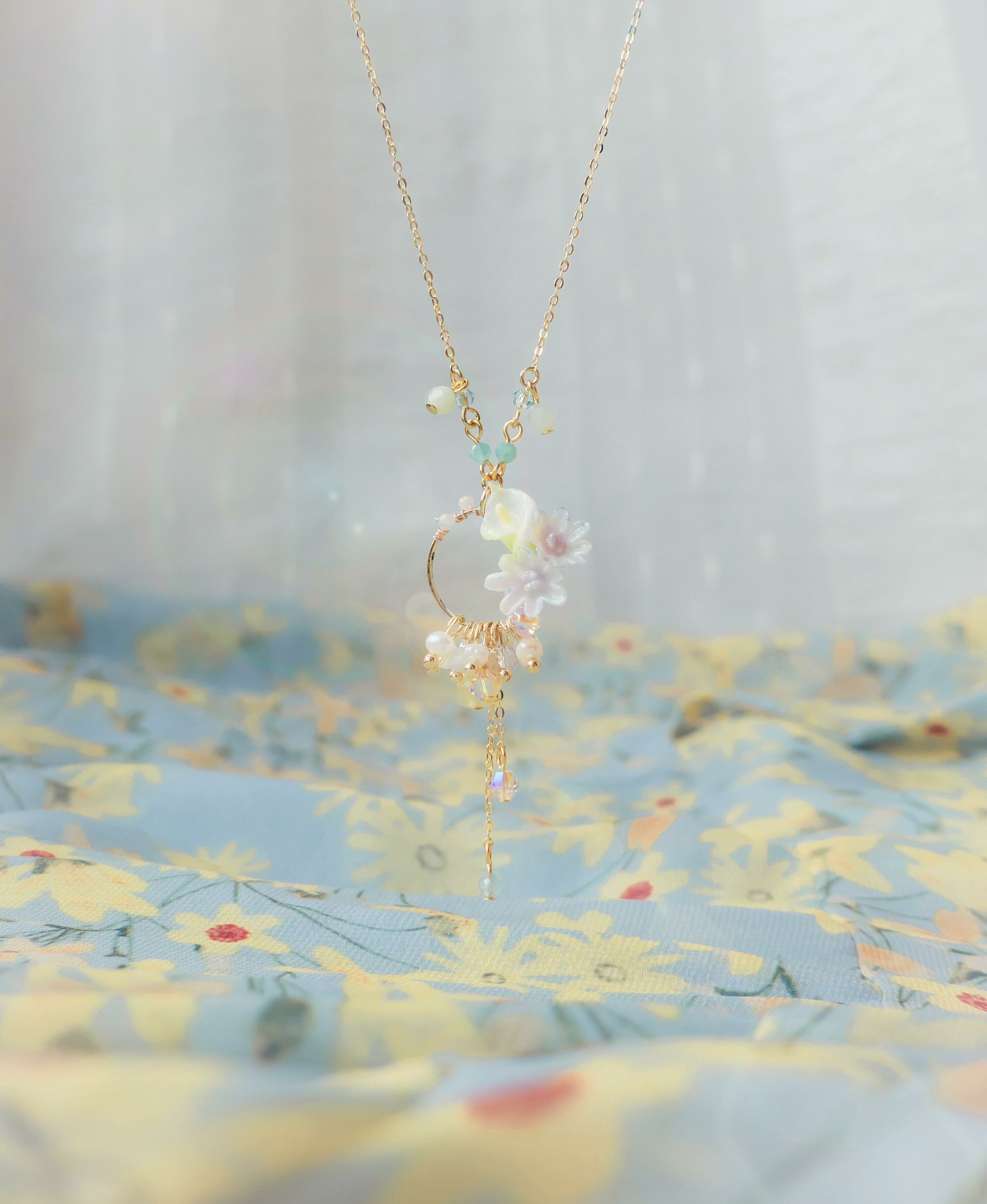 Gold Plated Artistic Wire | Austrian Crystal | Natural Pearl | Handcrafted Resin Clay Muscari | UV Hardening Coating | 14K Gold-Plated 925 Silver Necklace