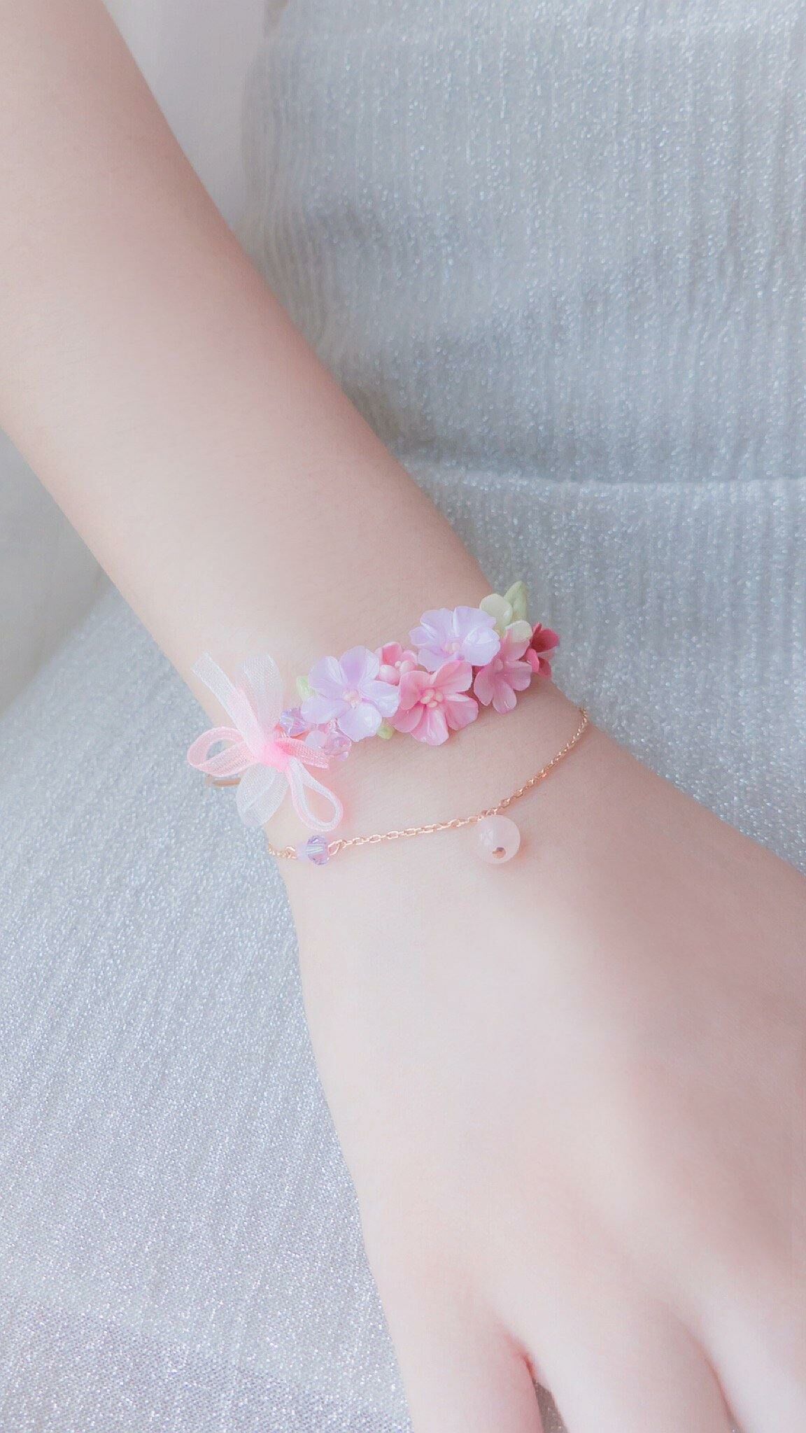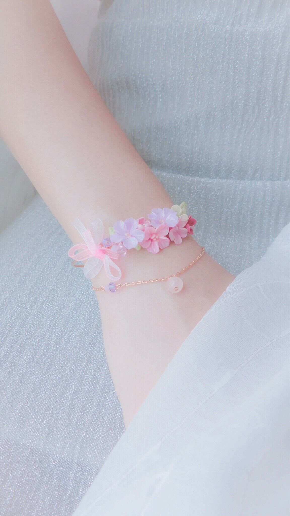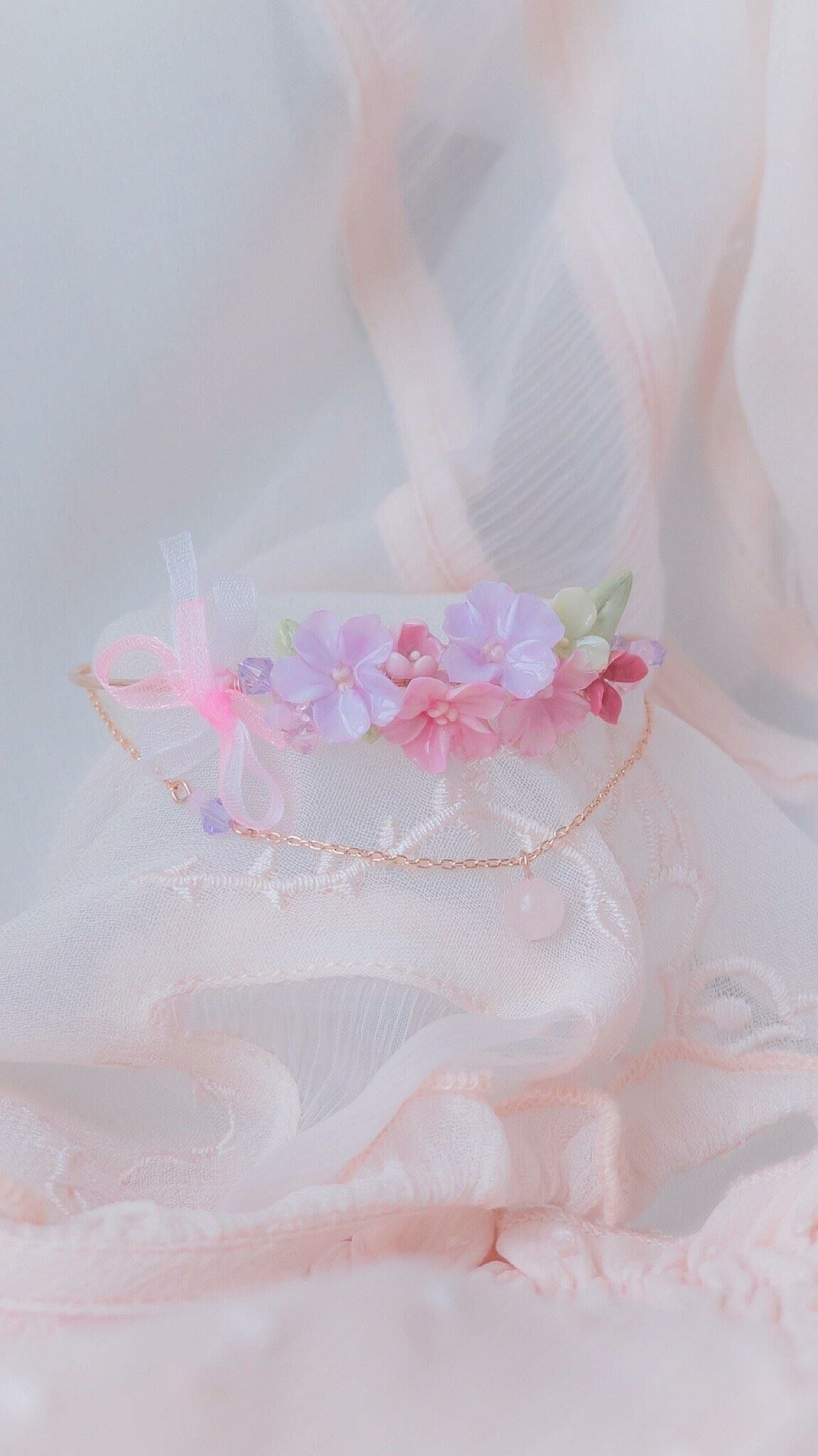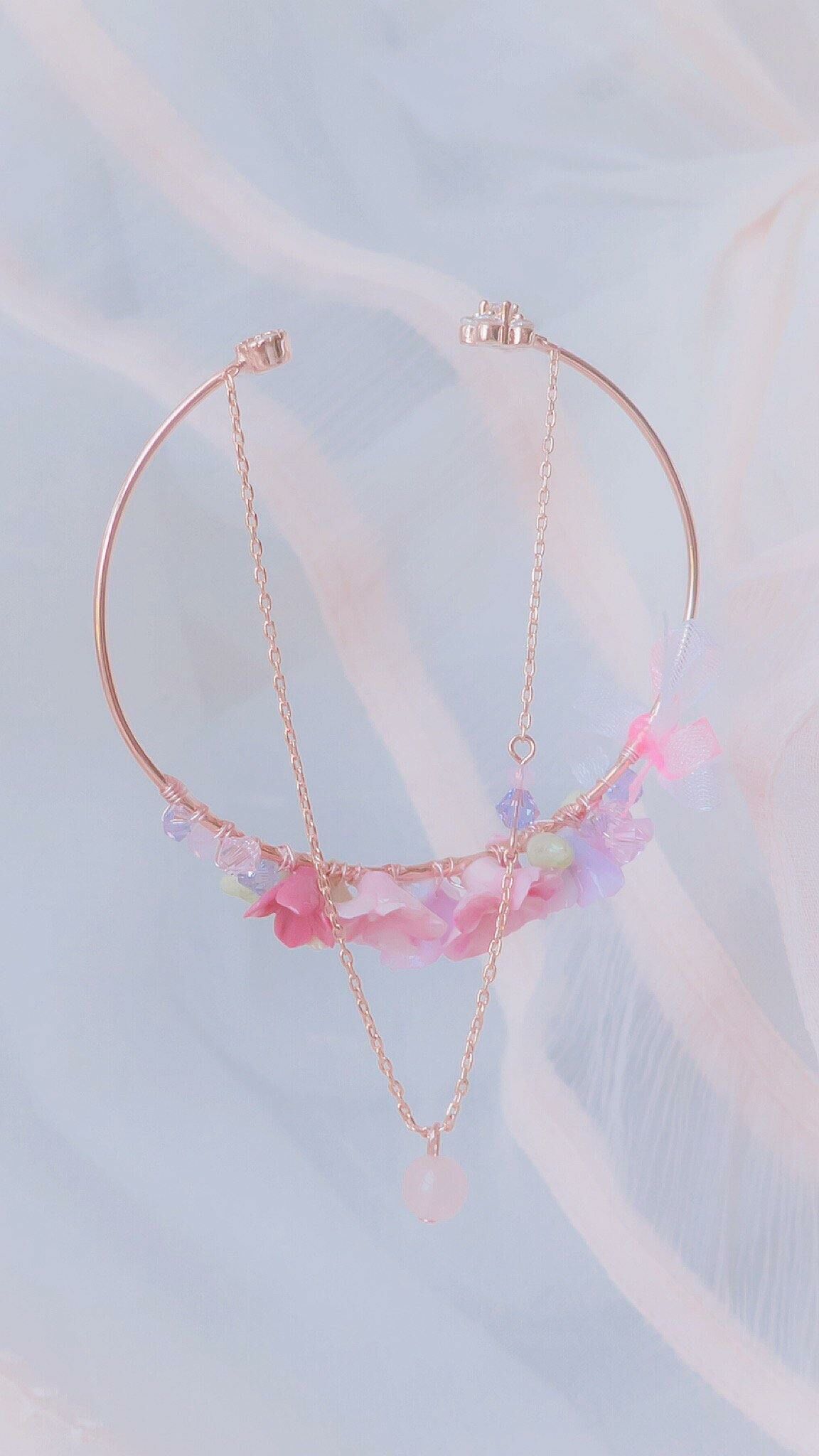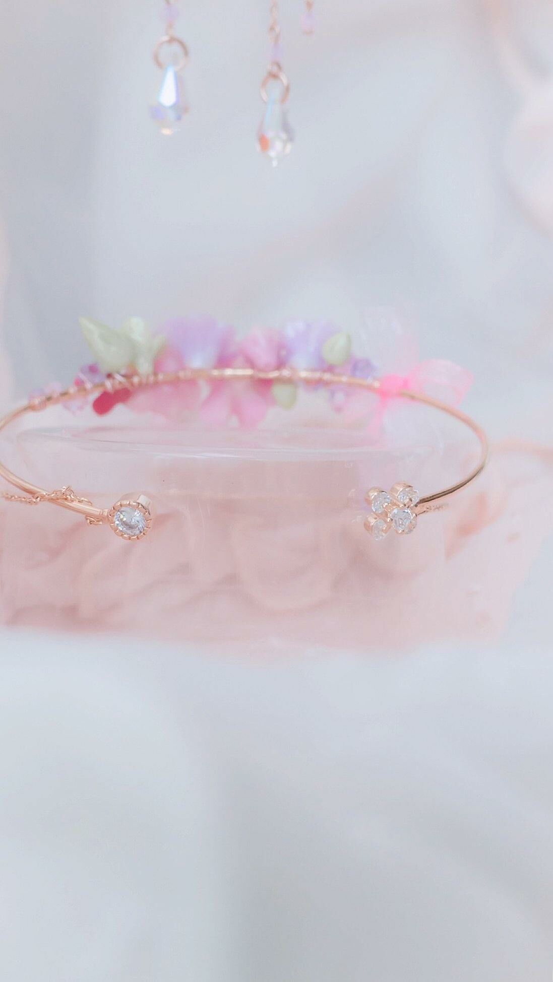 美國進口Beadsmith純銀線 | 奧地利水晶 | 手製樹脂黏土花| 日本緞帶 | UV強化保護層 | 金屬鍍玫瑰金手鐲