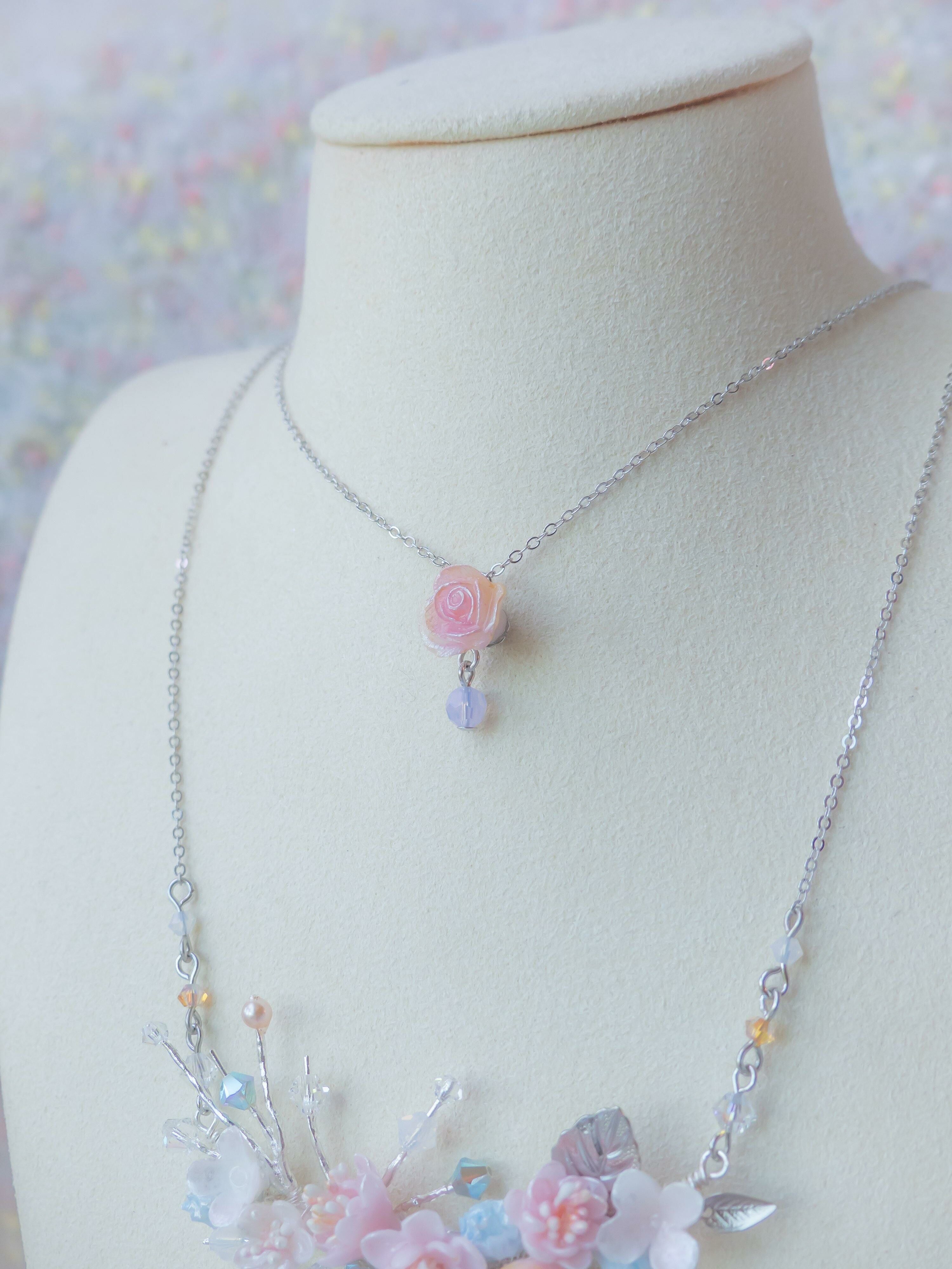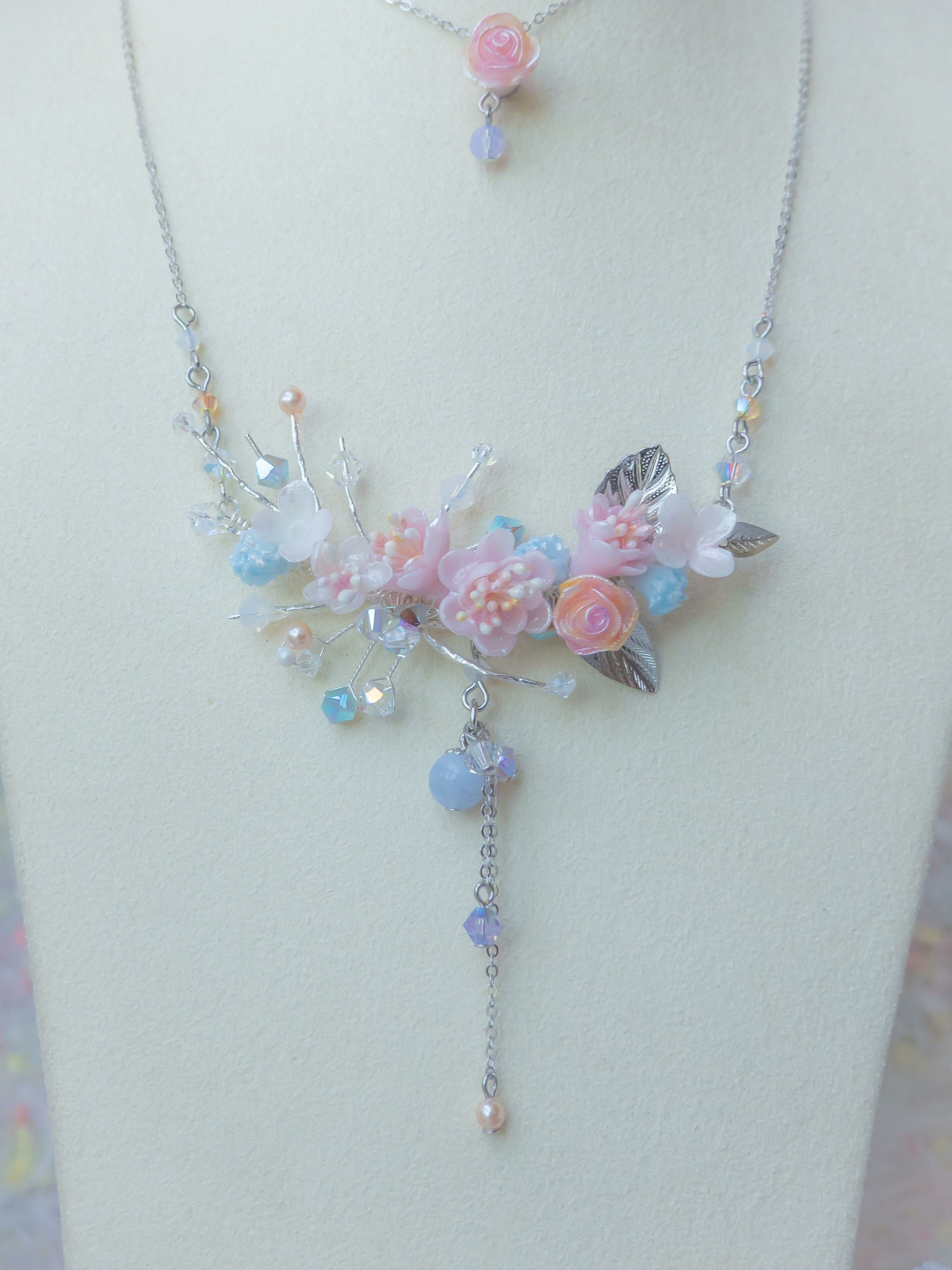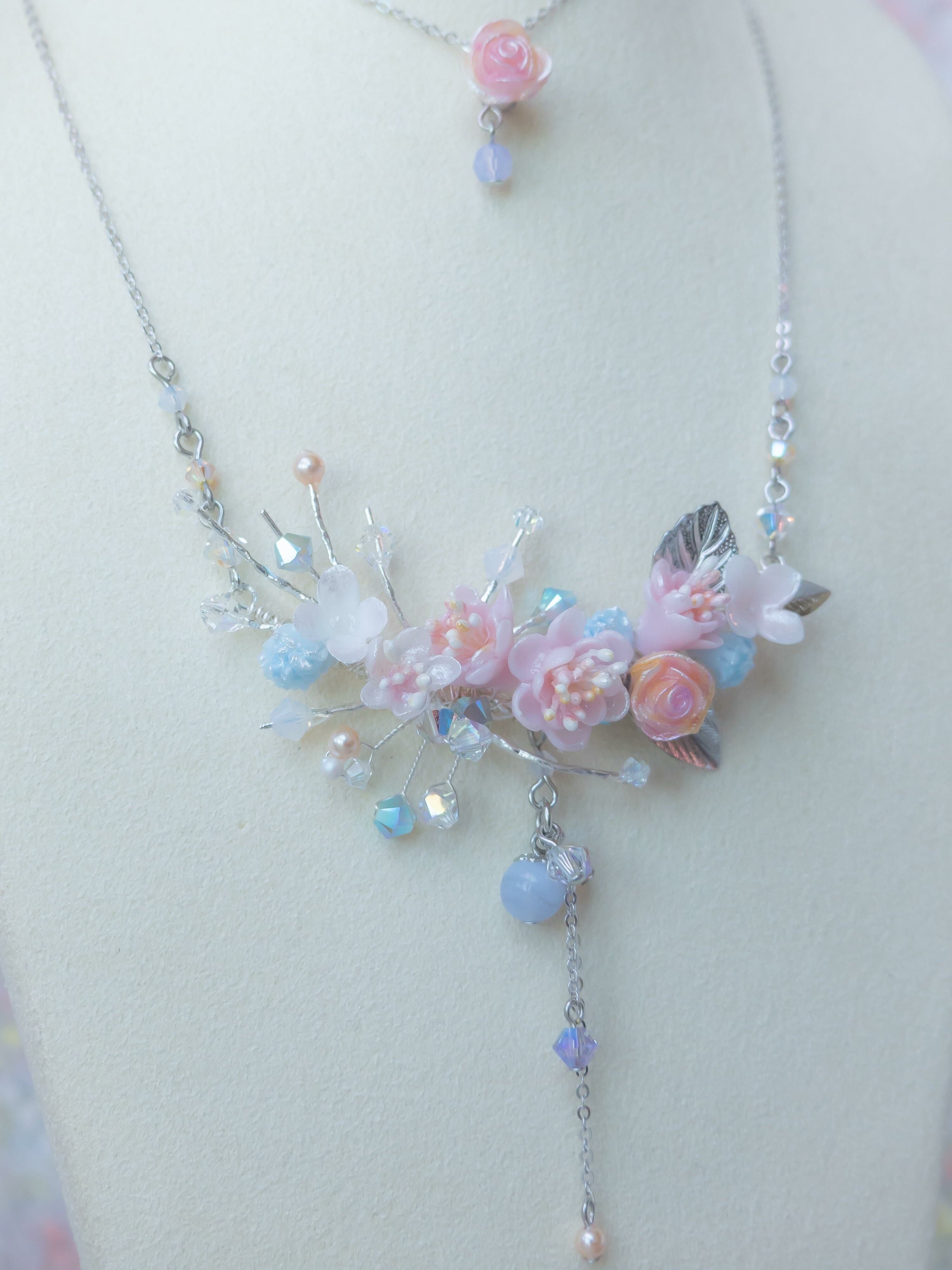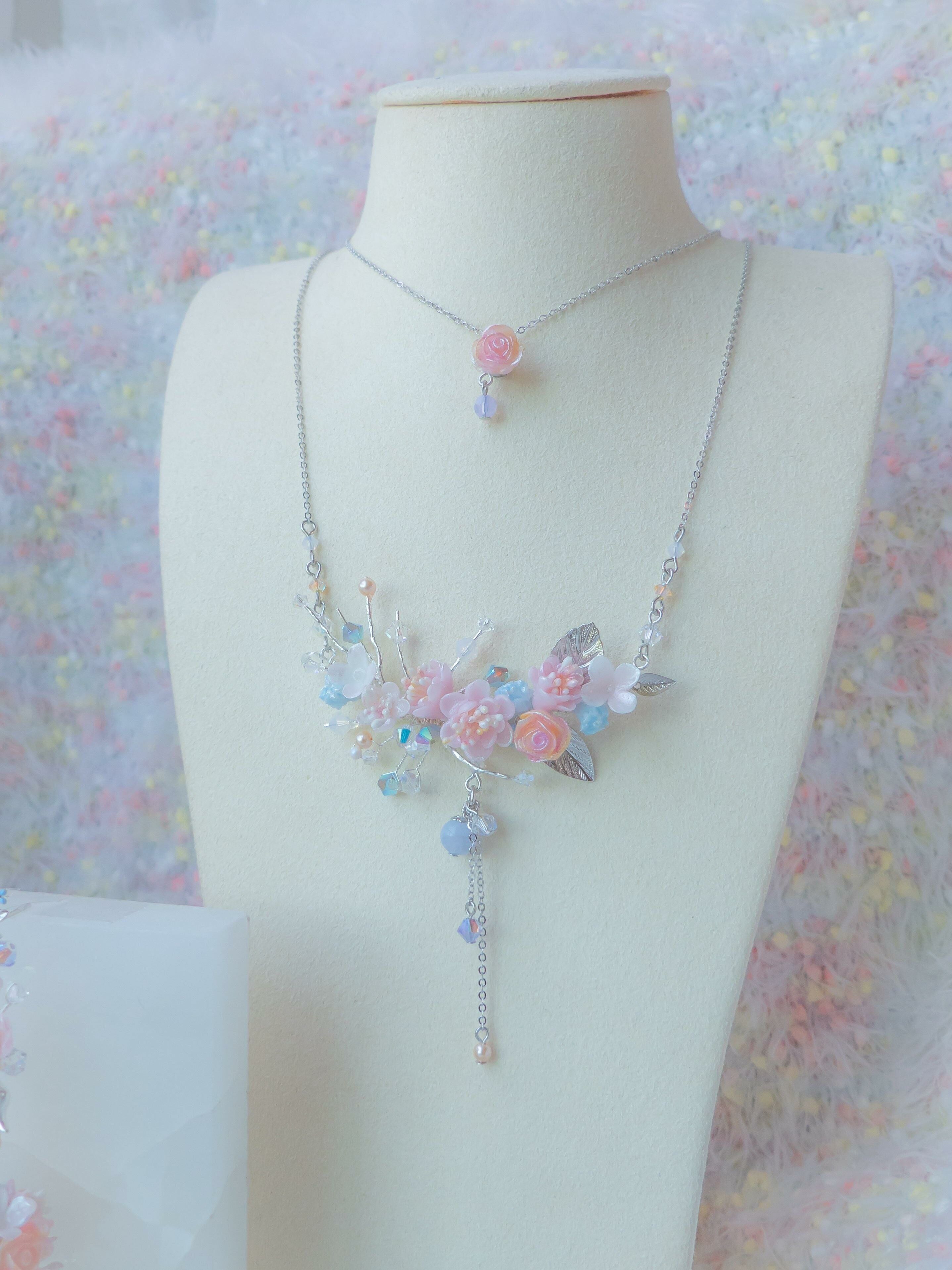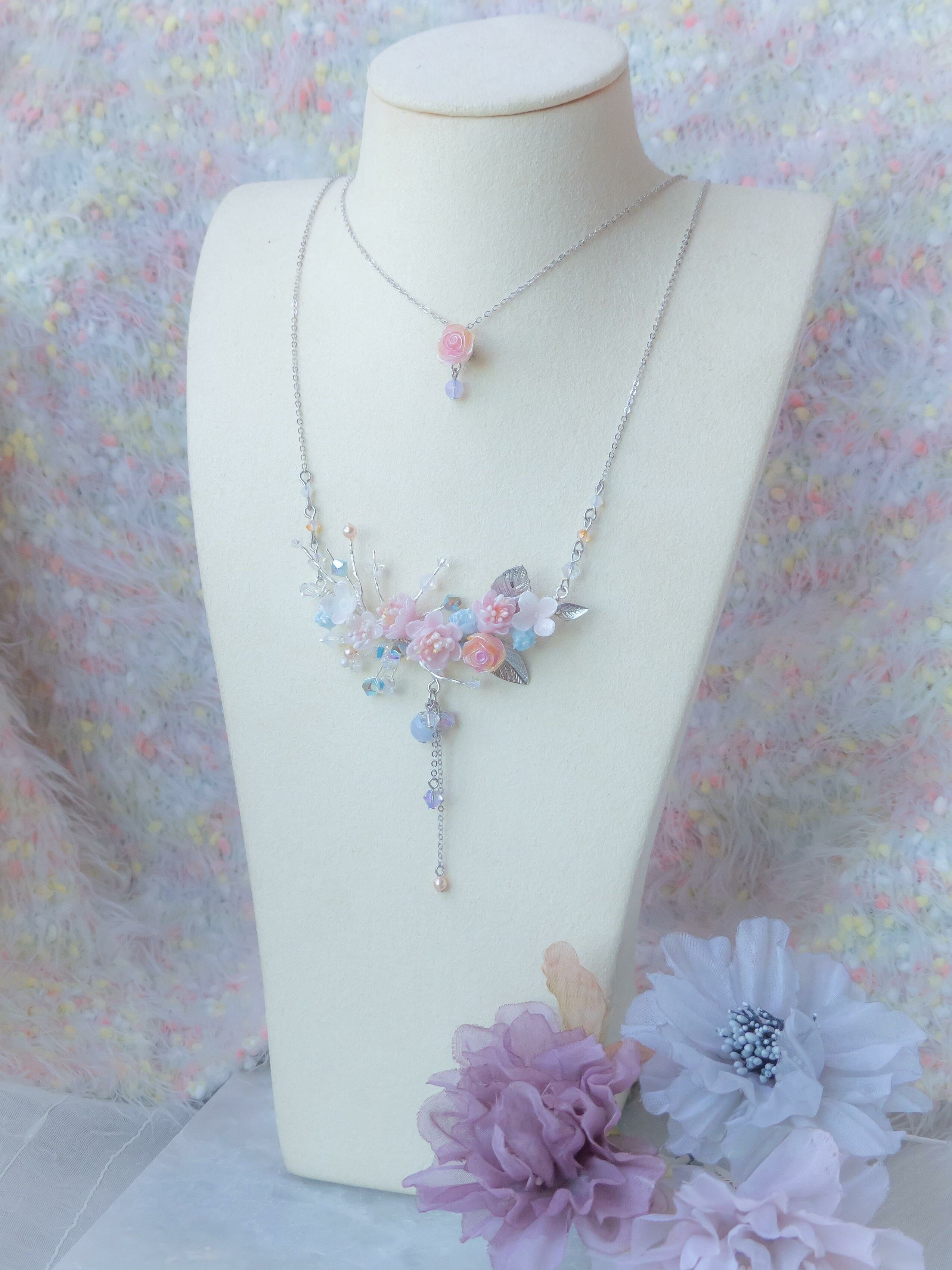 Silver Plated Artistic Wire | Austrian Crystal | Handcrafted Resin Clay Flowers | UV Hardening Coating | 925 Silver Necklace