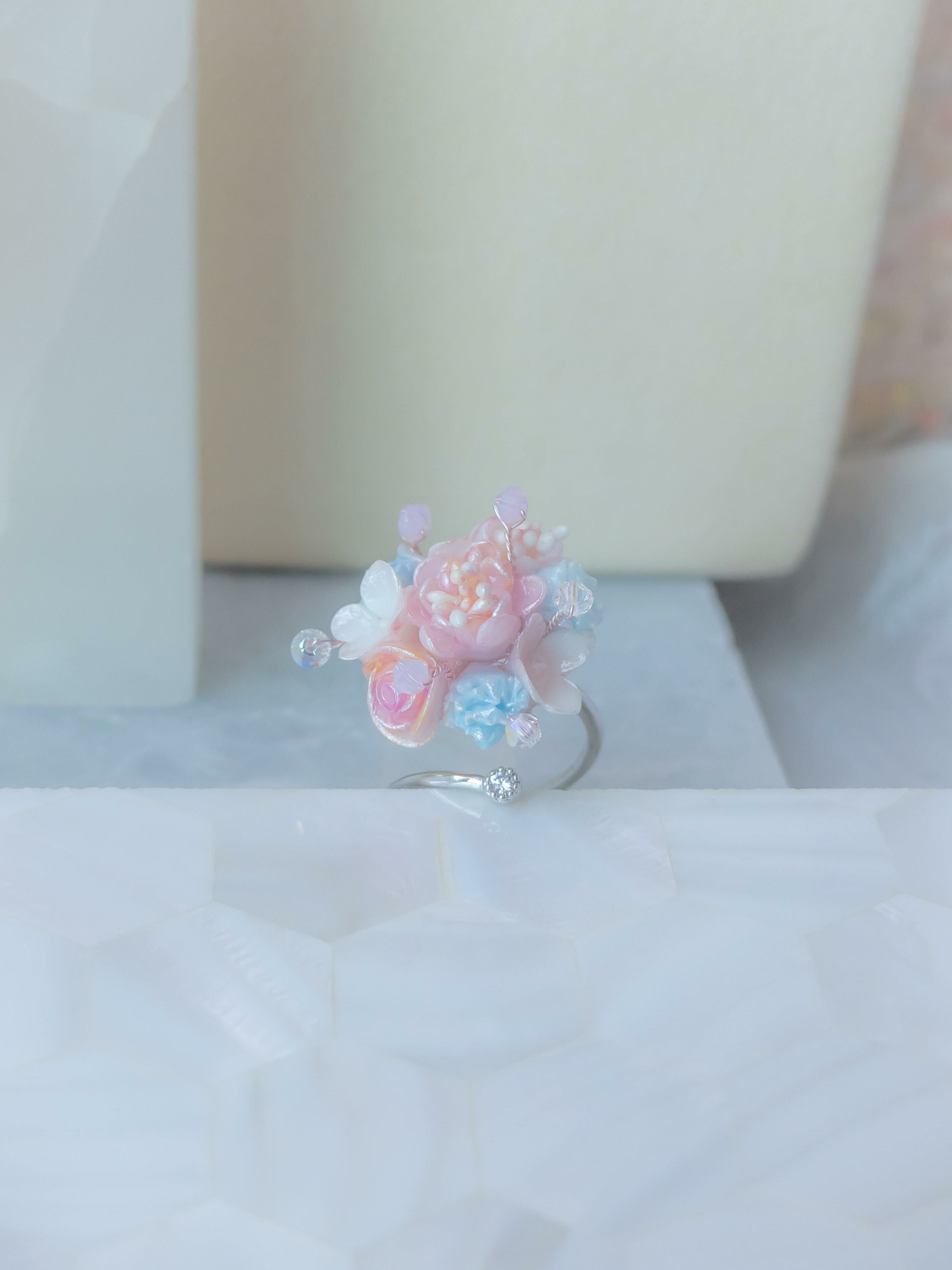 美國進口Beadsmith純銀線 | 奧地利水晶 | 手製樹脂黏土花| UV強化保護層 | 金屬鍍銀戒指