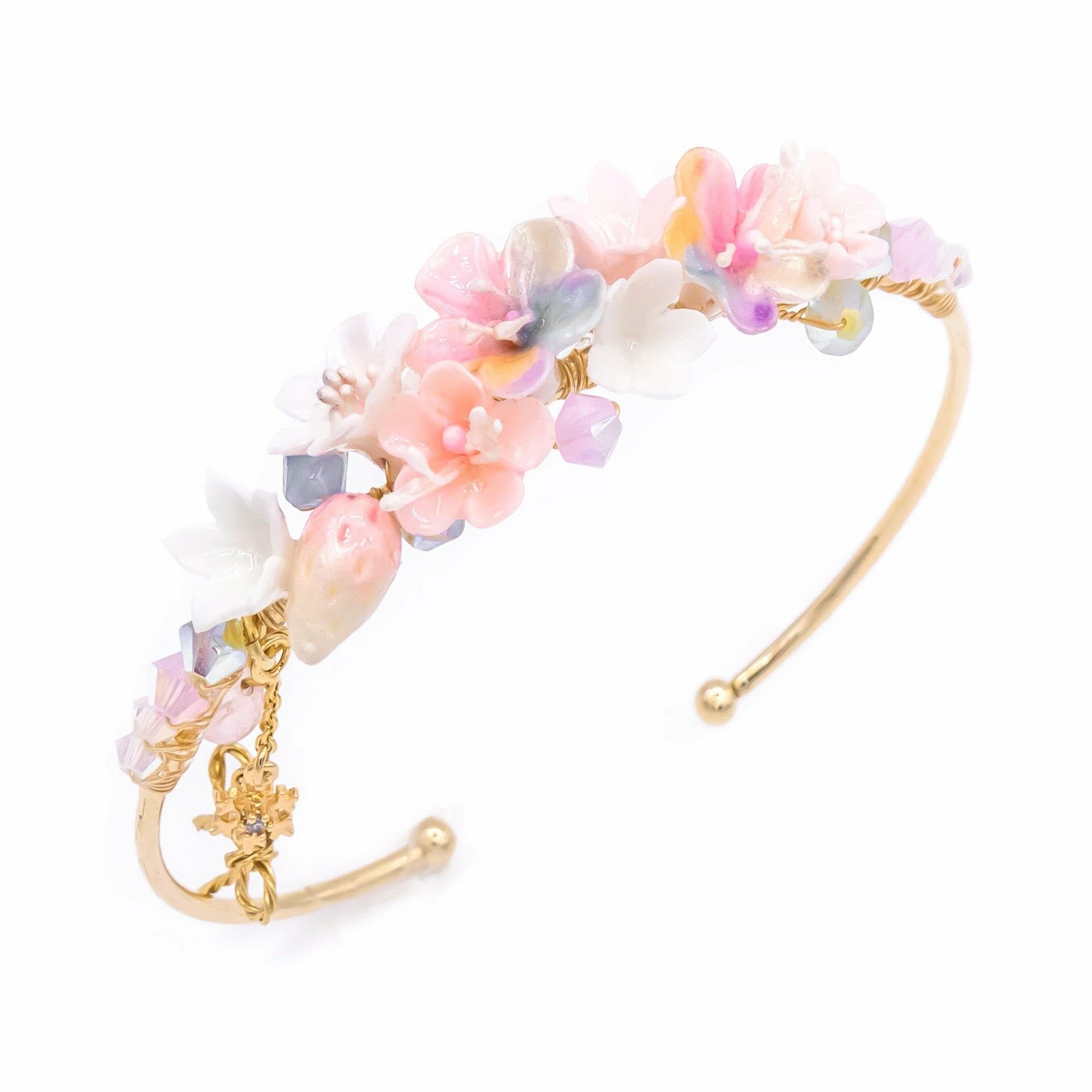 美國進口Beadsmith純銀線 | 奧地利水晶 | 手製樹脂黏土花 | UV膠強化保護層 | 銅鍍14K金手鐲