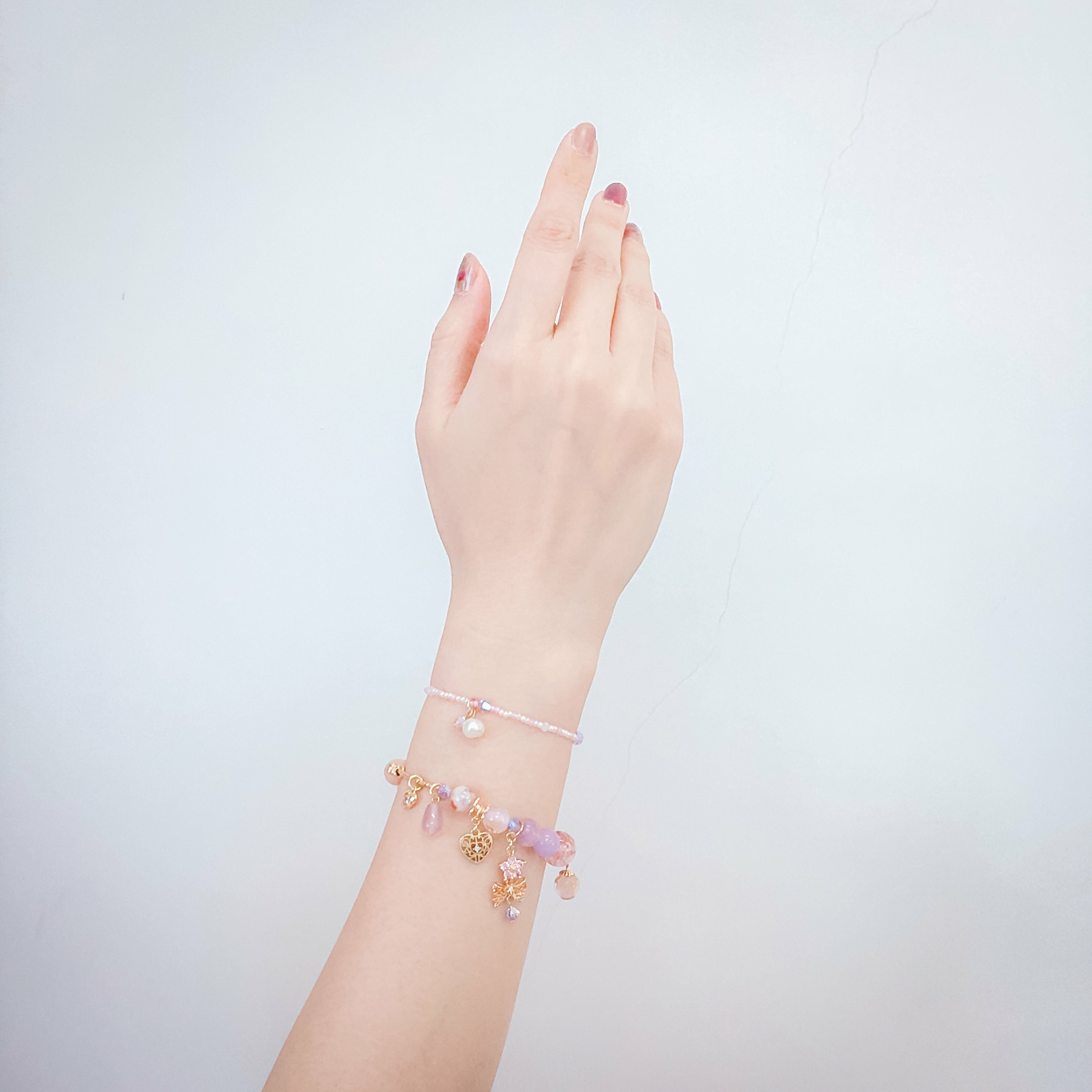 {𝟛} 蕾絲蝴蝶結手鍊2件套裝:雪花螢石、櫻花瑪瑙、日本玻璃珠、紫鯉輝