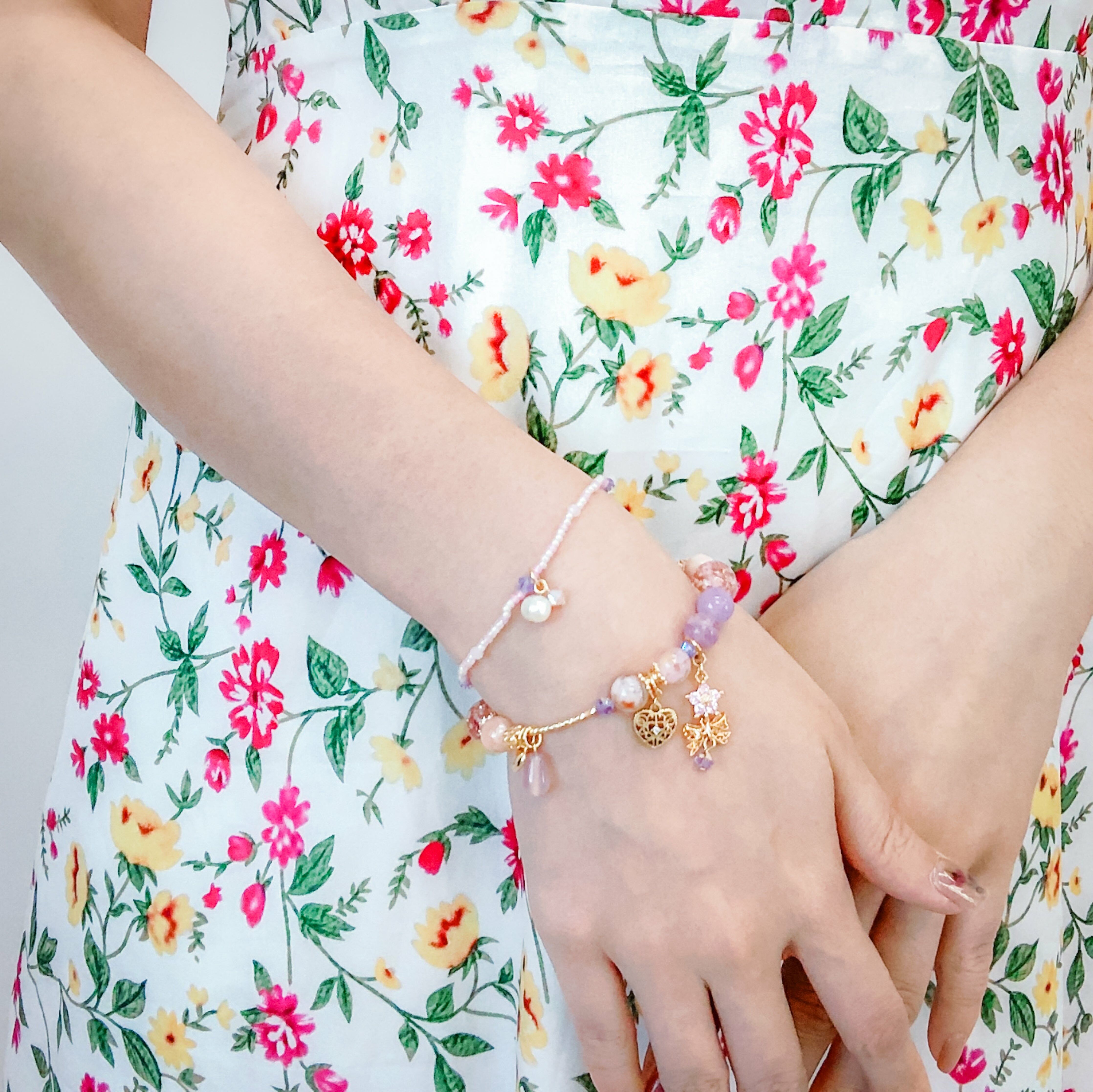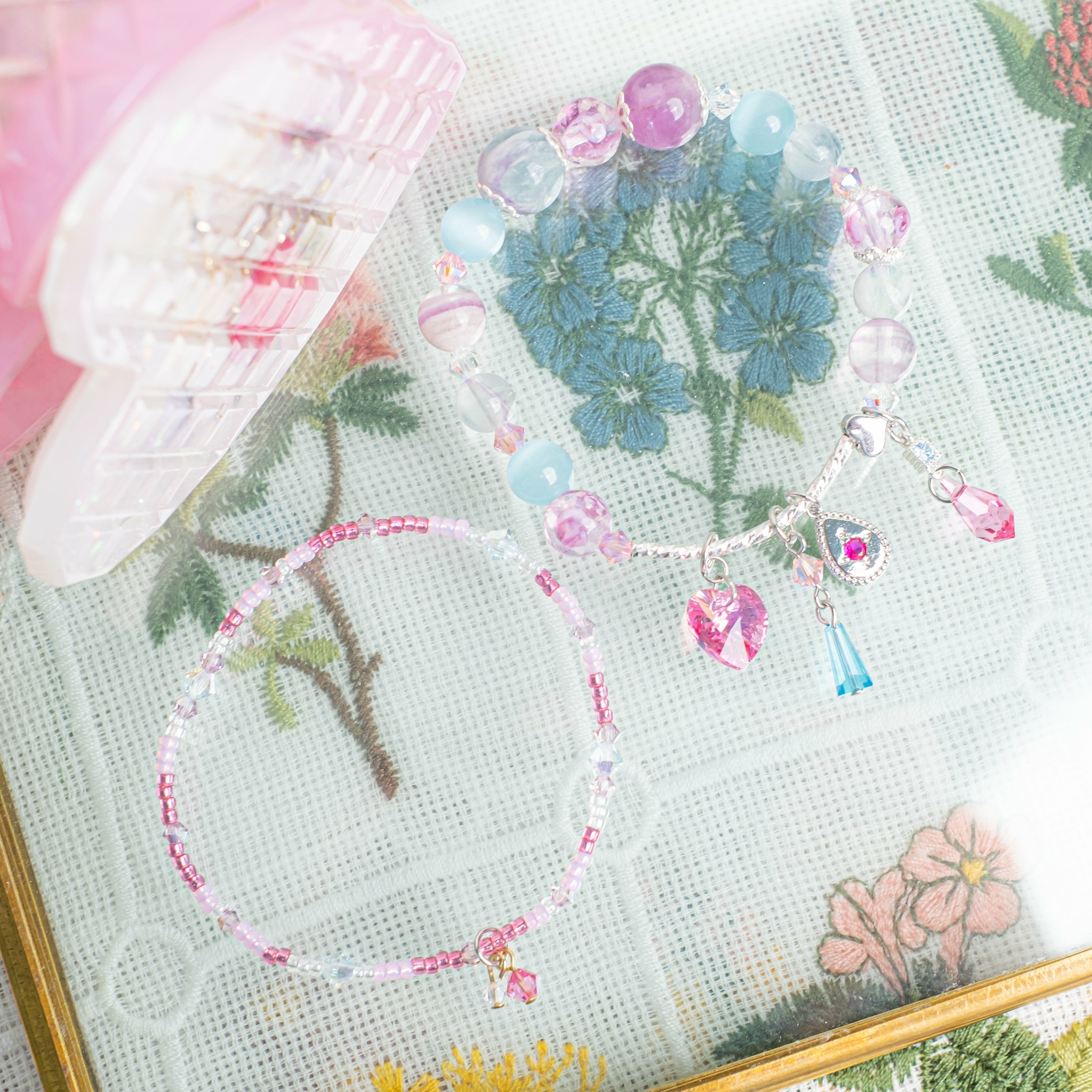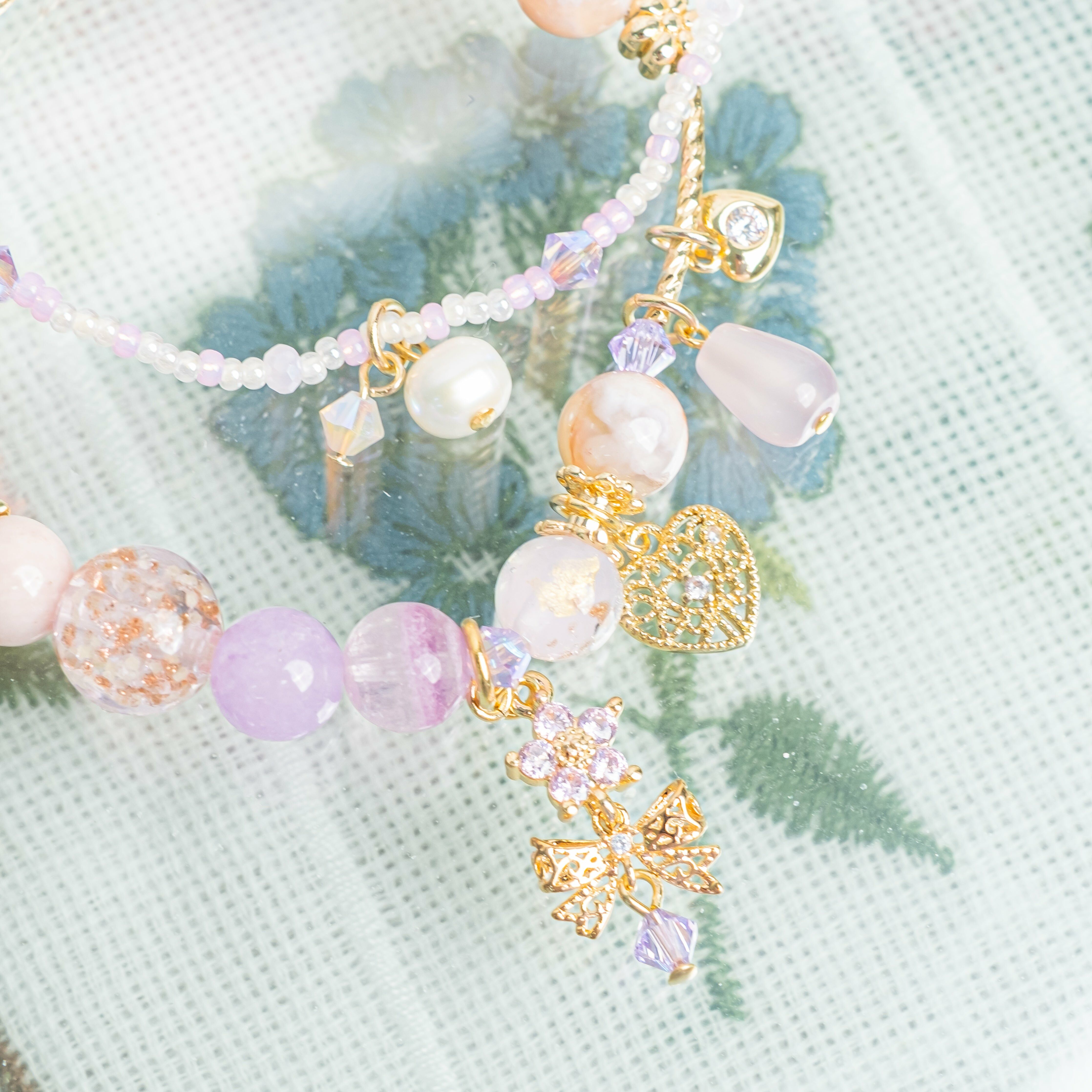 {𝟚} 粉嫩蝴蝶手鍊2件套裝:螢石、摩根石、心形粉晶