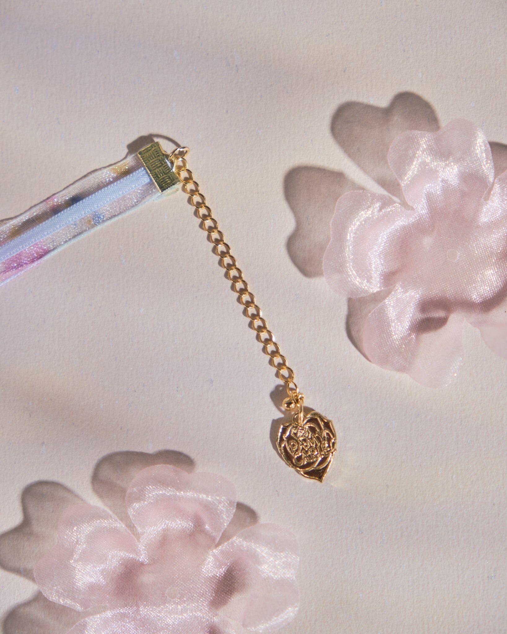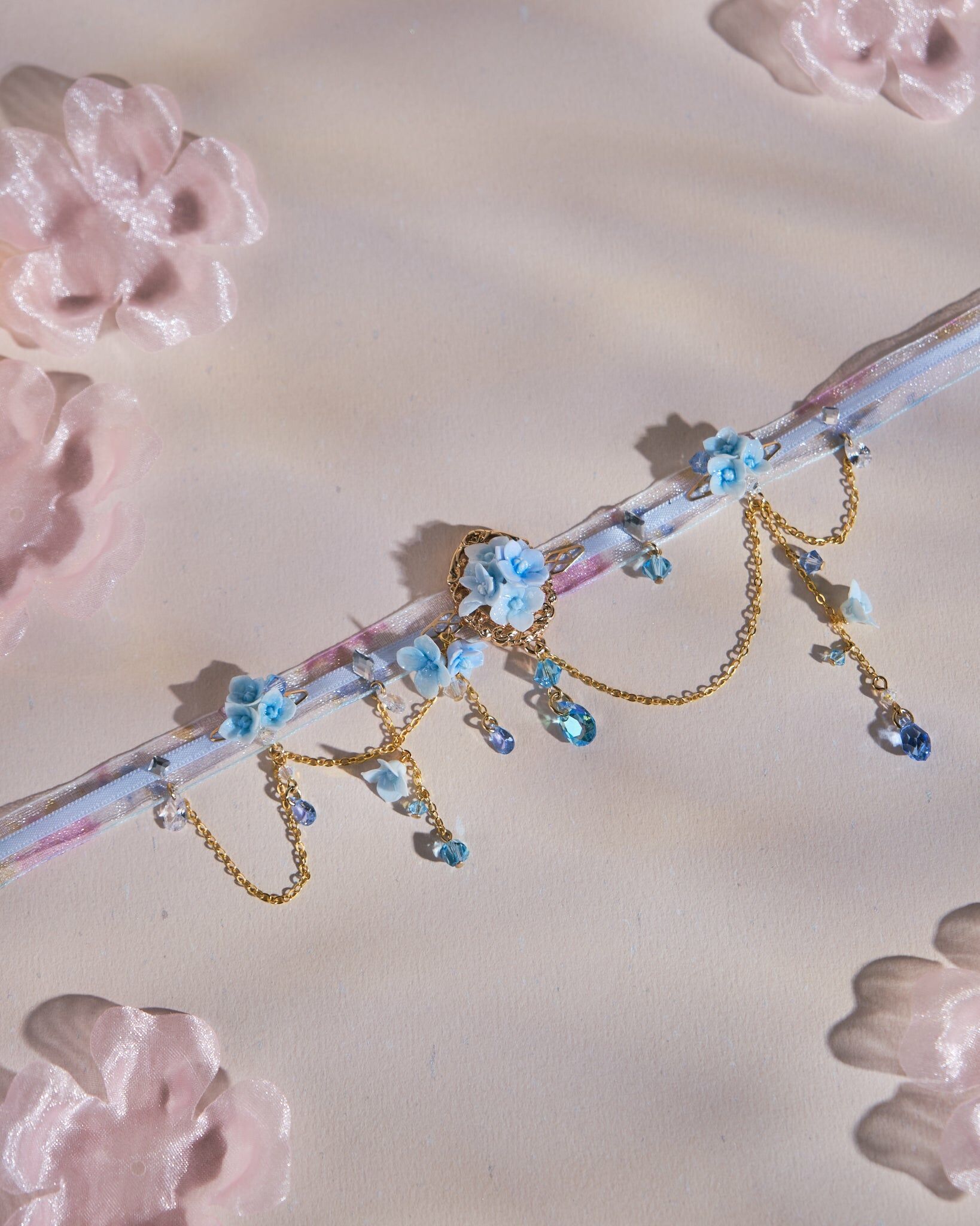 Gold-Plated Metal Chain | Handcrafted Resin Flower | UV Resin Hardening Coating | Swarovski Crystal | Ribbon