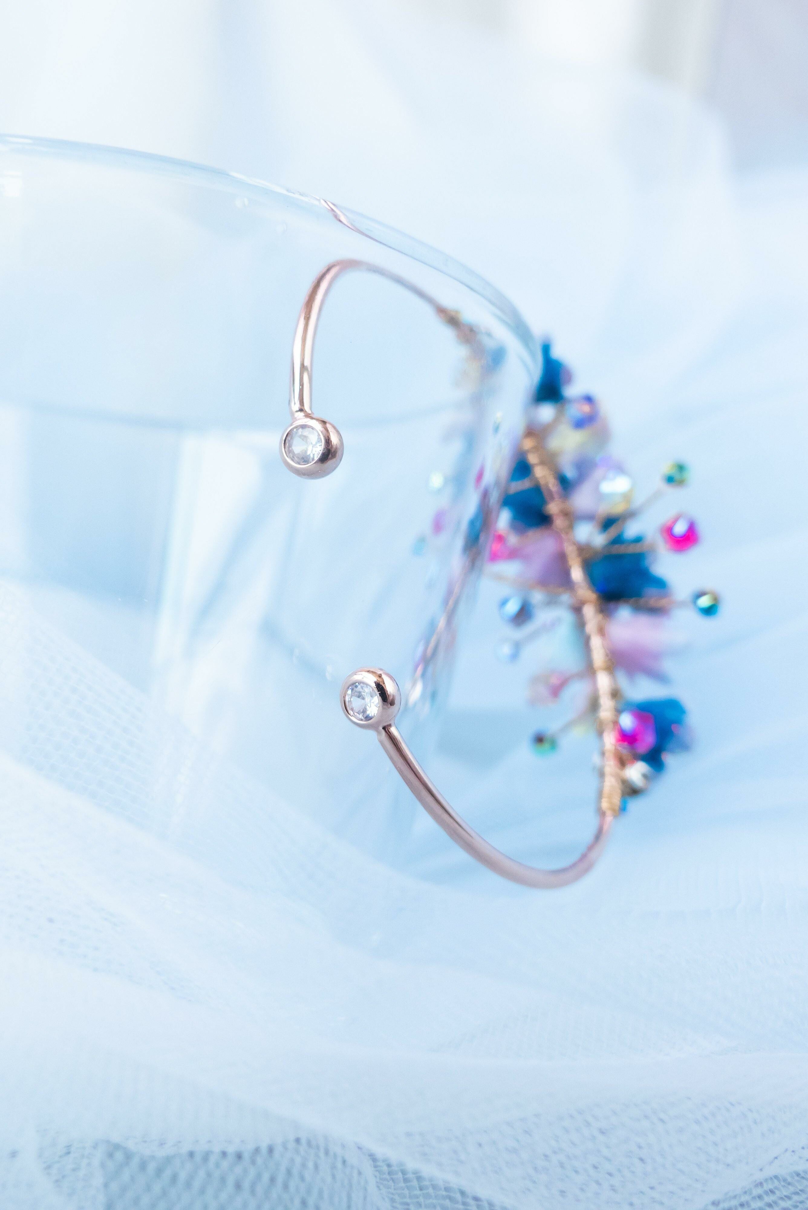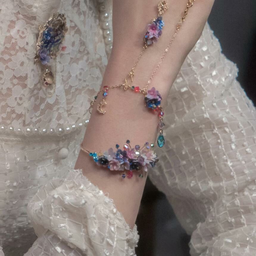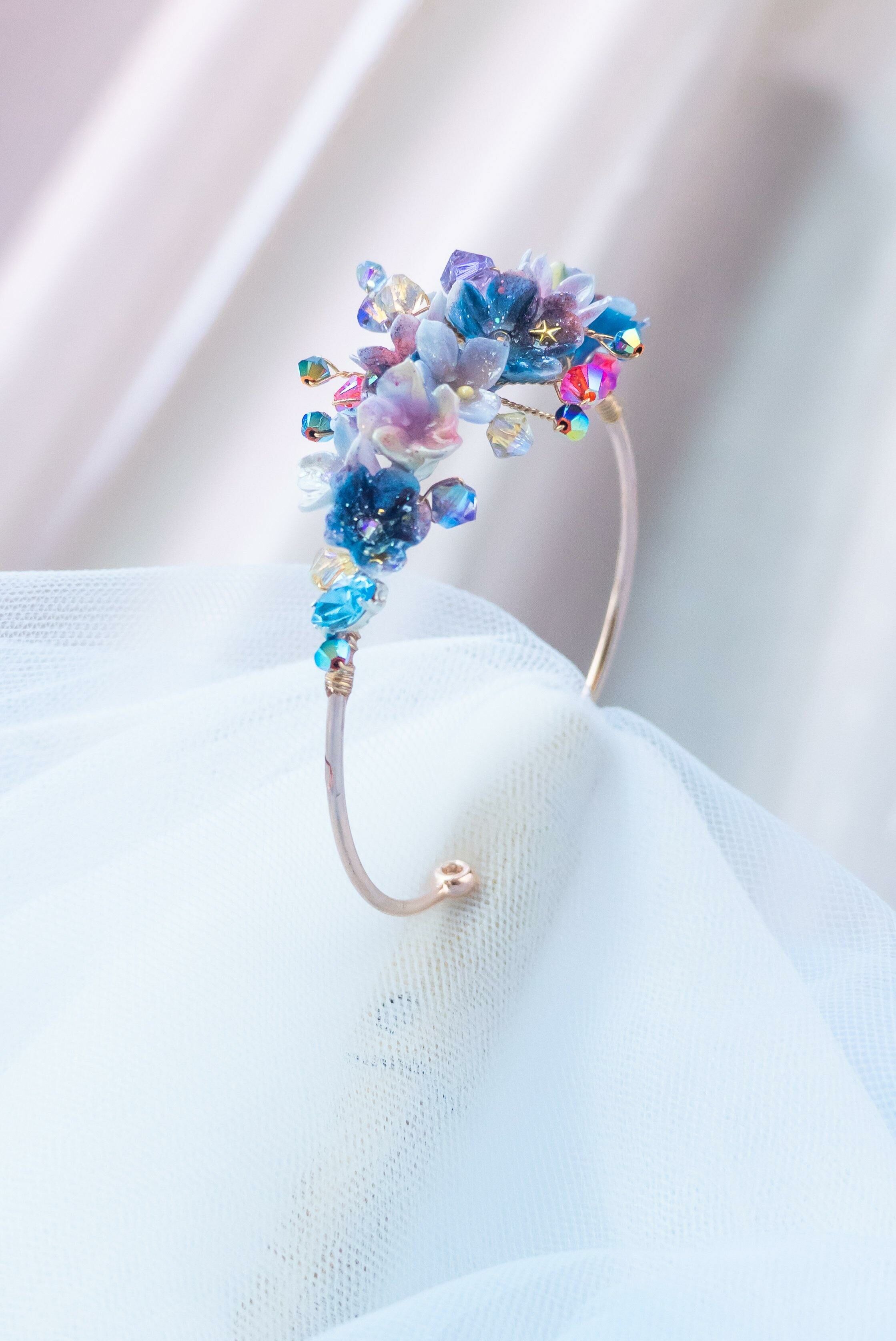 鍍金銀線 | 施華洛世奇水晶 | 手製樹脂黏土花 | UV膠強化保護層 | 鍍14K金手鐲