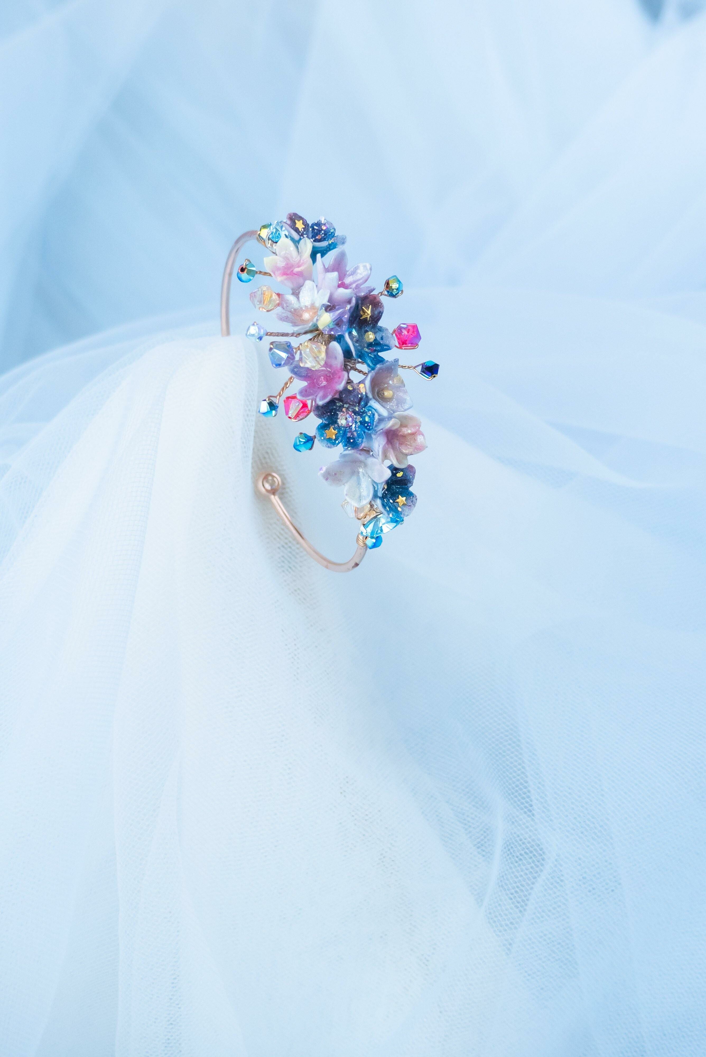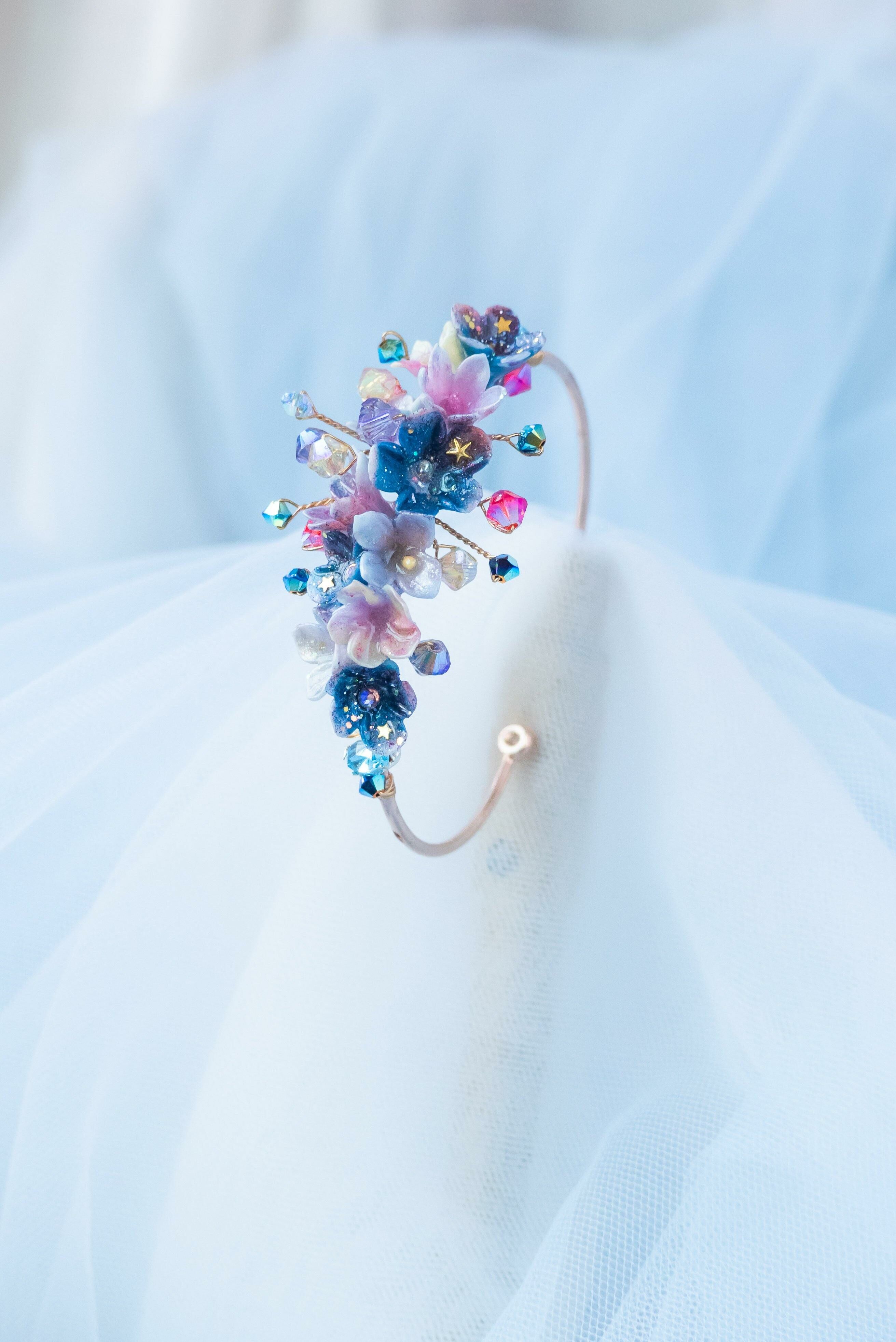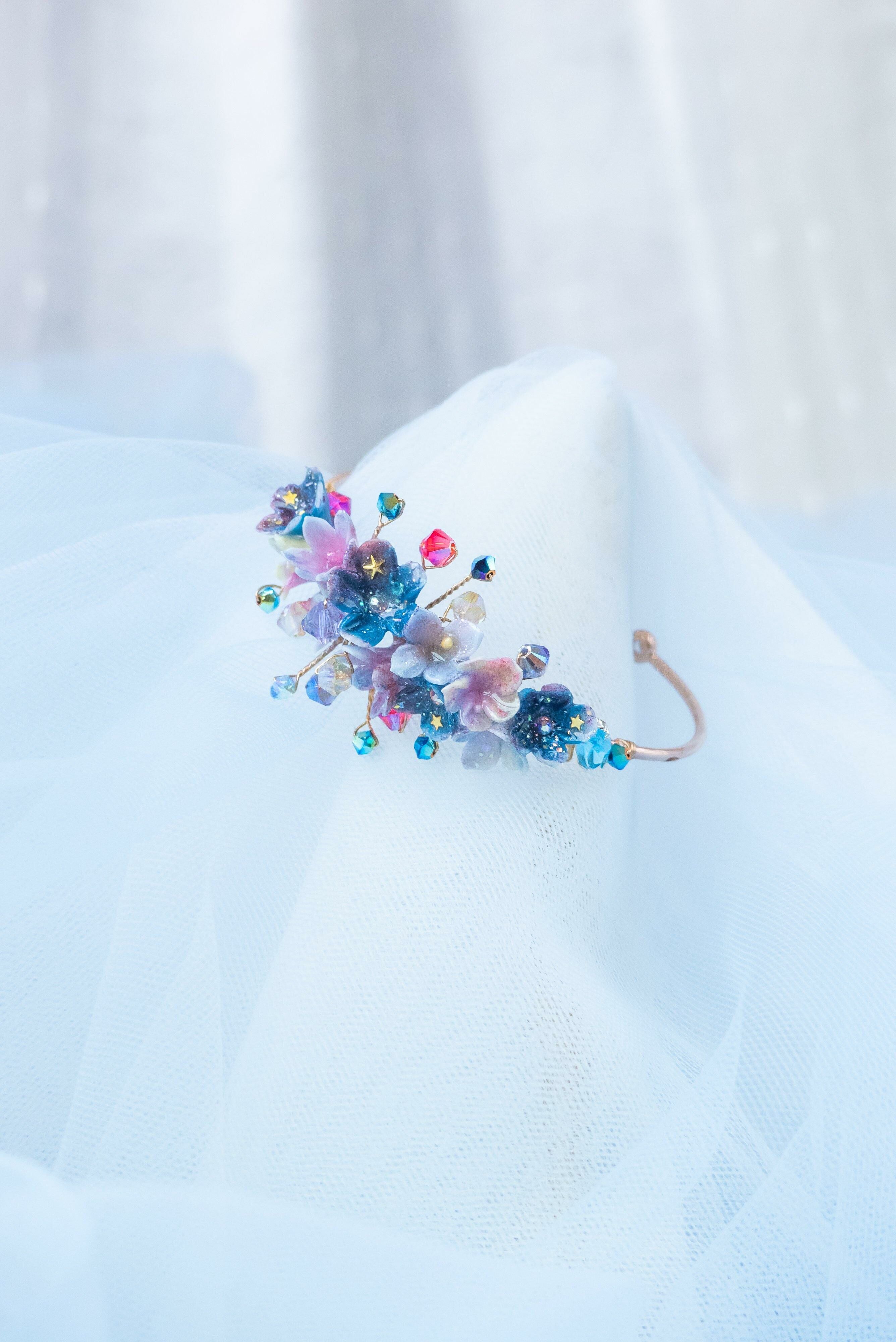 鍍金銀線 | 施華洛世奇水晶 | 手製樹脂黏土花 | UV膠強化保護層 | 鍍14K金手鐲