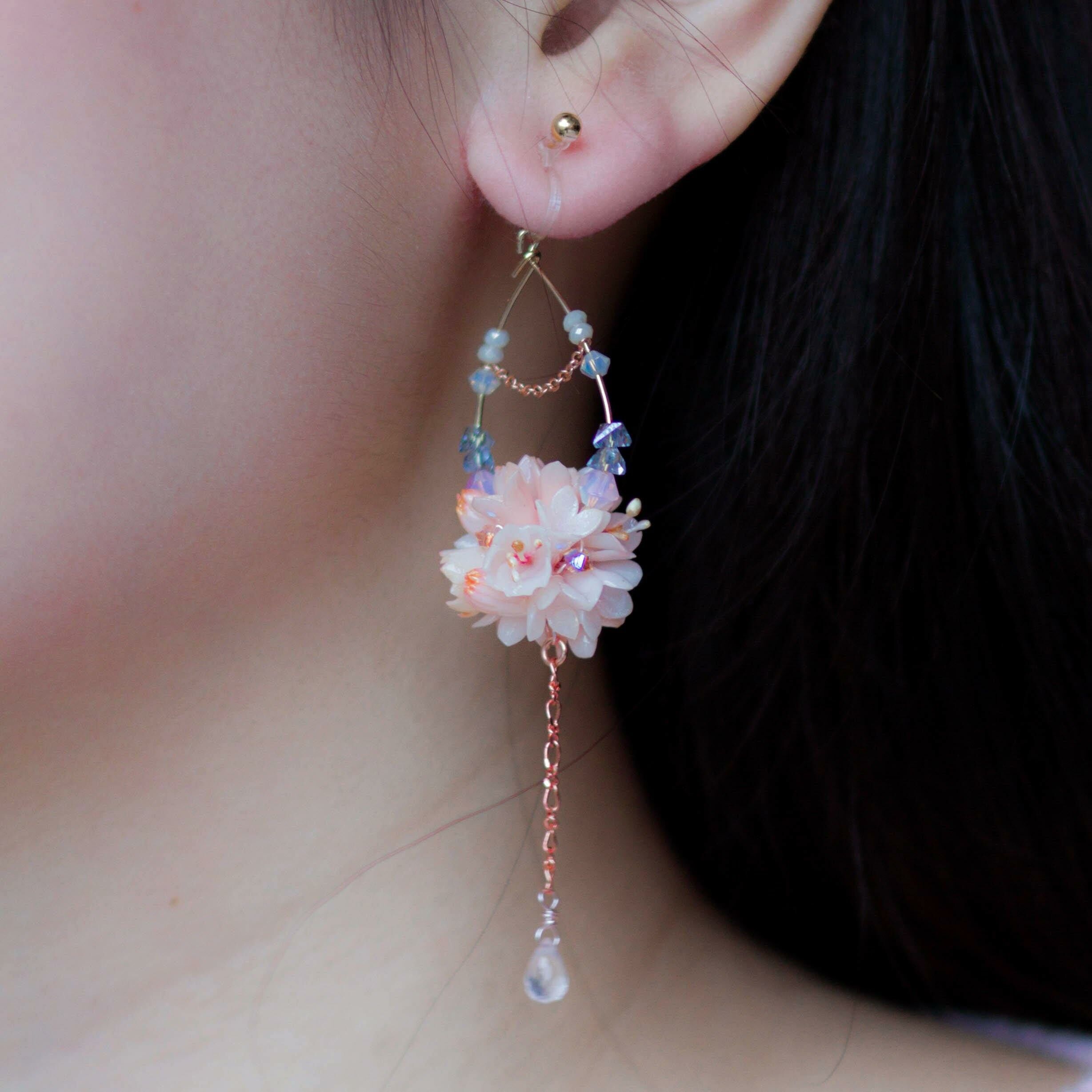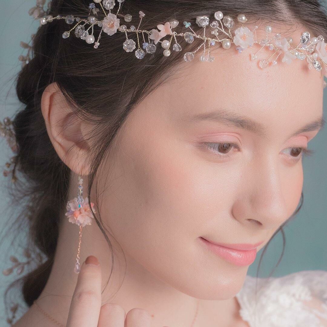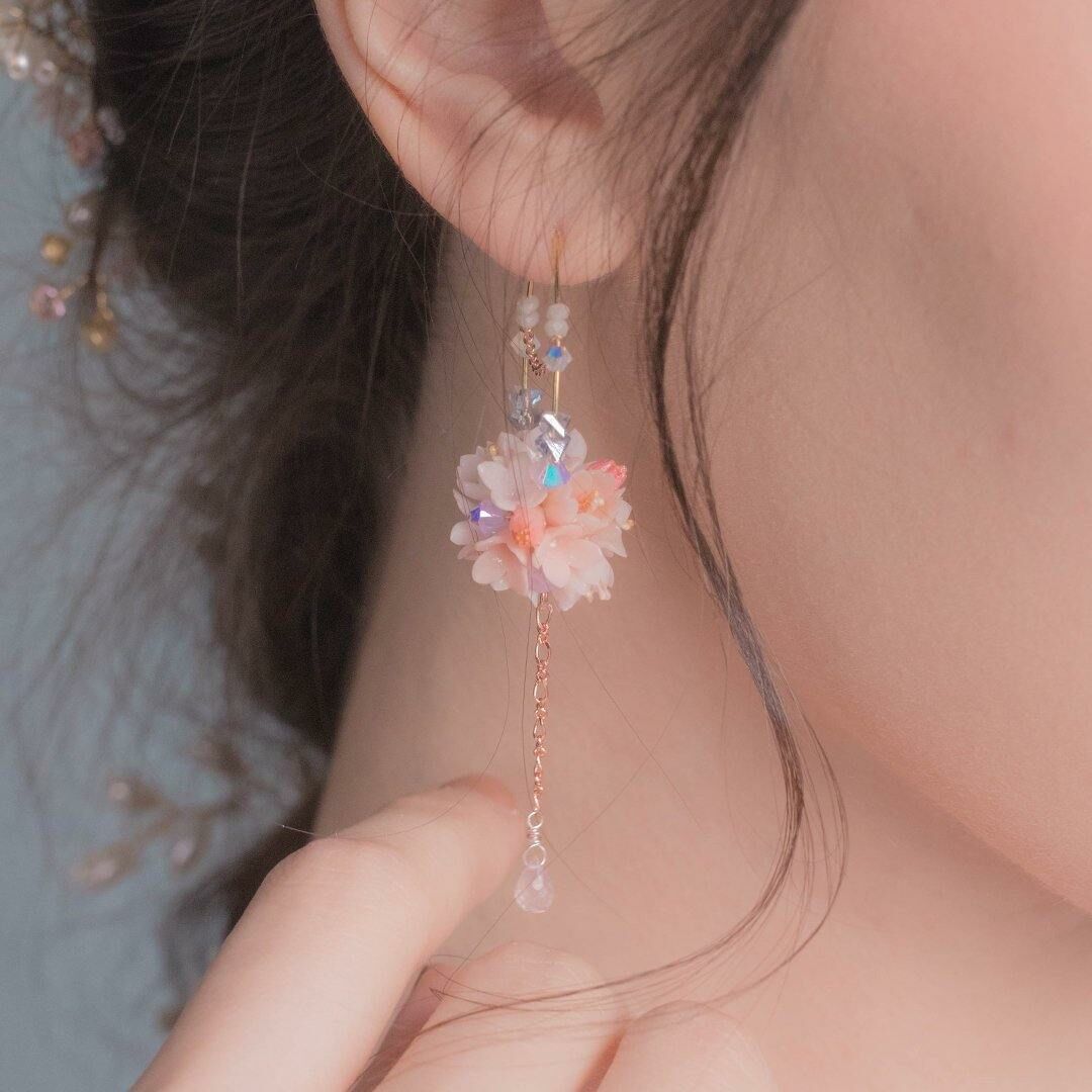 美國進口Beadsmith純銀線 | 奧地利水晶 | 日本鋯石 | 手製樹脂黏土花 | UV膠強化保護層 | 銅鍍14K金耳圈