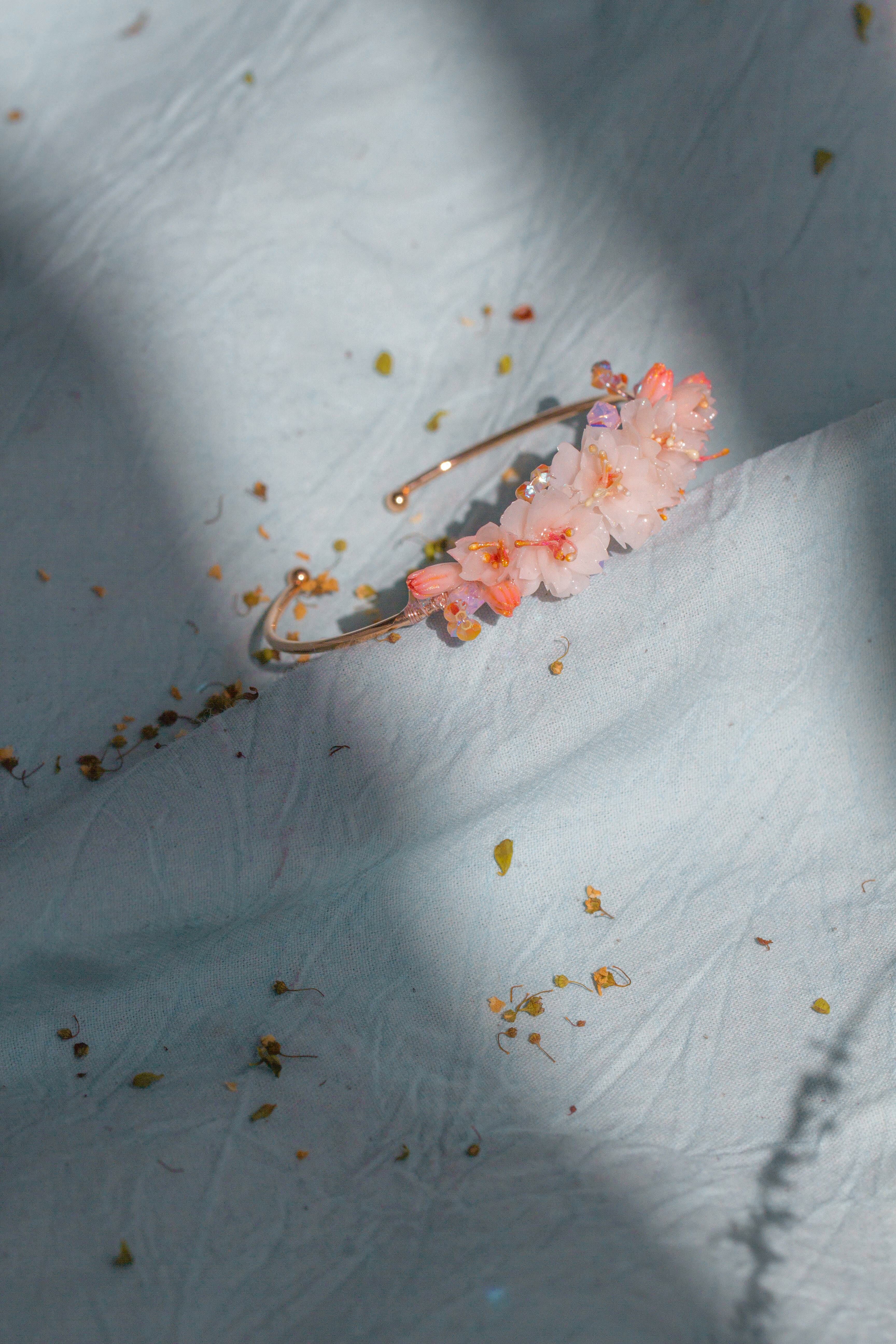 American Bead Smith Silver Wire | Austrian Crystal | Japanese Cubic Zirconia (CZ) | Handcrafted Resin Clay Flower | UV Hardening Coating | Rose-gold-plated Metal Bangle