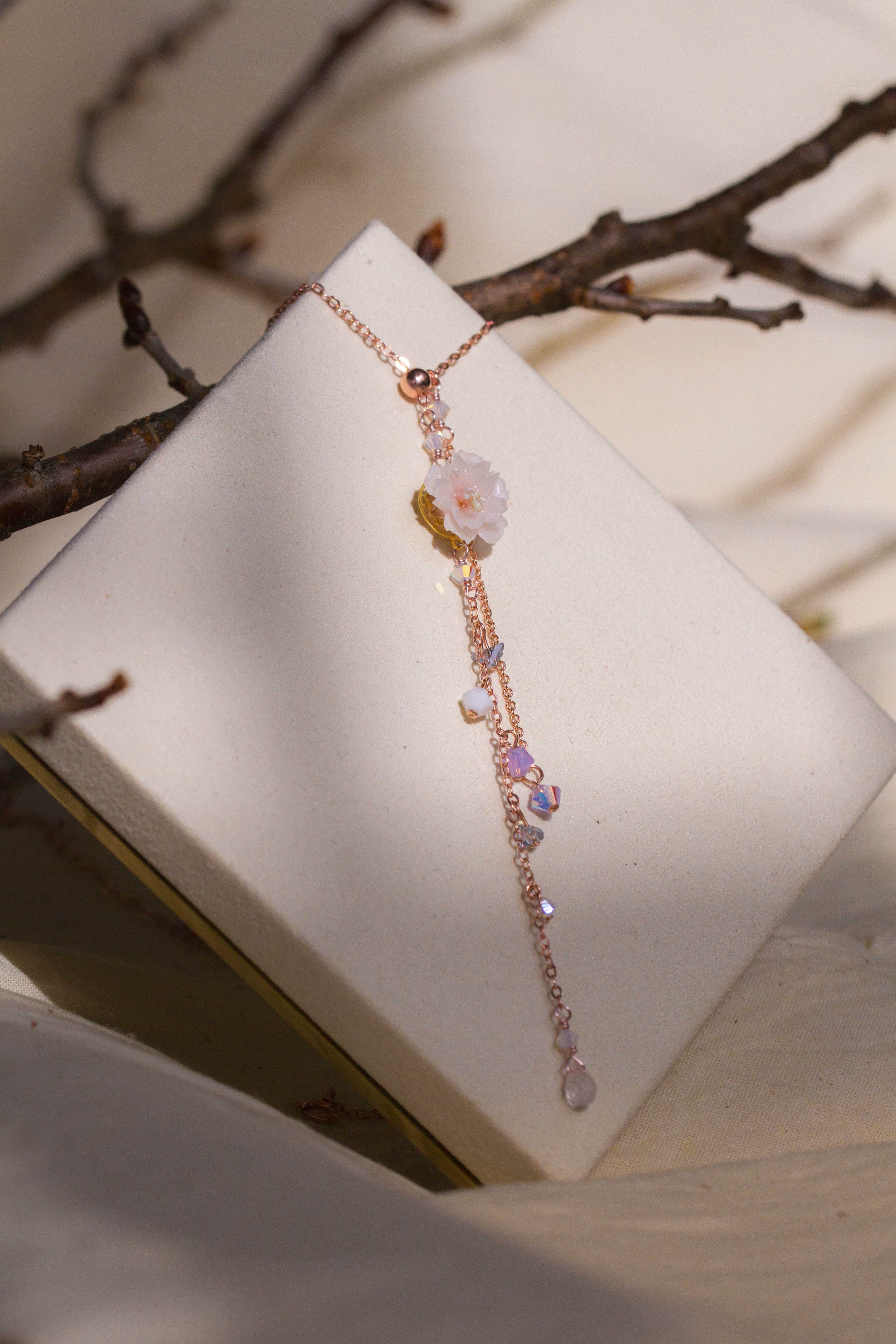 American Bead Smith Silver Wire | Austrian Crystal | Japanese Cubic Zirconia (CZ) | Handcrafted Resin Clay Flower | UV Hardening Coating | Rose-gold-plated 925 Silver