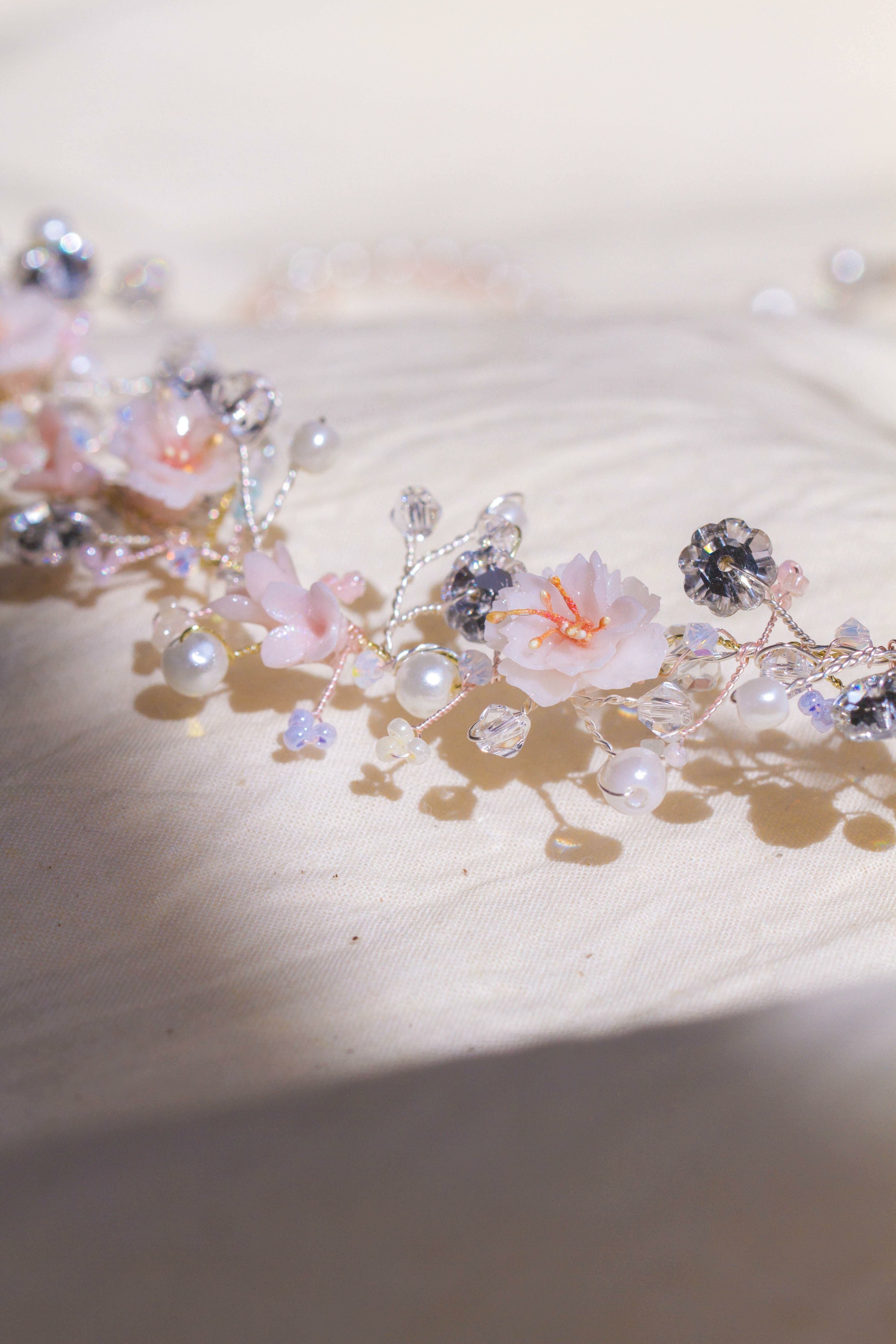 American Bead Smith Silver Wire | Austrian Crystal | Japanese Cubic Zirconia (CZ) | Handcrafted Resin Clay Flower | UV Hardening Coating | Silver-plated Metal Headband