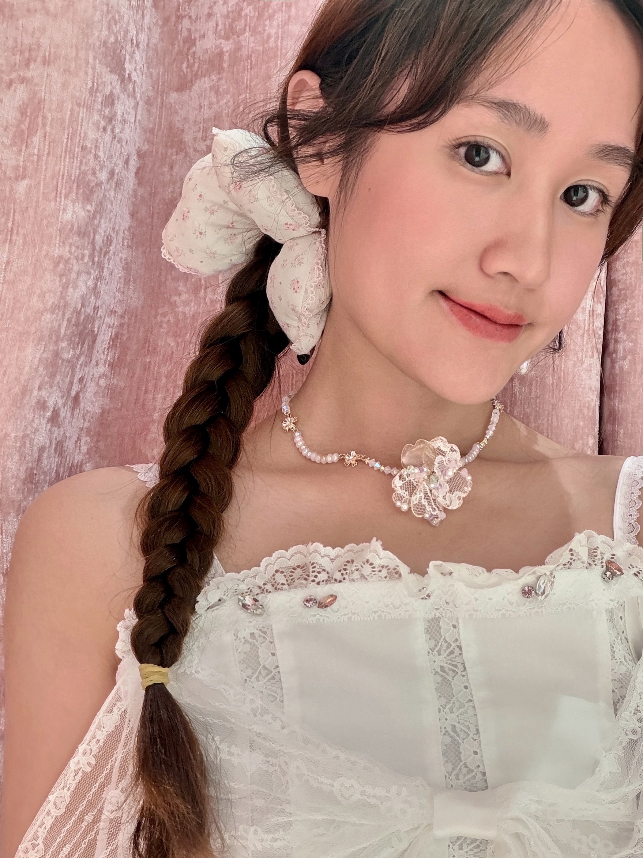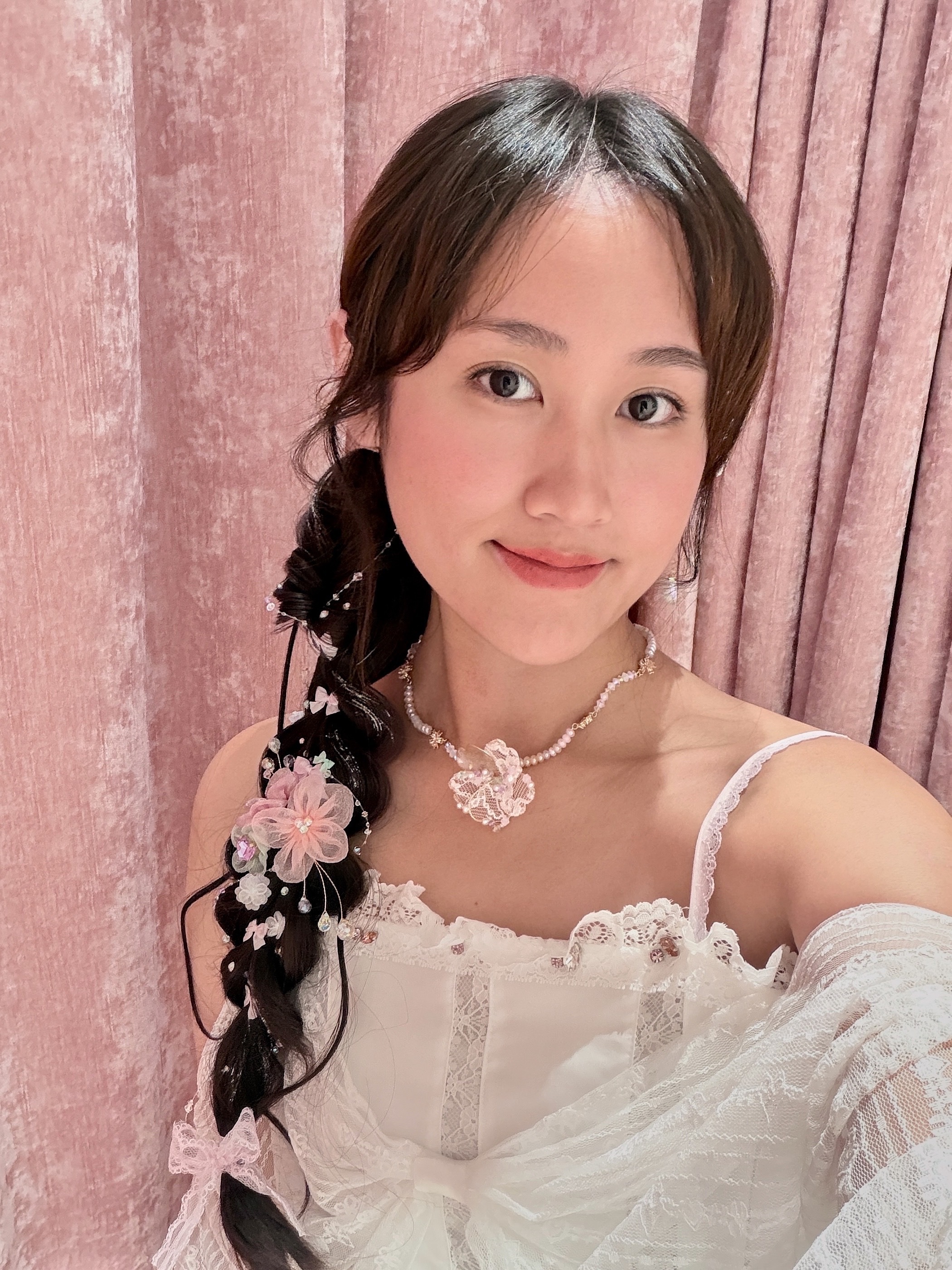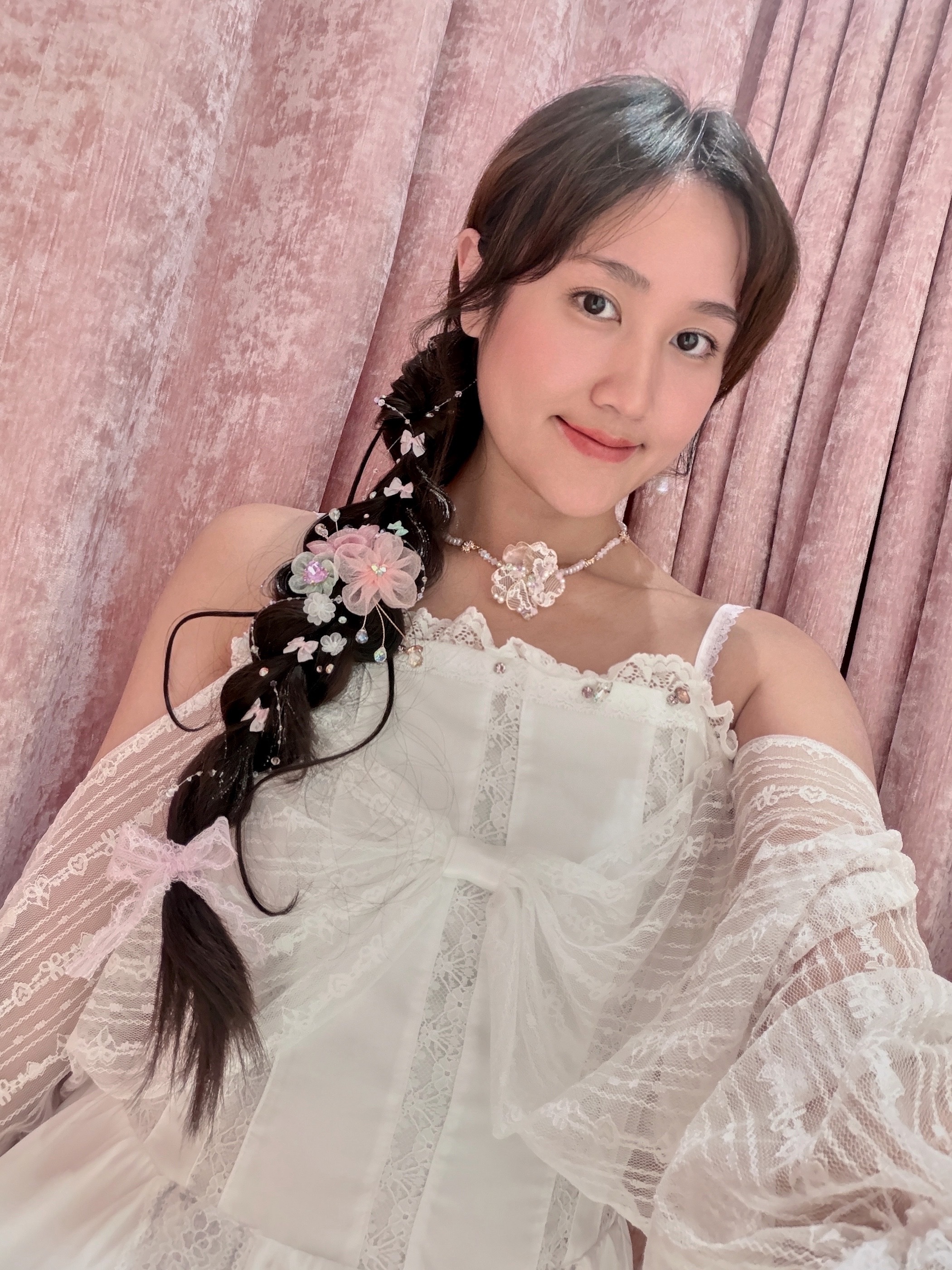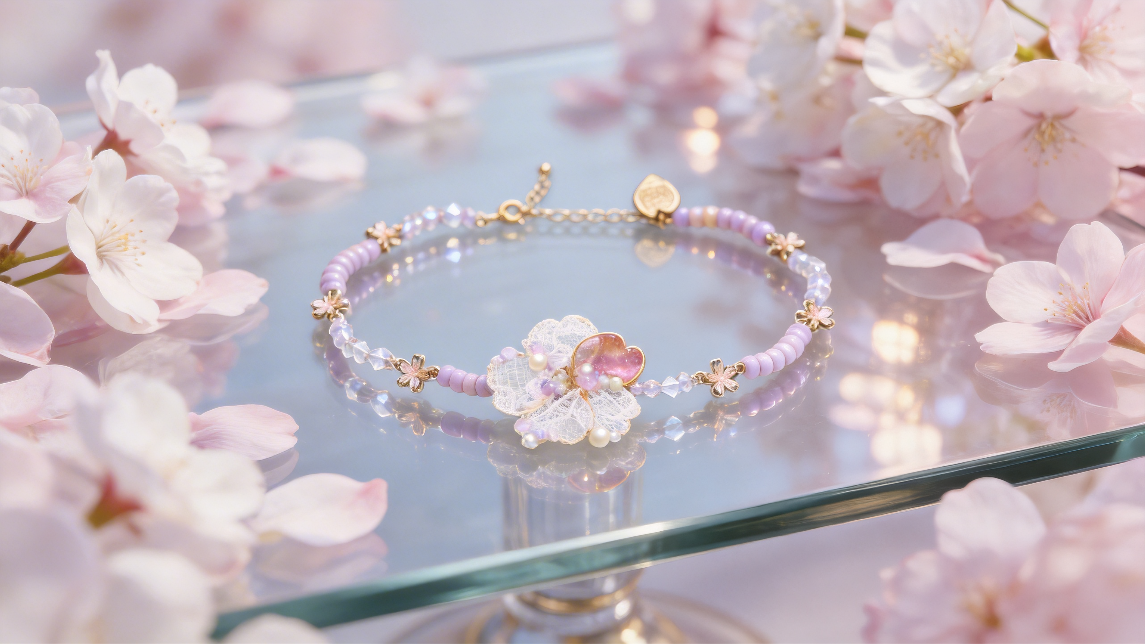 細緻米珠以柔和粉色調串連,呈現帶有少女氣息的清新質感。每一段珠飾以微微弧形排列,如呼吸般輕柔延展。中央以金線蕾絲花結合櫻花元素,層層細節在光線下展現柔美而細膩的光澤。