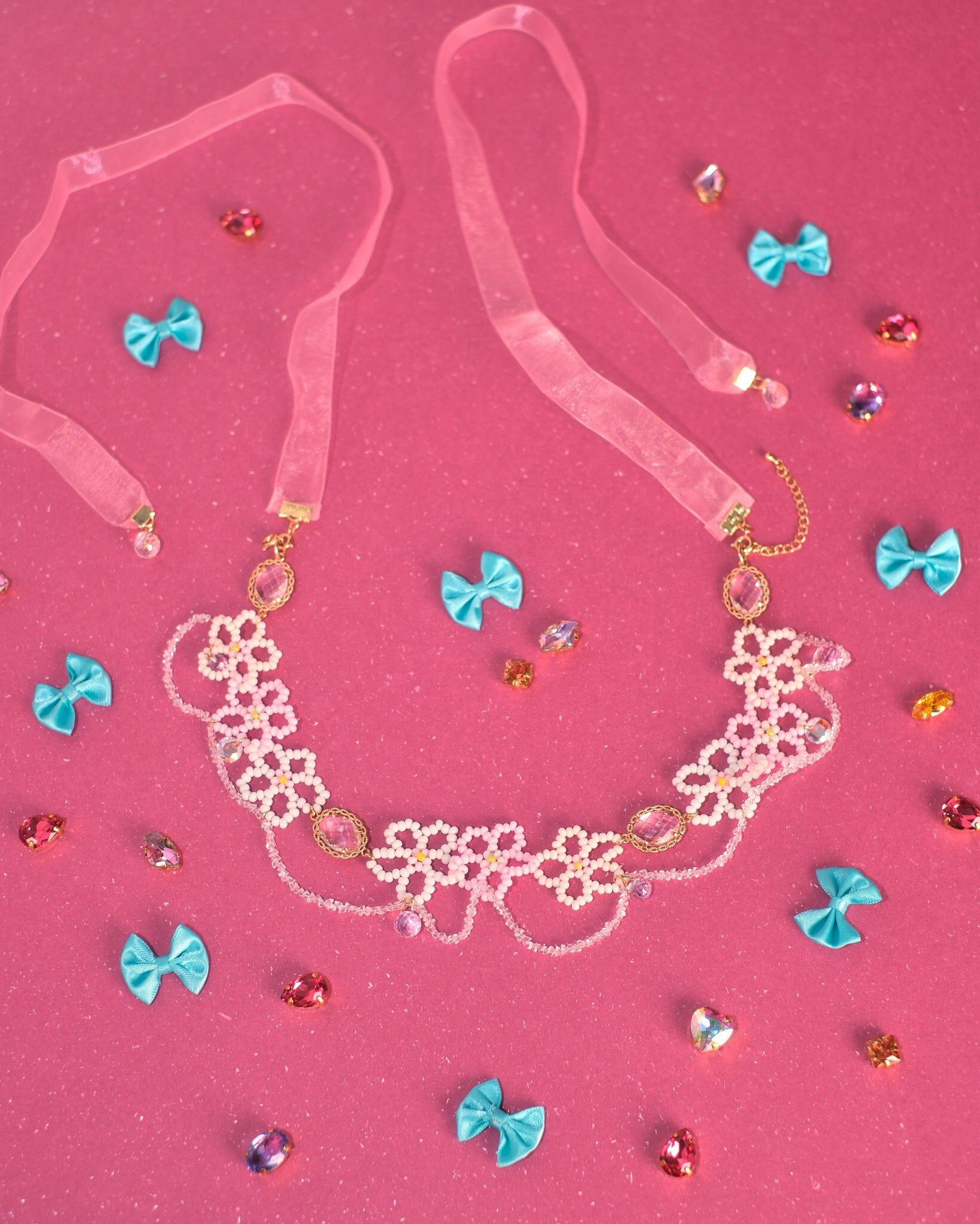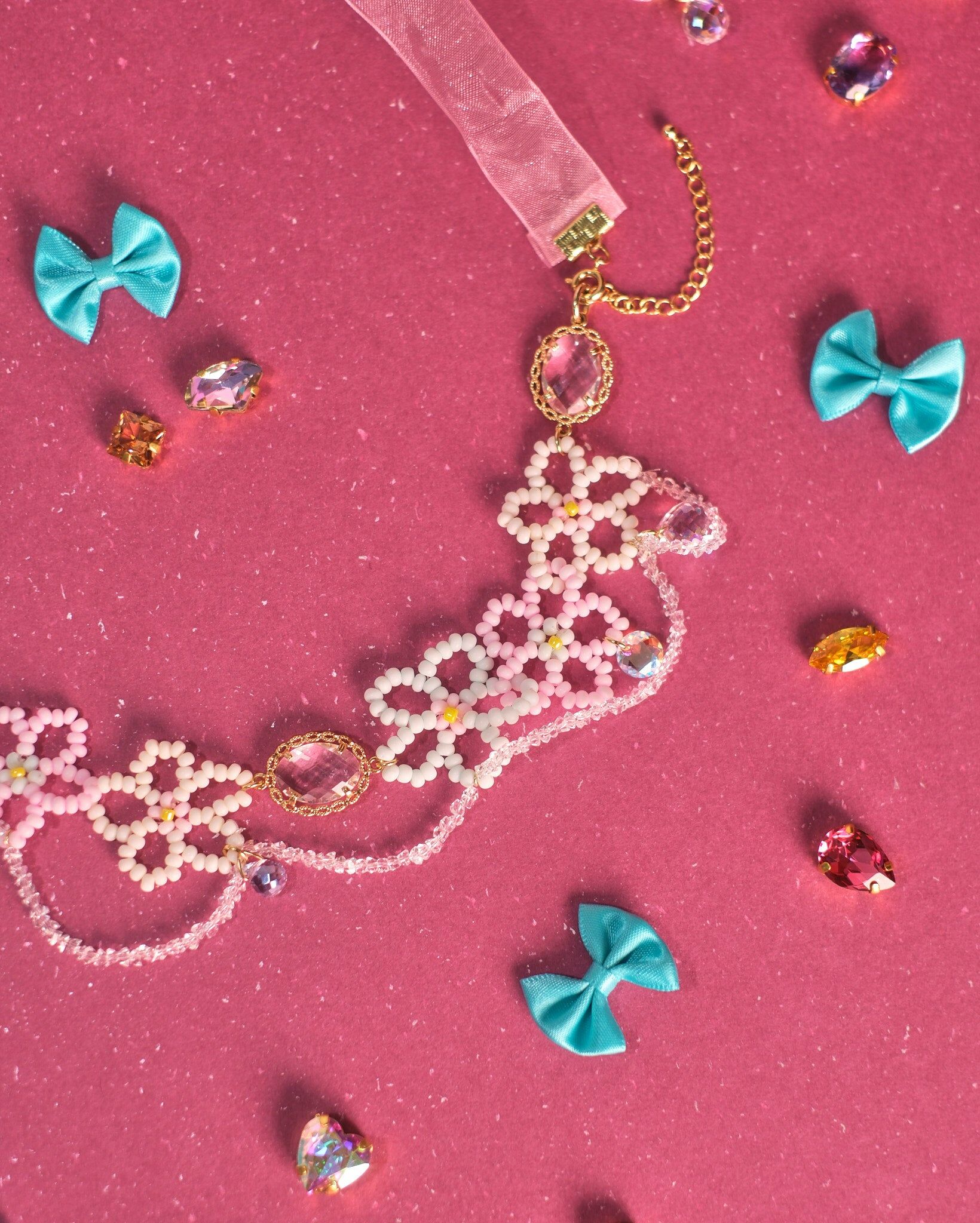 Y2K style! 新世代玩味十足的Y2K風格,每一顆色彩繽紛的米珠都是人手編織而成,織出了少女心中的粉紅泡泡,更可以作為短項鏈或髮使用,一物兩用。配搭鑲邊鋯石,為作品添上些許現代感,配搭清新的春夏裝,為造型帶來亮點。