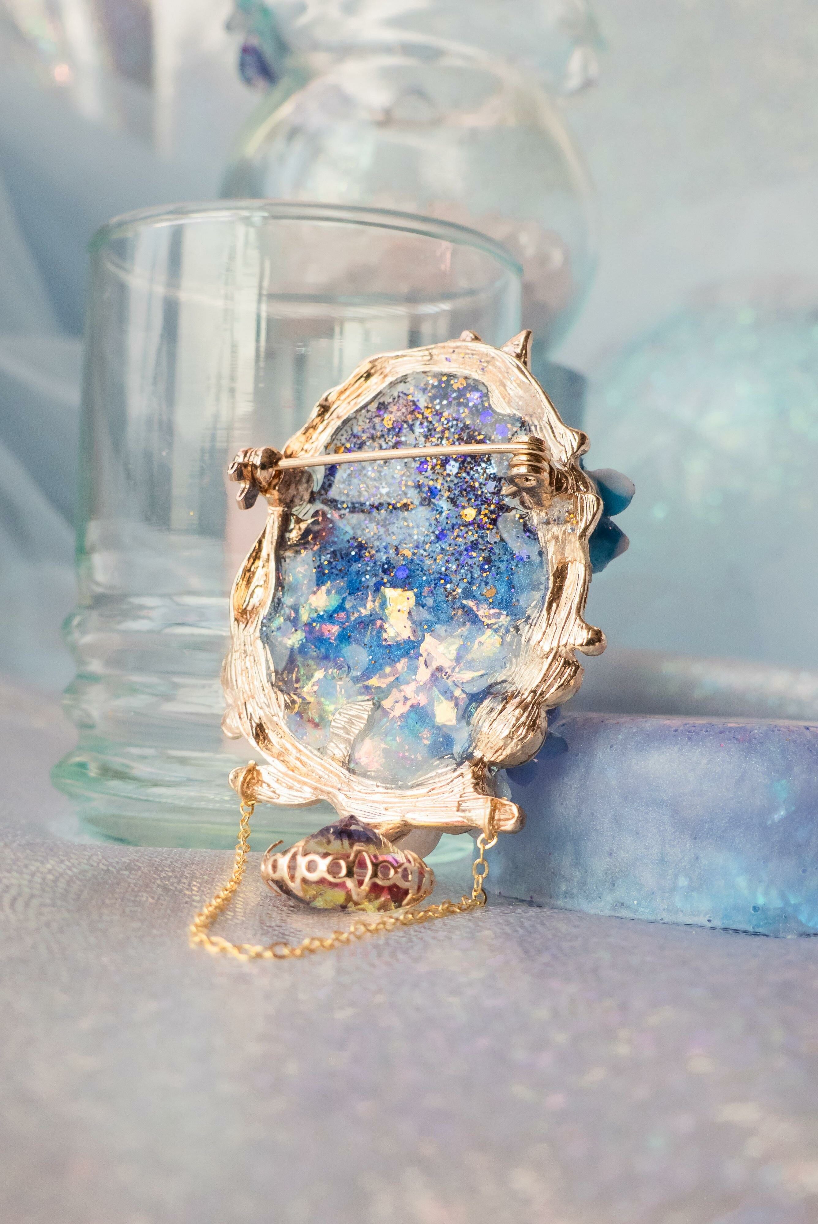 鍍金銀線 | 施華洛世奇水晶 | 施華洛世奇水晶珍珠 | 淡水珍珠 | 漸變色水晶吊墜 | 手製樹脂黏土花 | 幻彩樹脂膠 | UV膠強化保護層 | 鍍金胸針