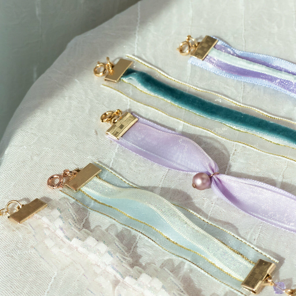 鍍金線 | 施華洛世奇水晶 | 手製樹脂黏土花 | UV膠強化保護層 | 絲帶布料