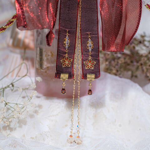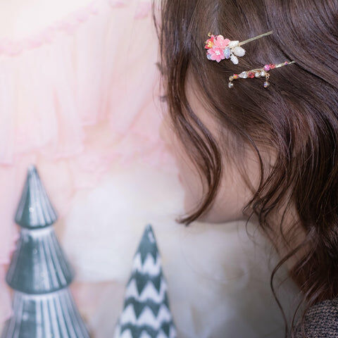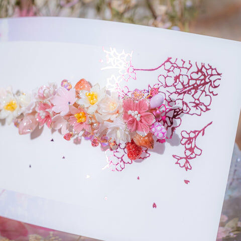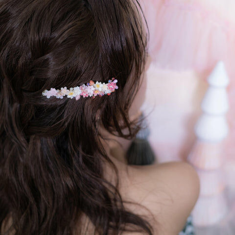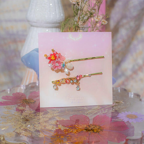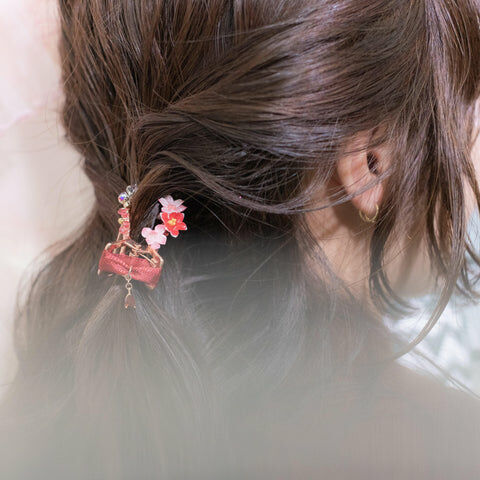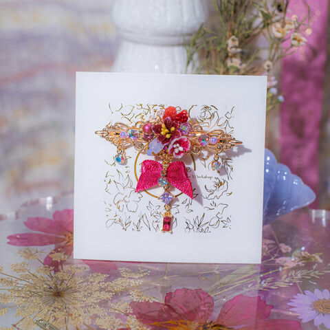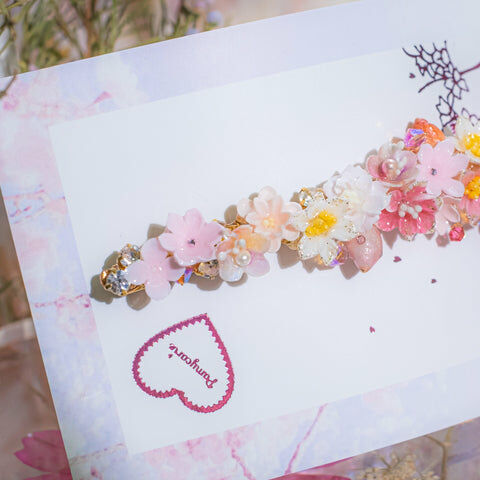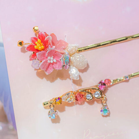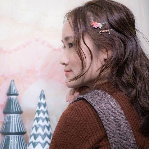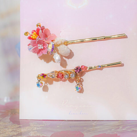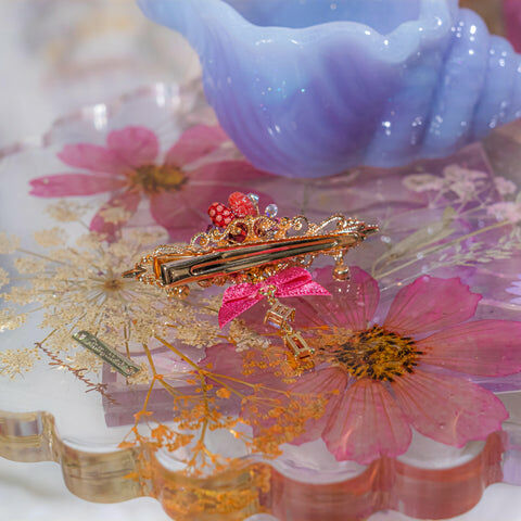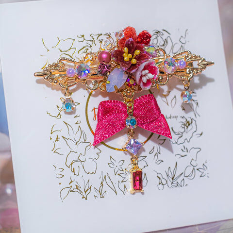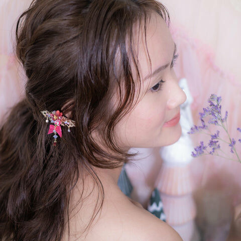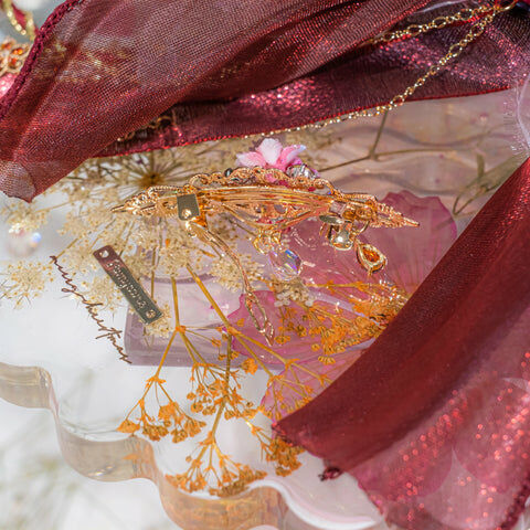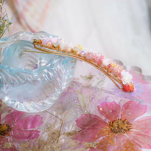 鍍金線 | 施華洛世奇水晶 | 手製樹脂黏土花 | UV膠強化保護層 | 金屬髮夾