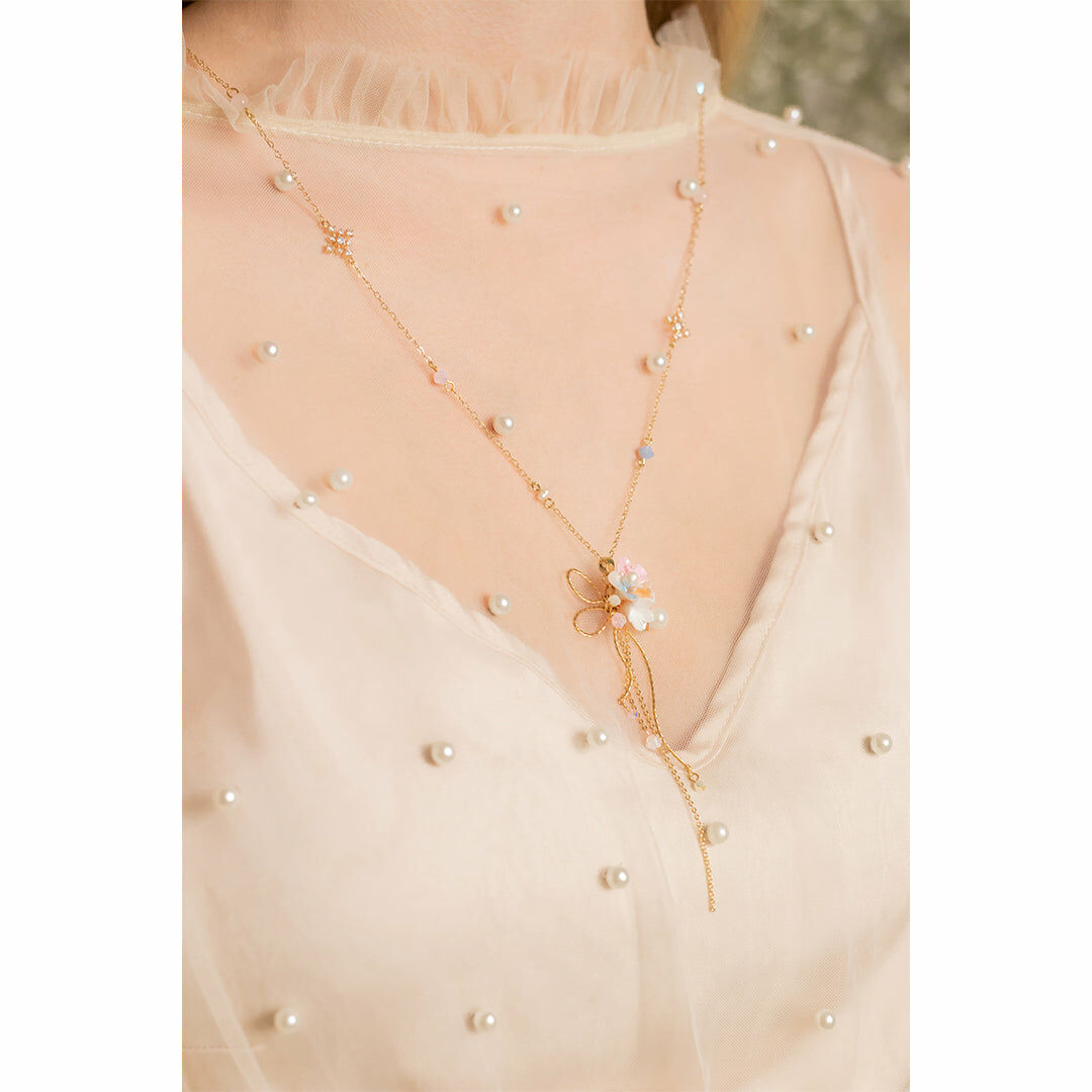 美國進口Beadsmith純銀線 | 奧地利水晶 | 手製樹脂黏土花 | UV膠強化保護層 | 鍍14K金925銀鏈