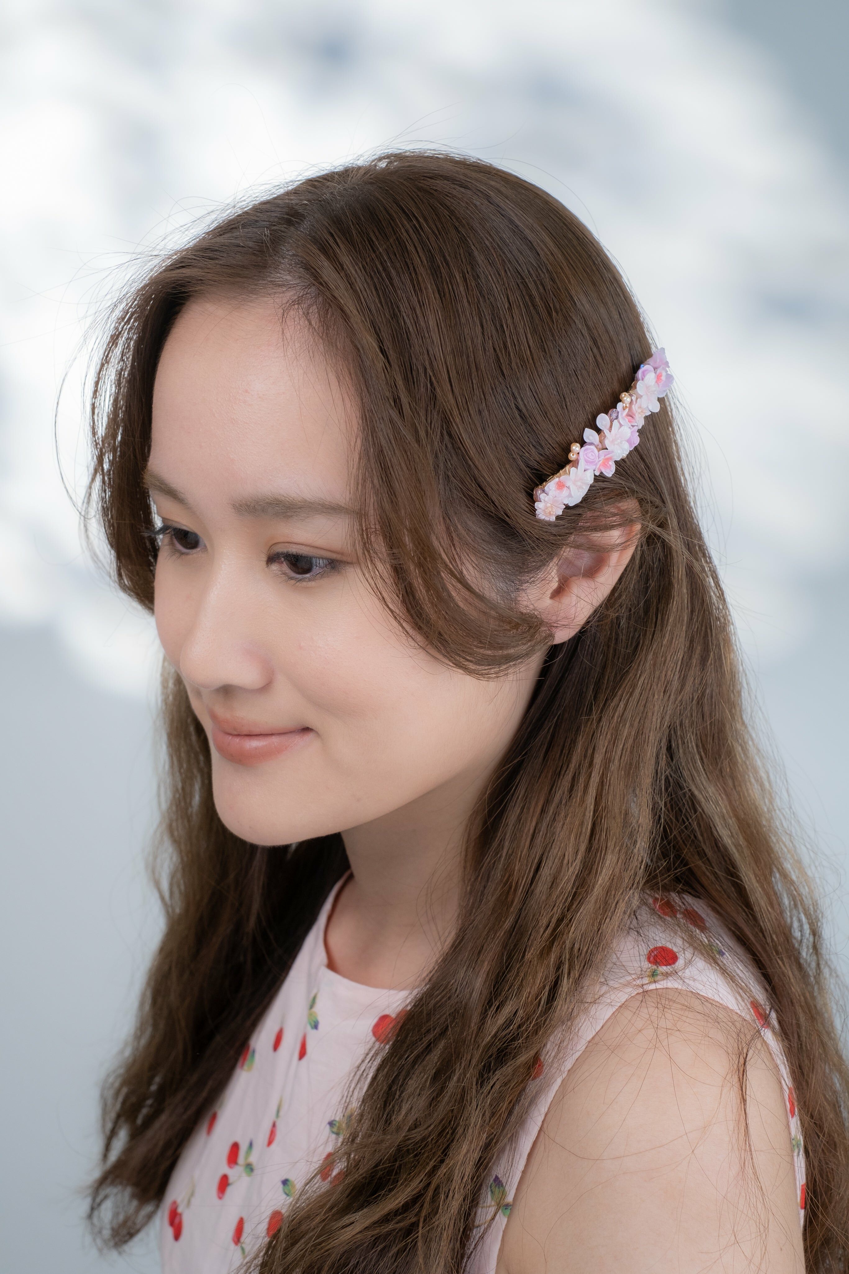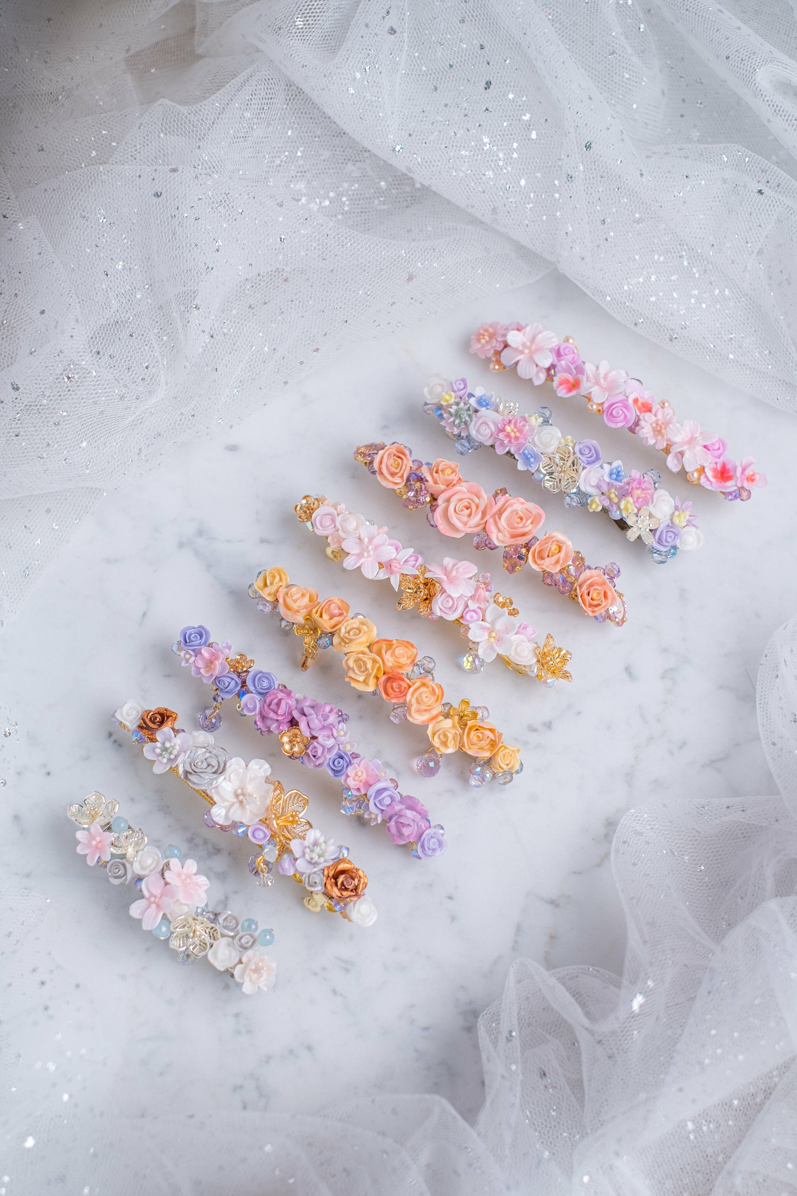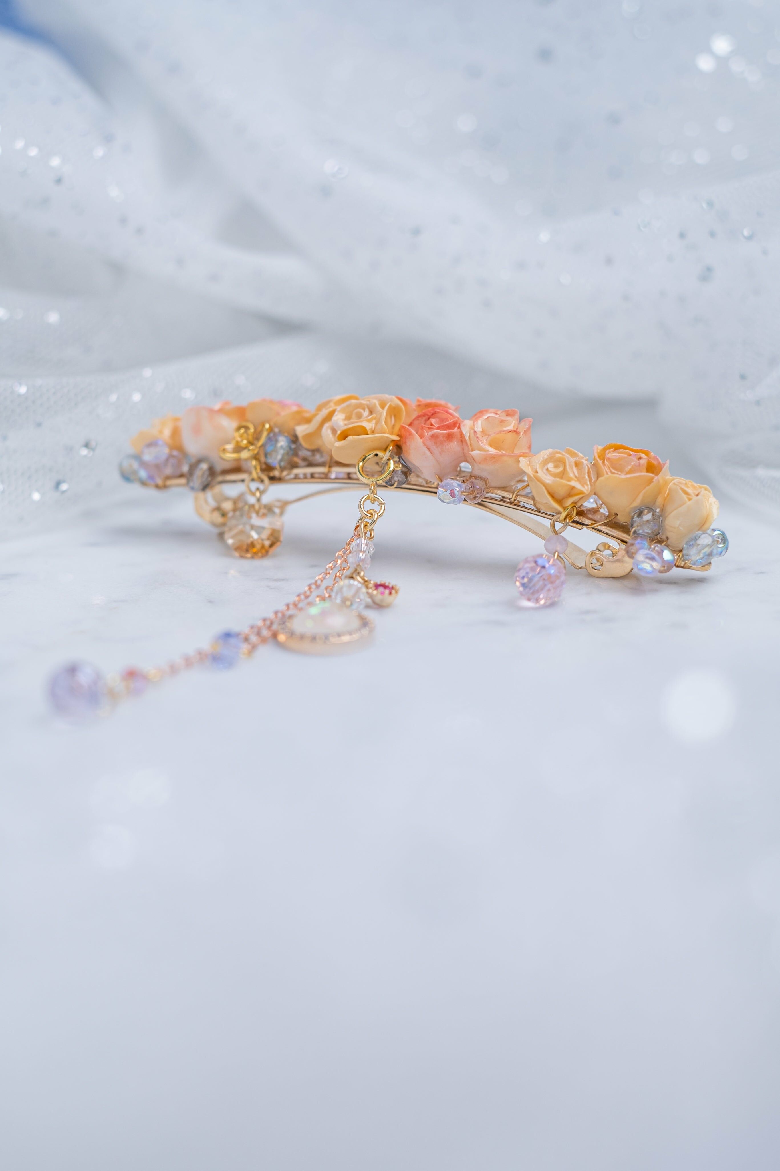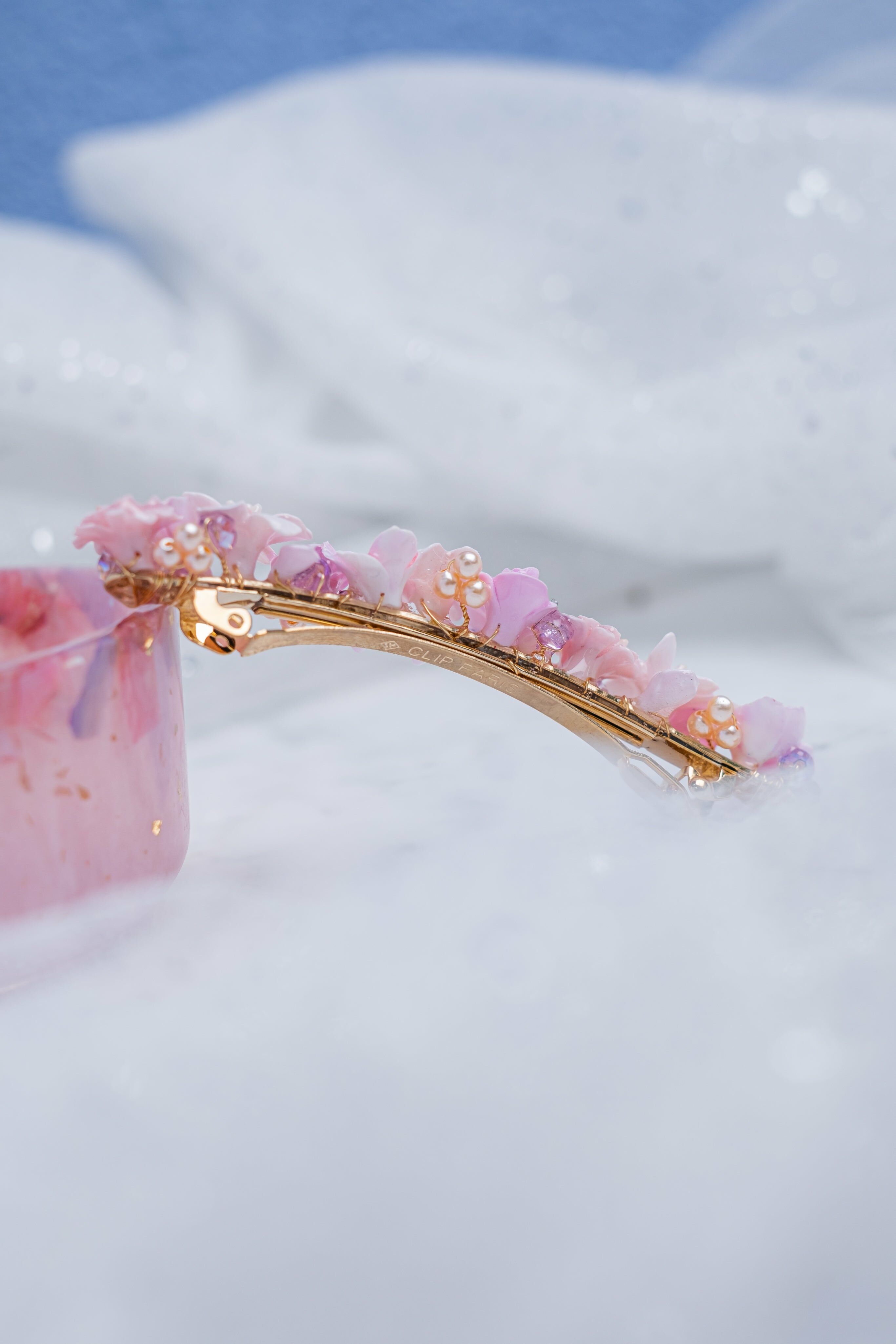 鍍金線 | 施華洛世奇水晶 | 手製樹脂黏土花 | UV膠強化保護層 | 鍍金彈弓髮夾