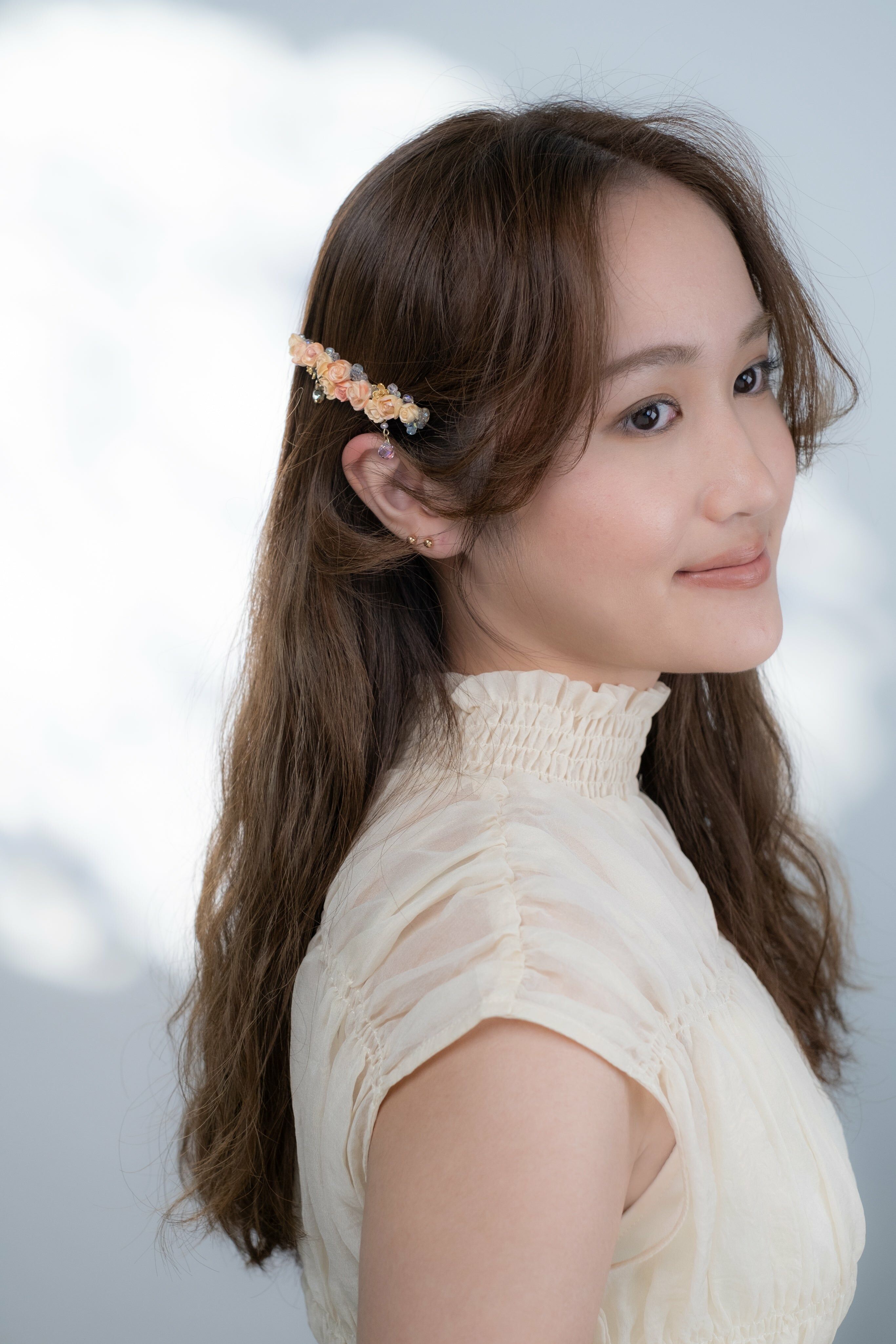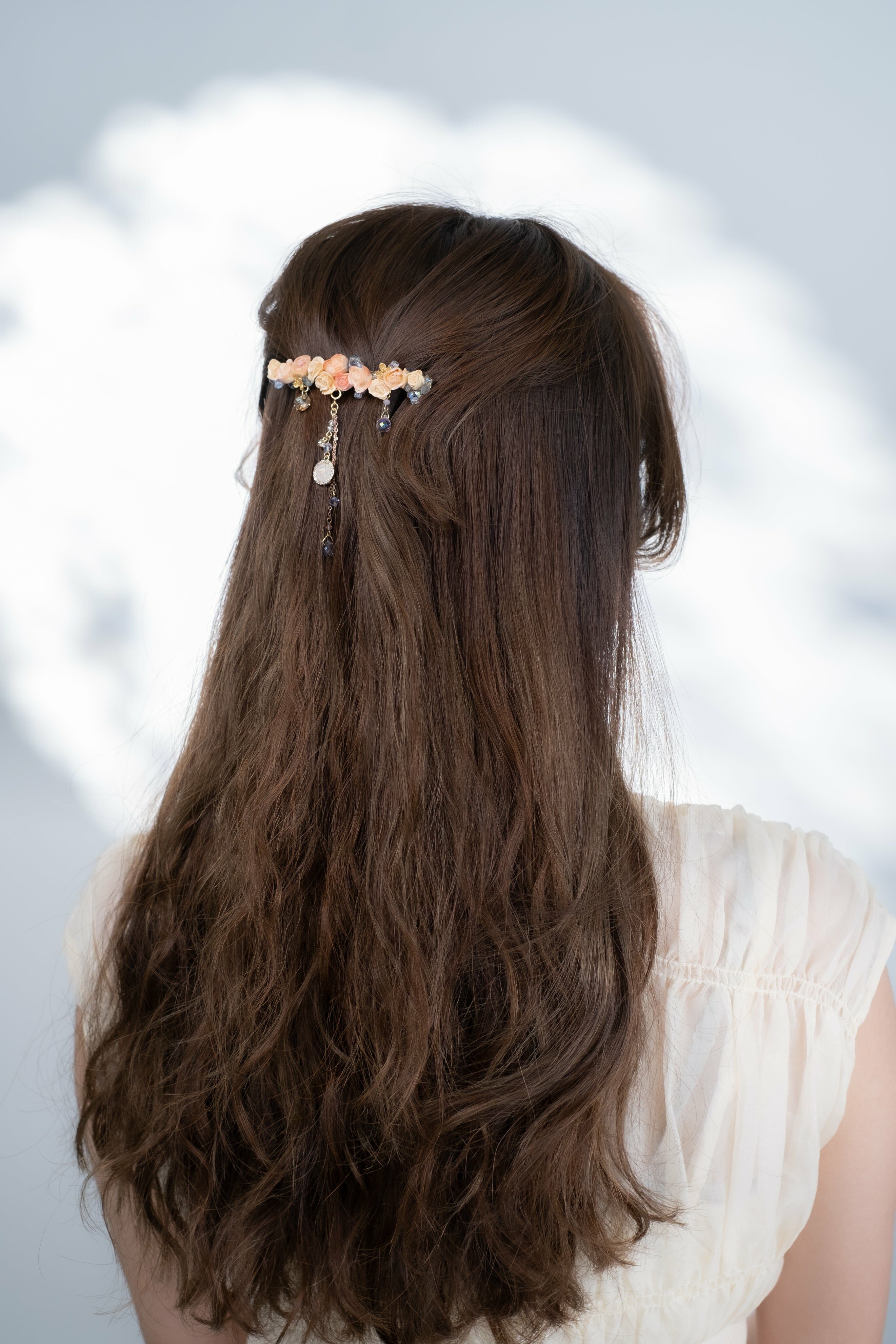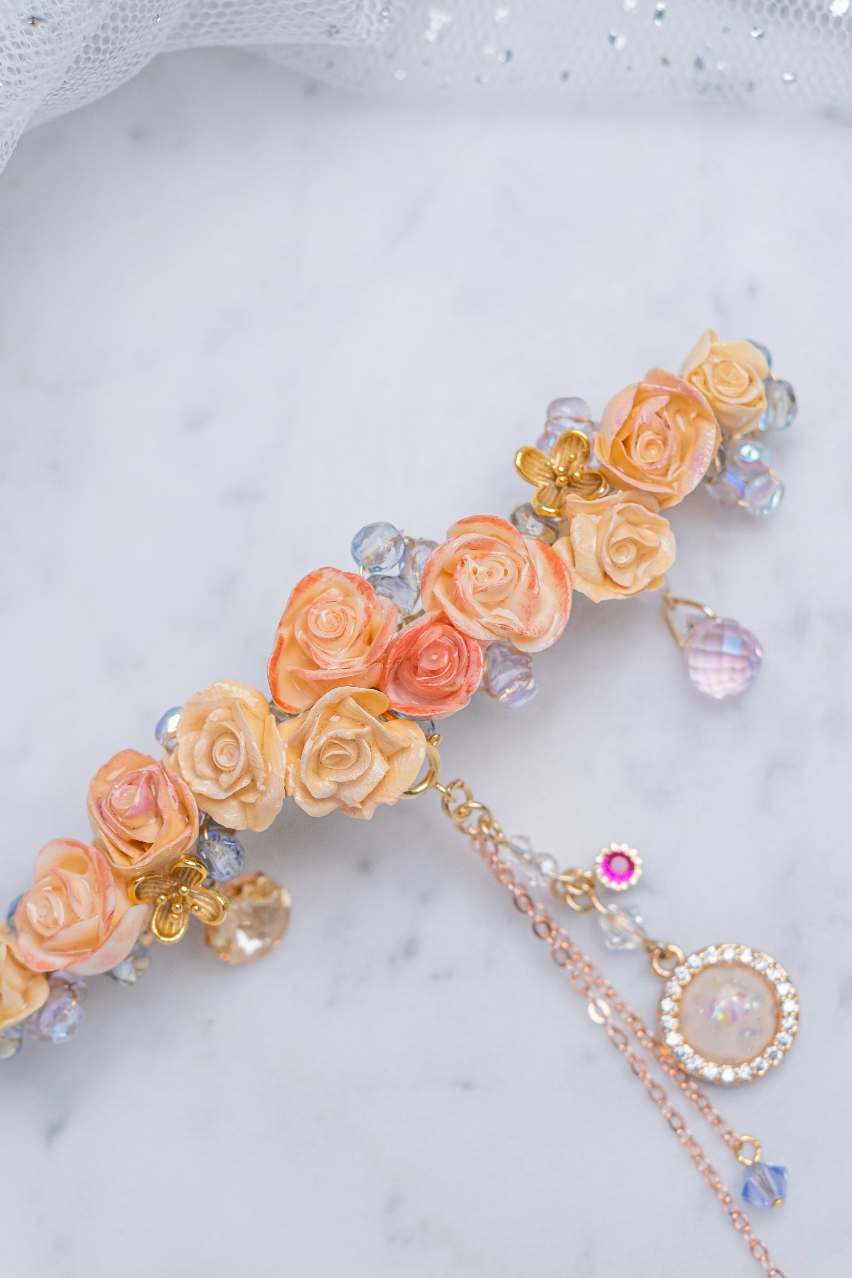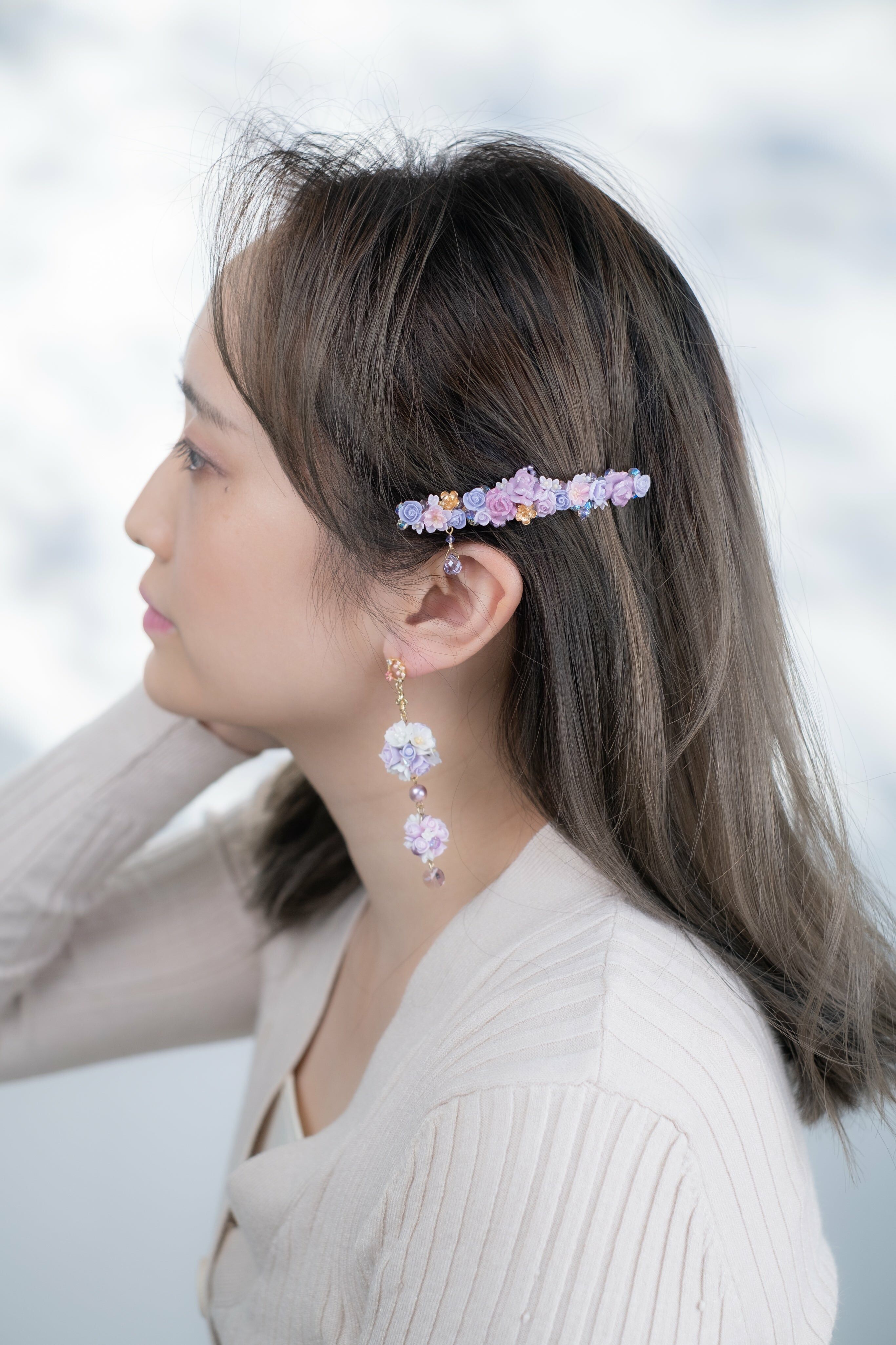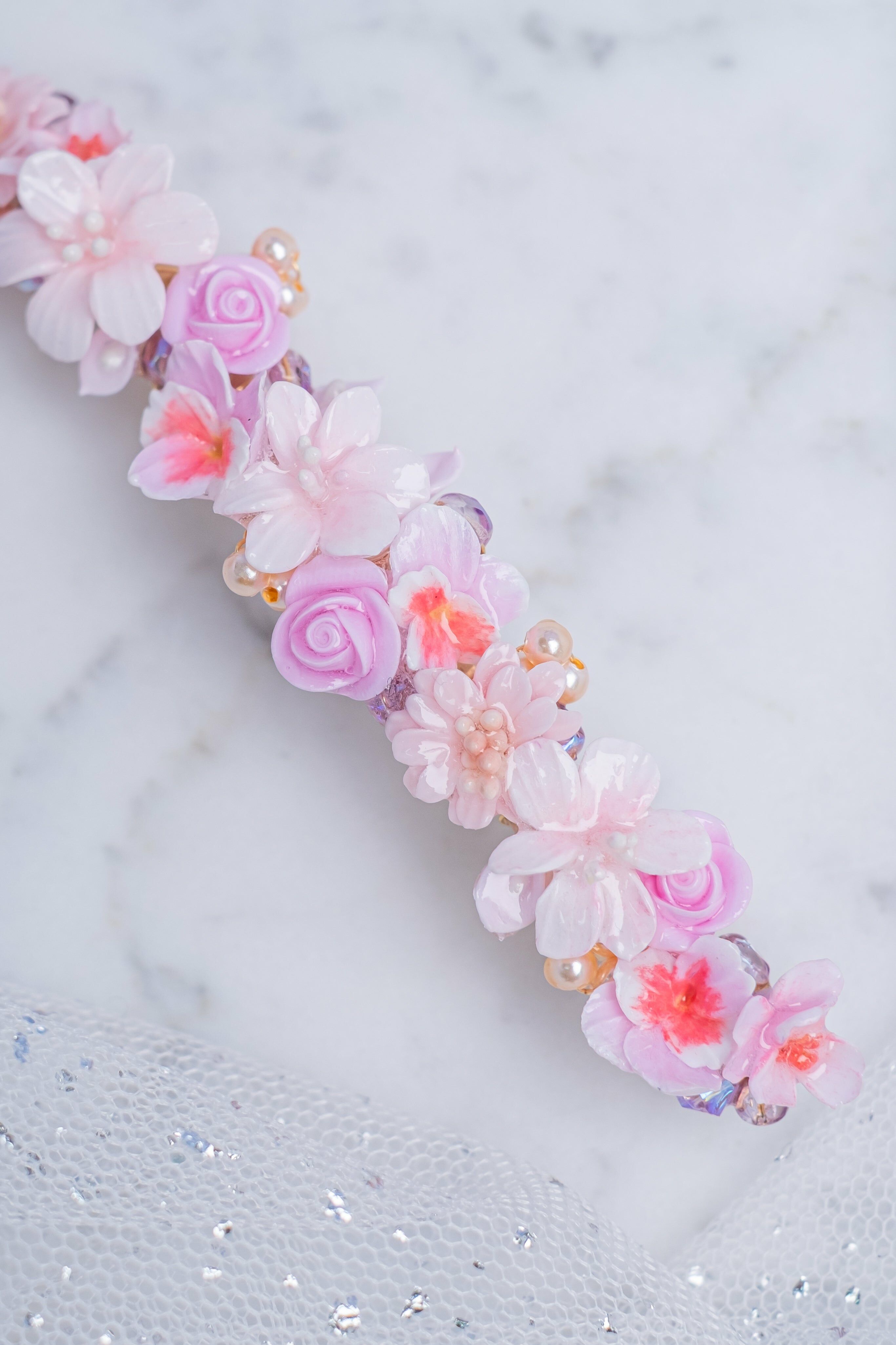 鍍金線 | 施華洛世奇水晶 | 手製樹脂黏土花 | UV膠強化保護層 | 鍍金彈弓髮夾