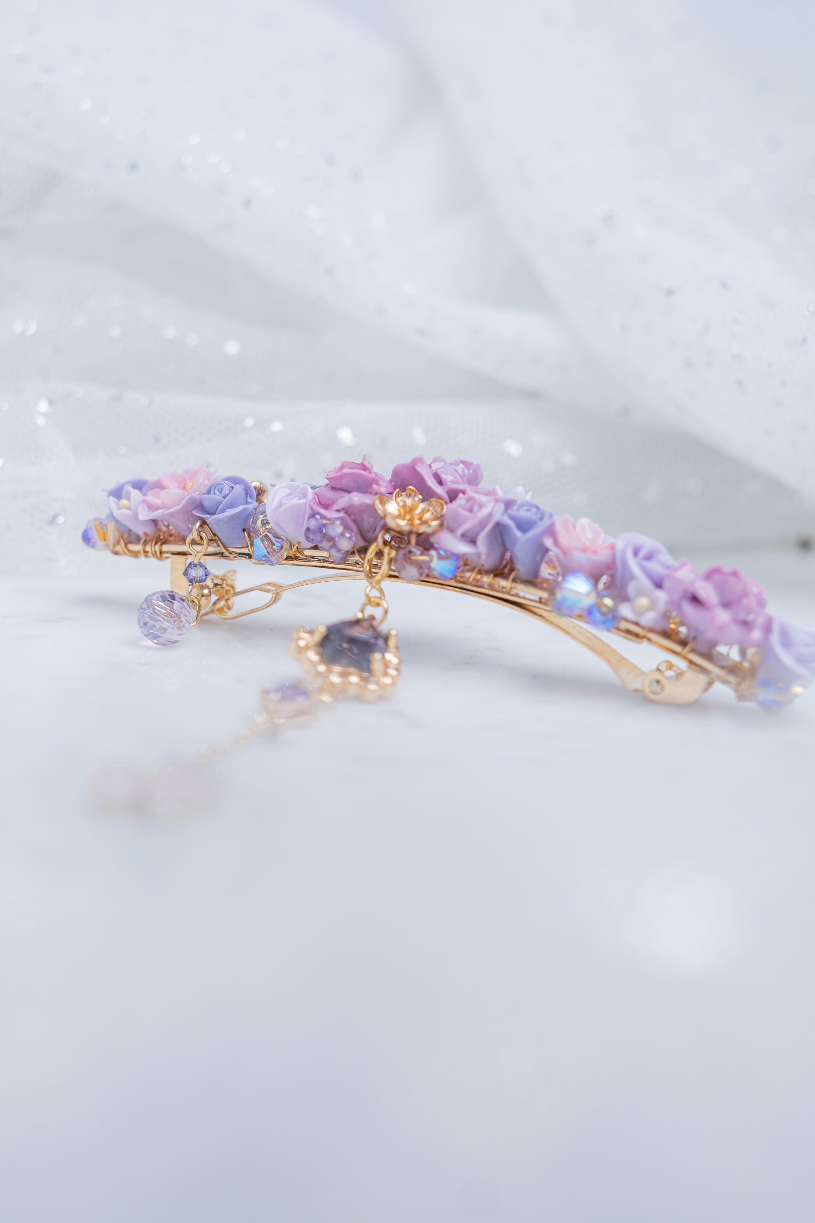 Gold Plated Artistic Wire | Swarovski Crystal Bead | Handcrafted Resin Clay Flower | UV Hardening Coating | Plated French Barrette Hair Clip