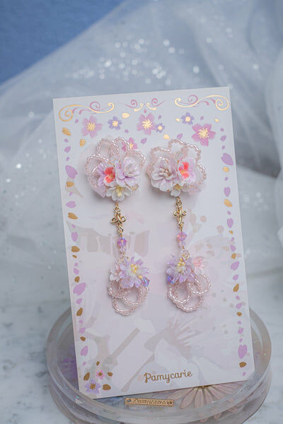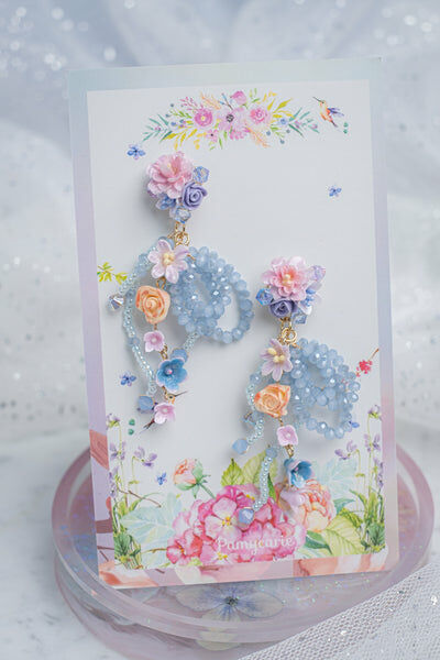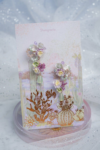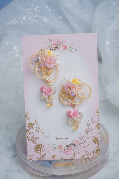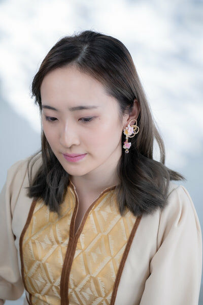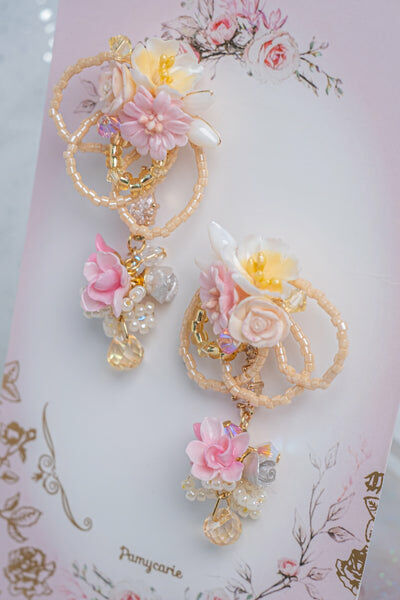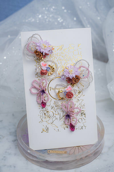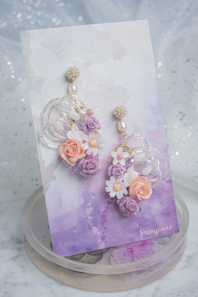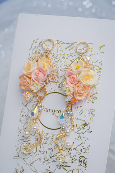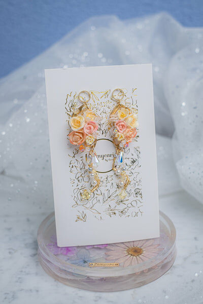 鍍金線 | 施華洛世奇水晶 | 手製樹脂黏土花 | UV膠強化保護層 | 鍍金925純銀耳釘