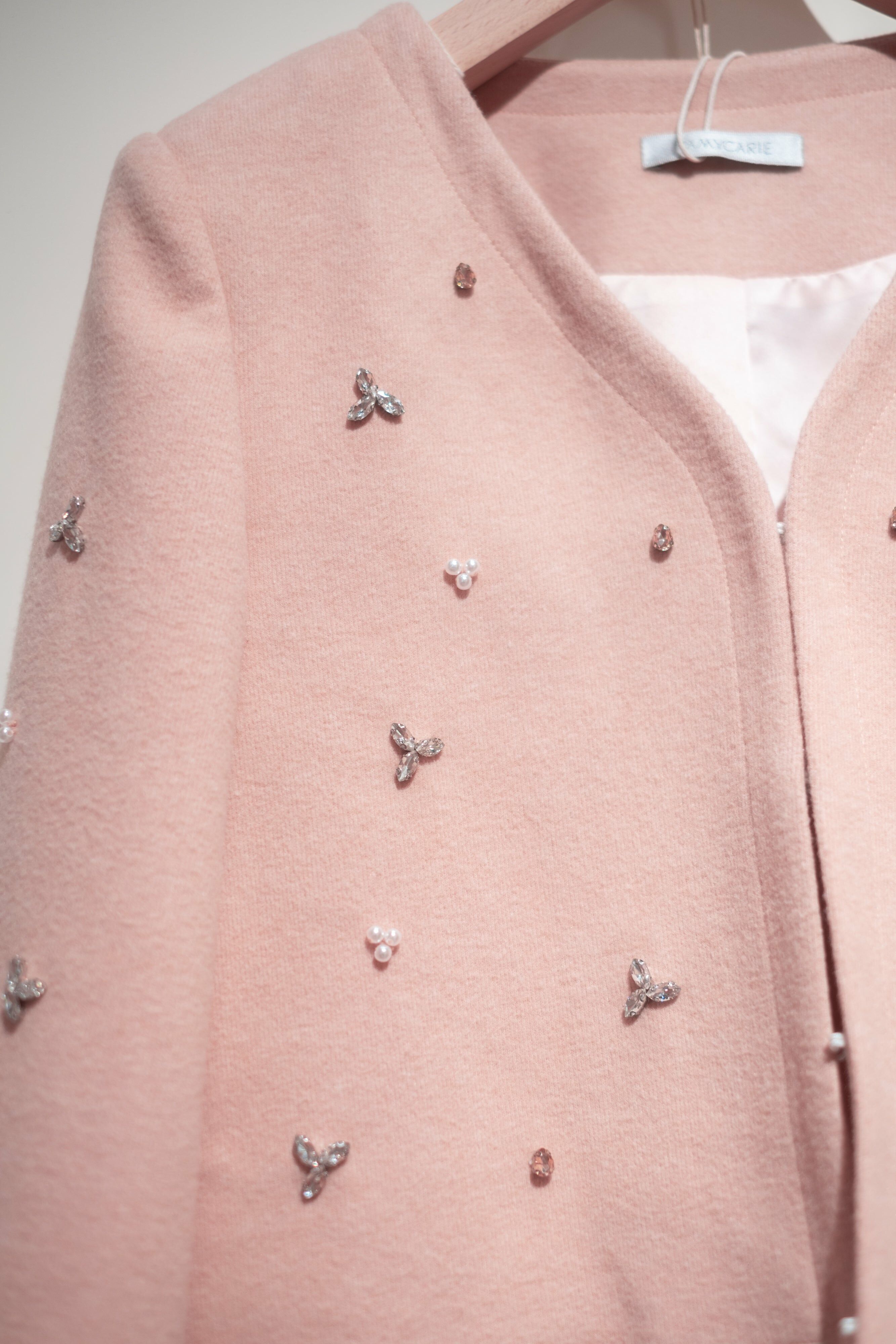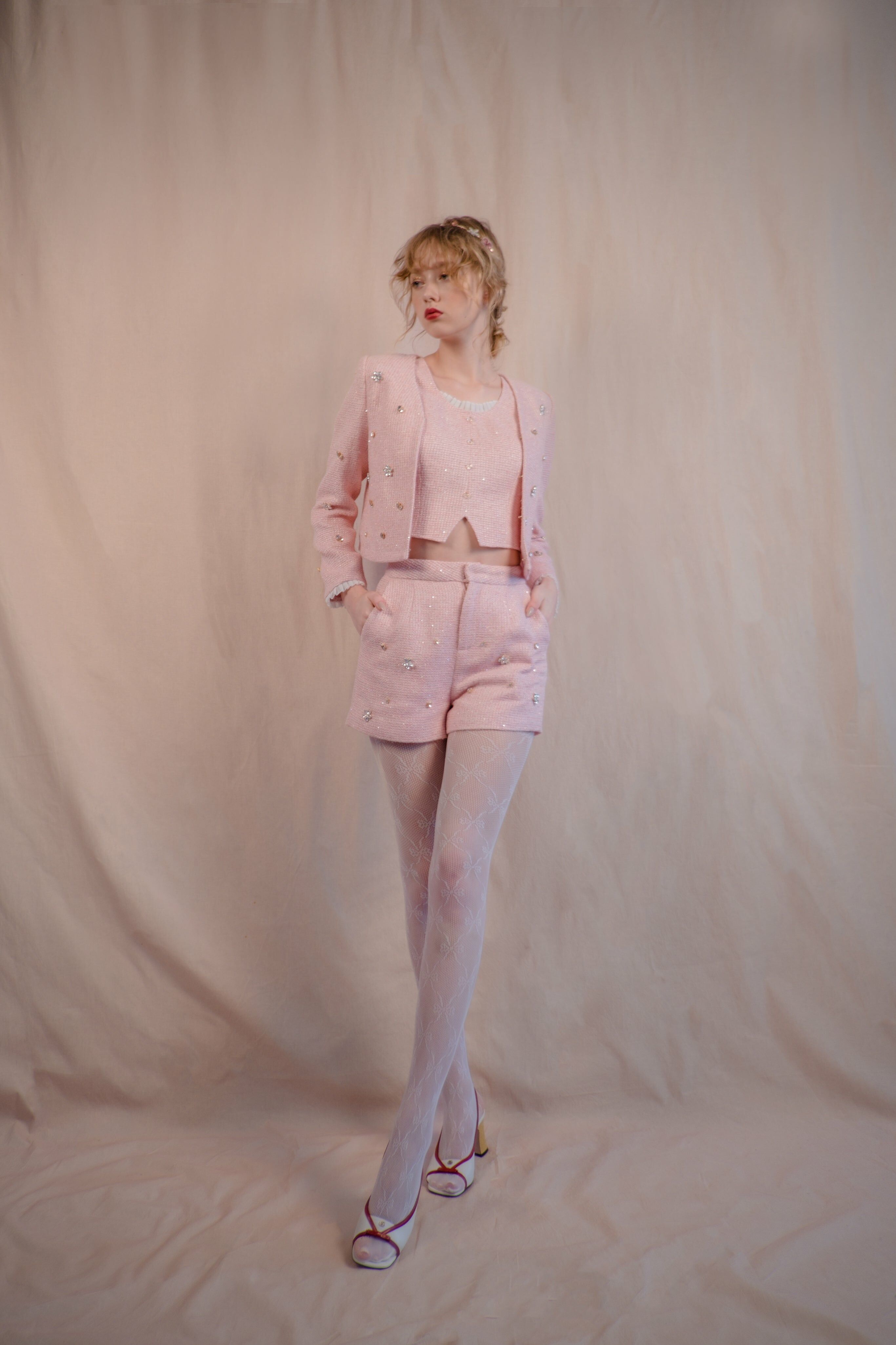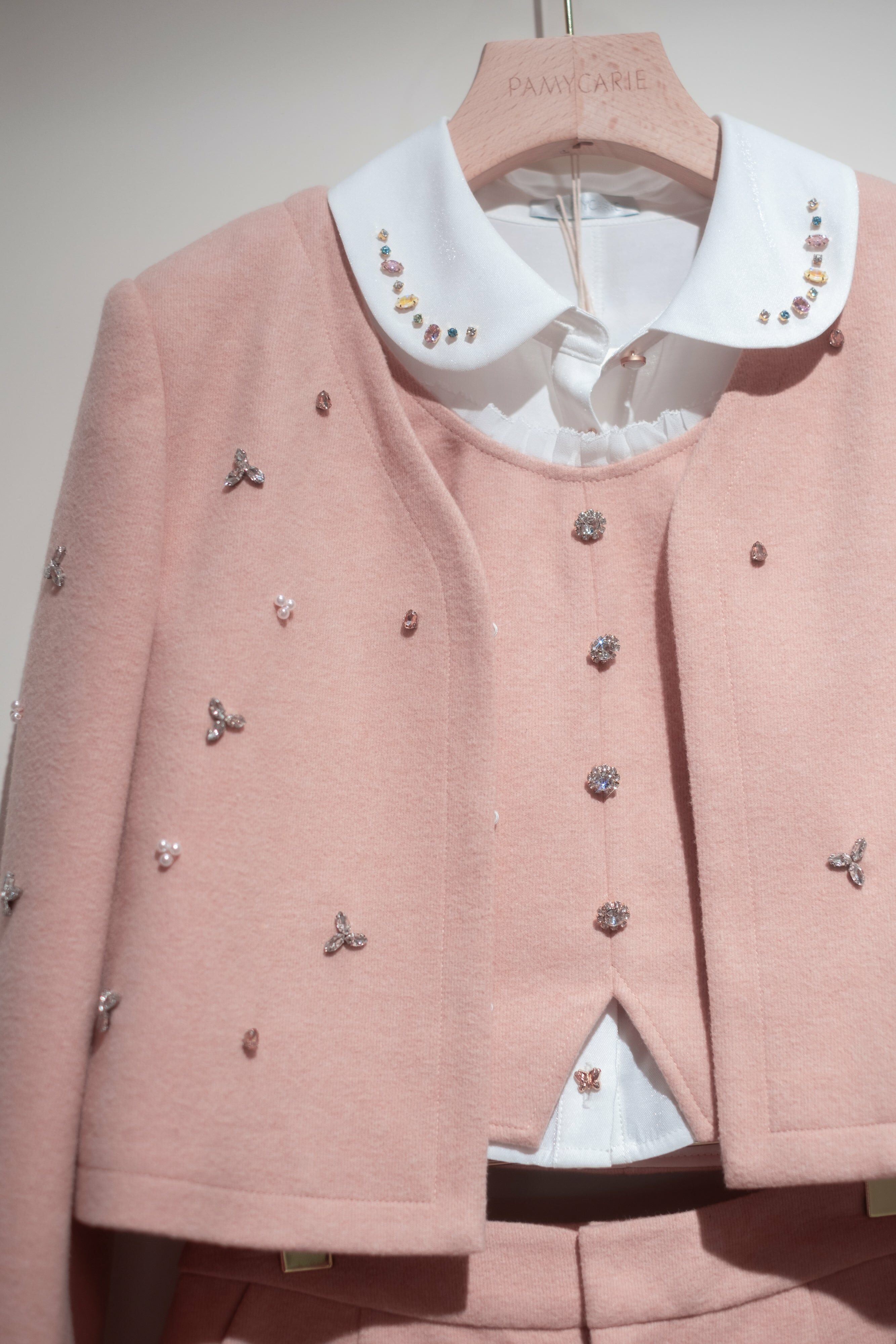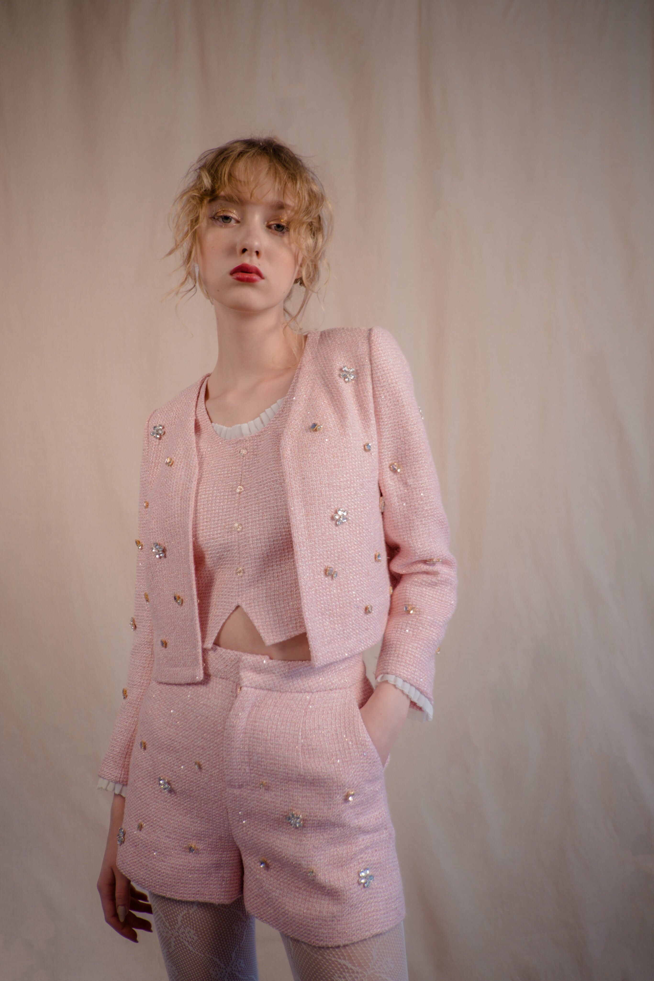 CZ Embroidered Tweed Jacket/Vest/Shorts (Pink/Black/Knit Dusty Pink)