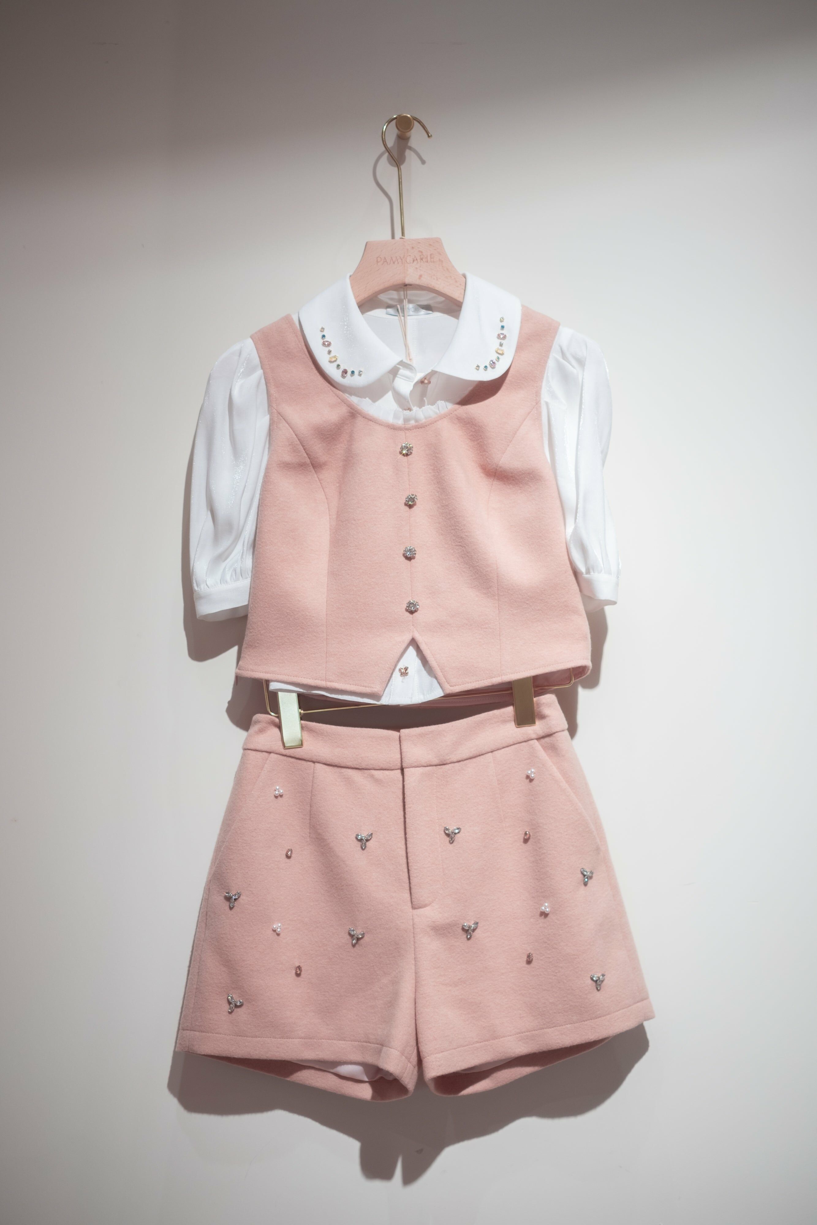 滿開釘花套裝(外套/馬甲/短褲) (粉色/黑色/針織灰粉)