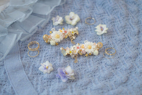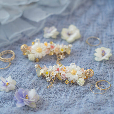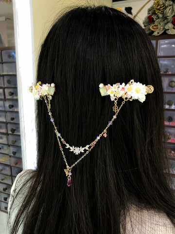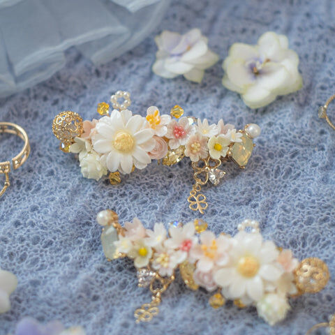 鍍金線 | 施華洛世奇水晶 | 手製樹脂黏土花 | UV膠強化保護層 | 鍍金髮夾