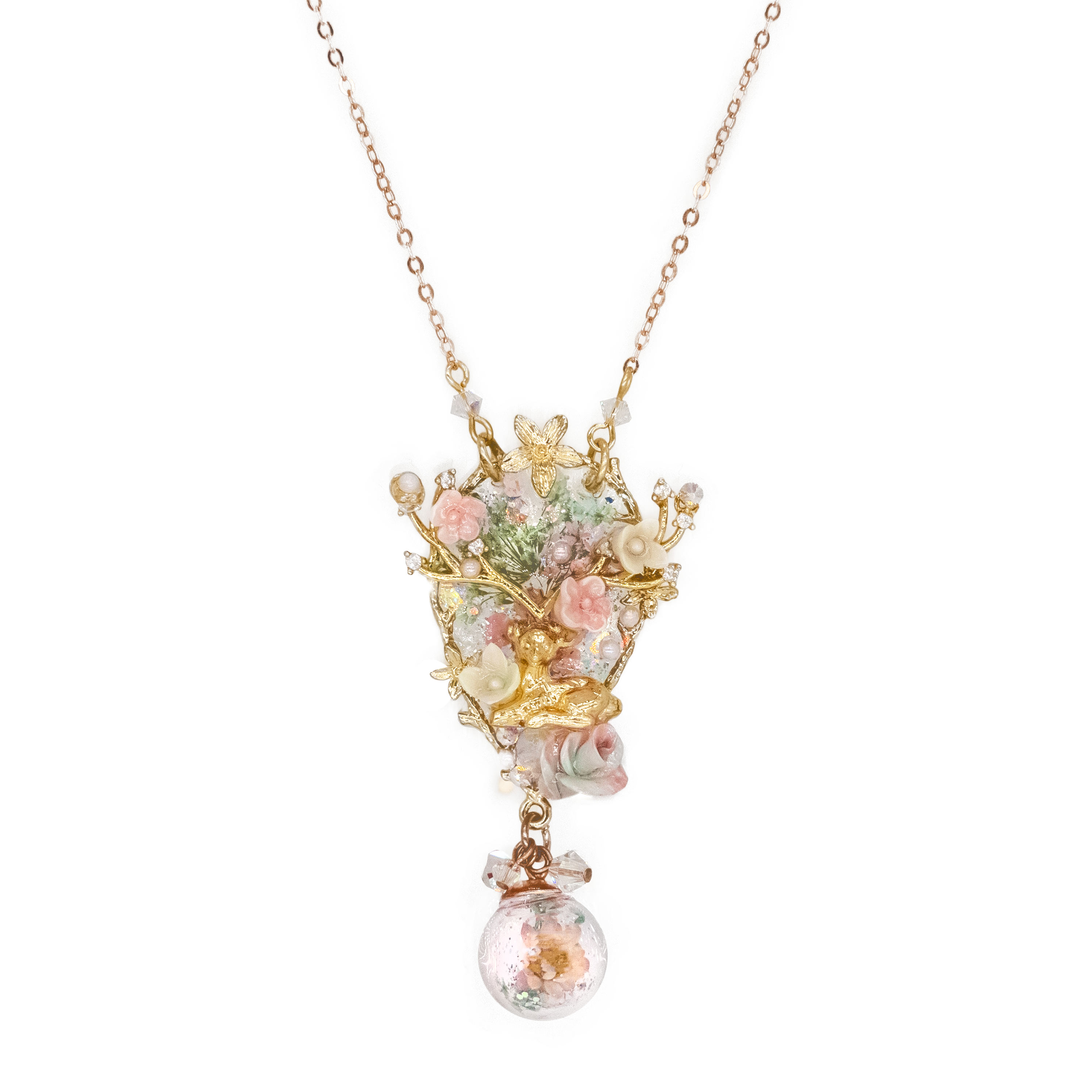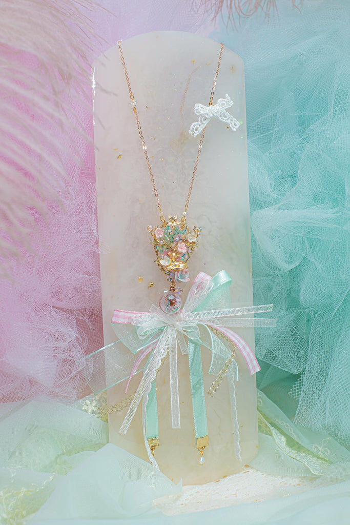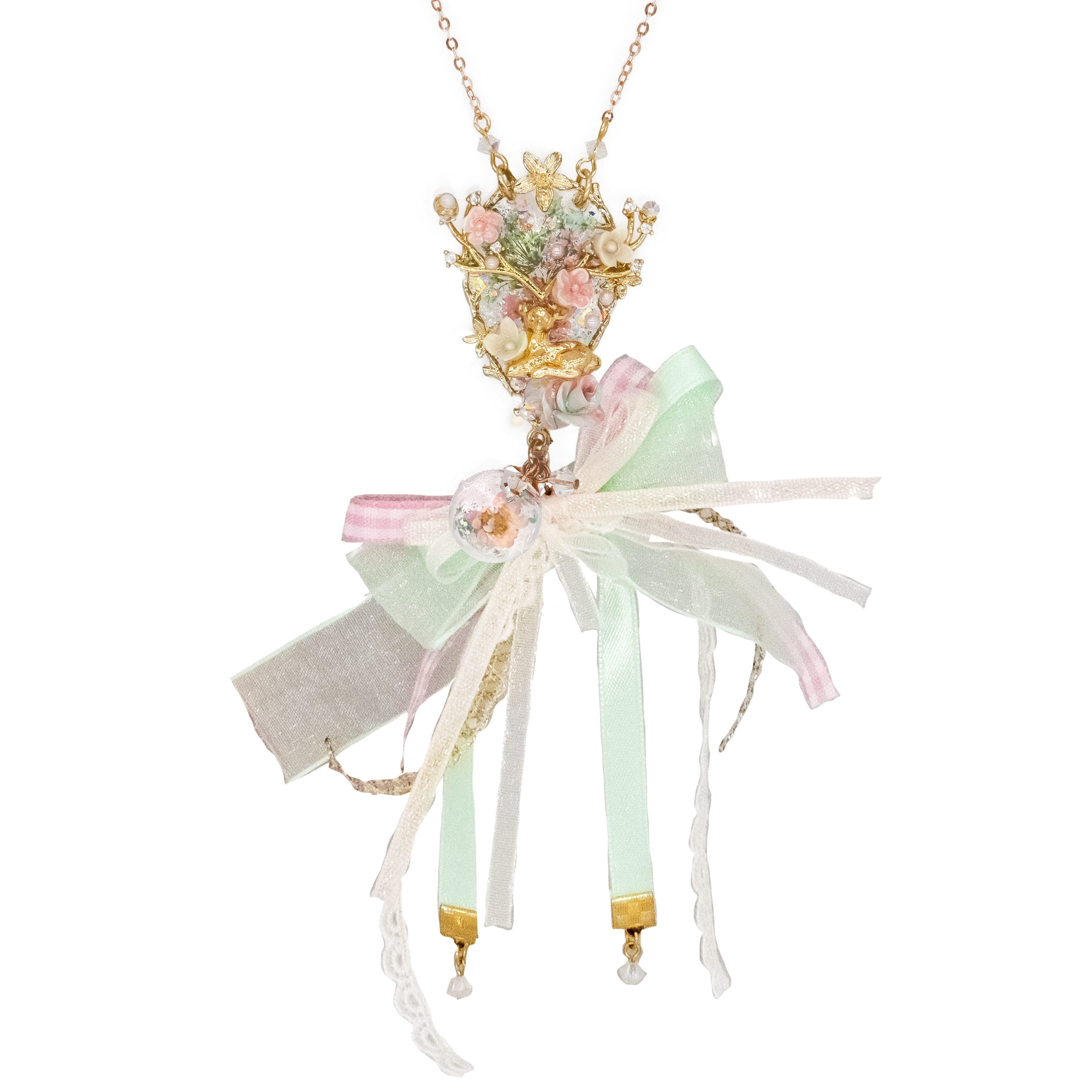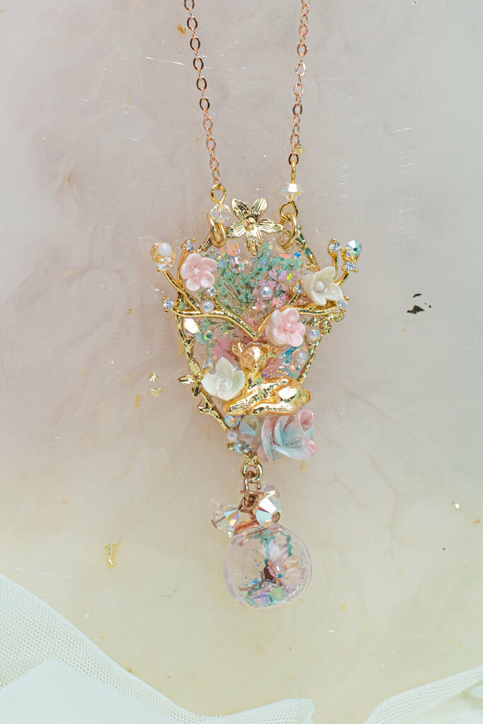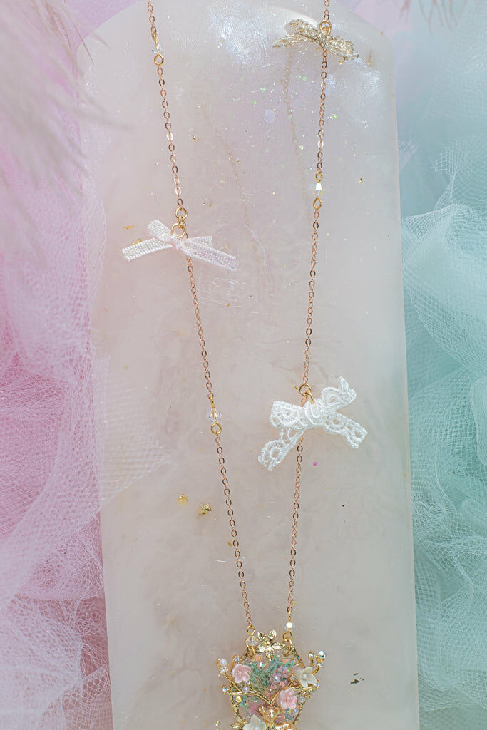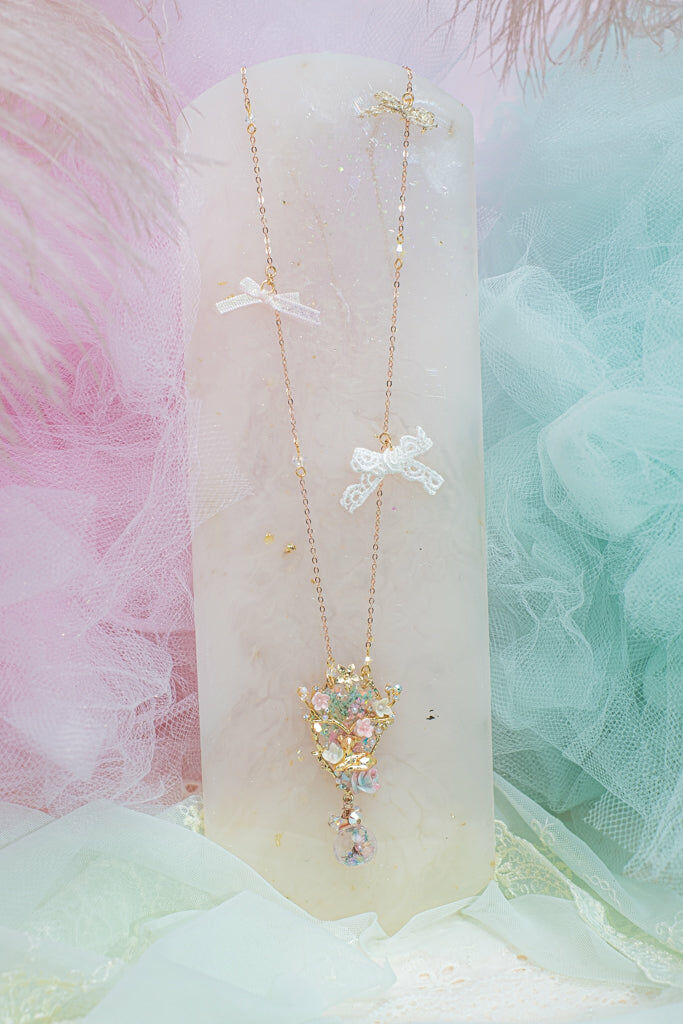 Handcrafted Cold Polymer Clay Flowers | UV hardening Protection Gel | Swarovski Crystal | Taiwanese Lace Ribbon | 18K Rosegold-plated S925 Necklace
