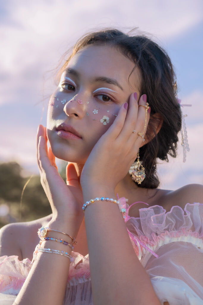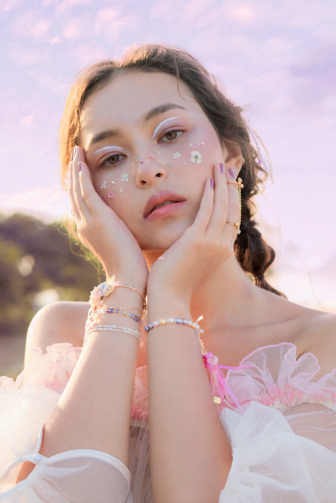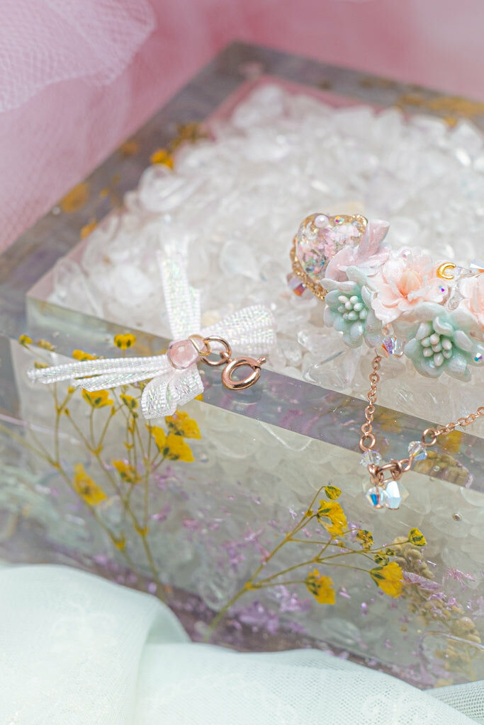 人手製作樹脂黏土花朵 | 固化保護層 | 施華洛世奇水晶 | 日本玻璃珠 | 台灣絲帶 | 鍍18K玫瑰金金屬手鐲 | 鍍18K玫瑰金S925純銀手鍊