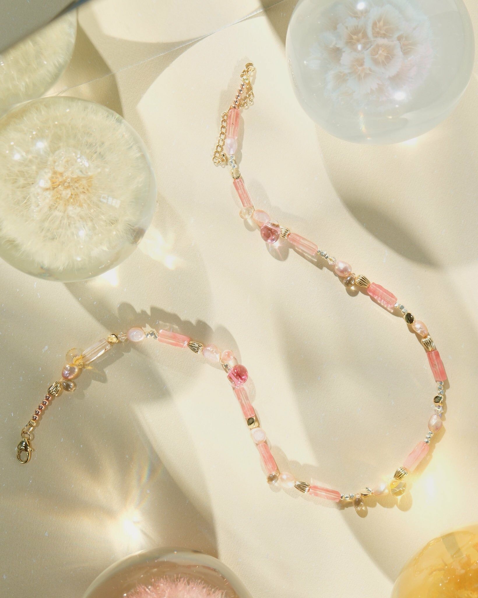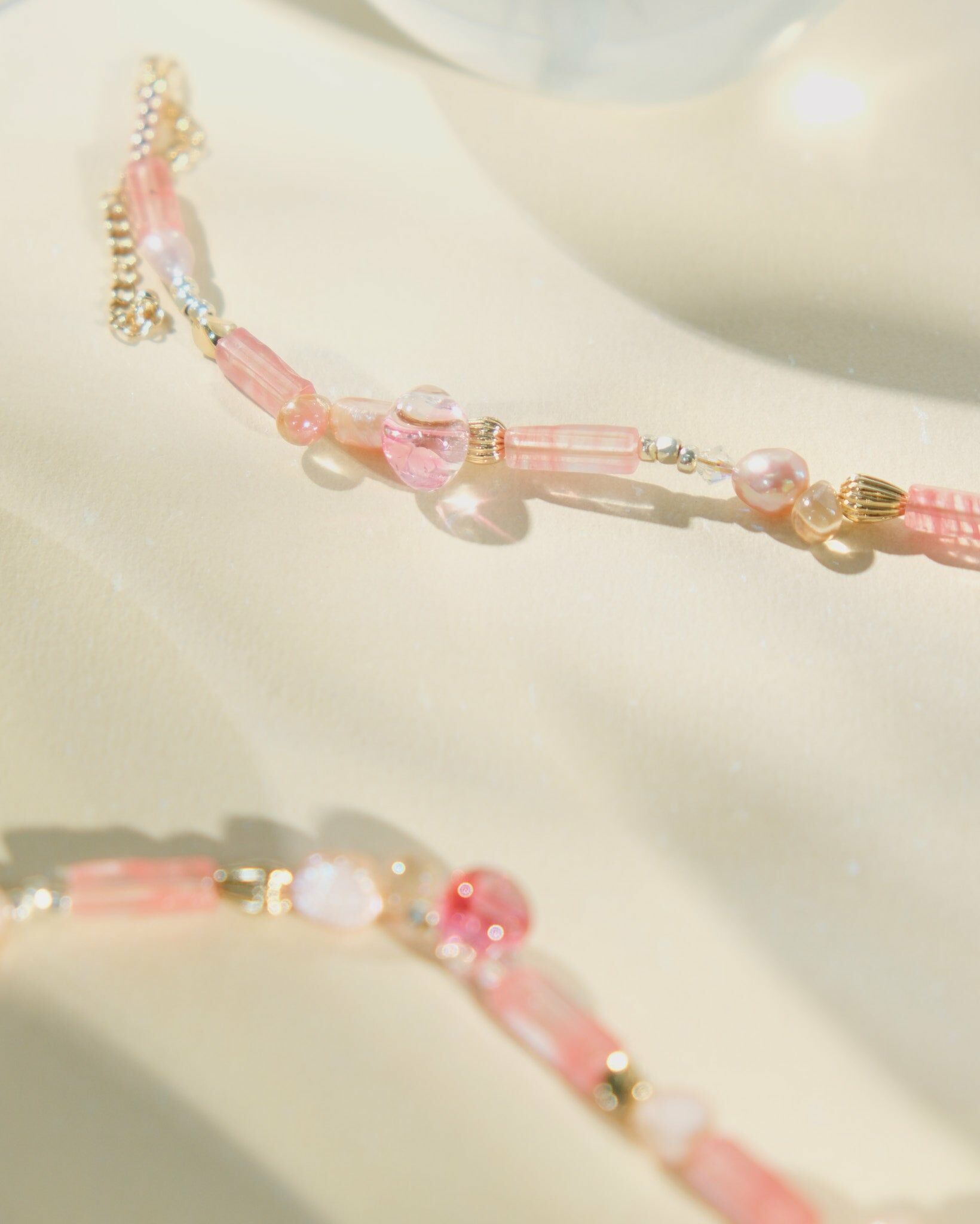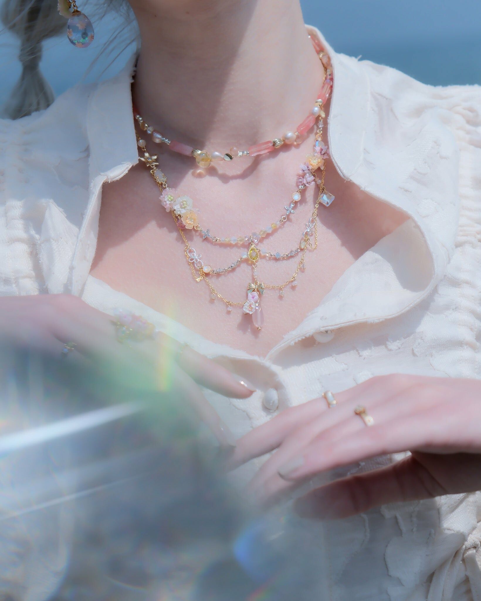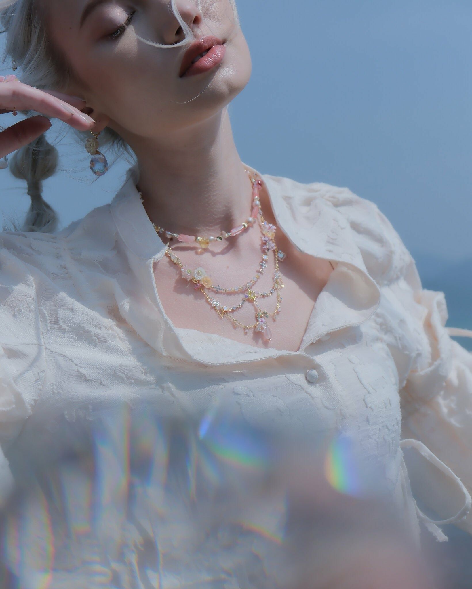 In the 2023 flower season of sakuras, Pamycarie sincerely hopes that everyone could experience the heart leaps and insecurities when having a crush. Sometimes we are unsure about presenting our true selves, at other times we desire to be as lucid as we could. Inspired by such complex feelings, Pamycarie creates the translucent sakuras in contrast to the pink and white sakuras, which imply the depiction of real and surreal. Novel designs have also enriched the visual impact of the collection, such as the hand-drawn sakura azure globule, organdy and wire-wrapped flowers, not to mention the playful seed bead choker. May the sakuras accompany you as always, no matter if you could solve the riddles.