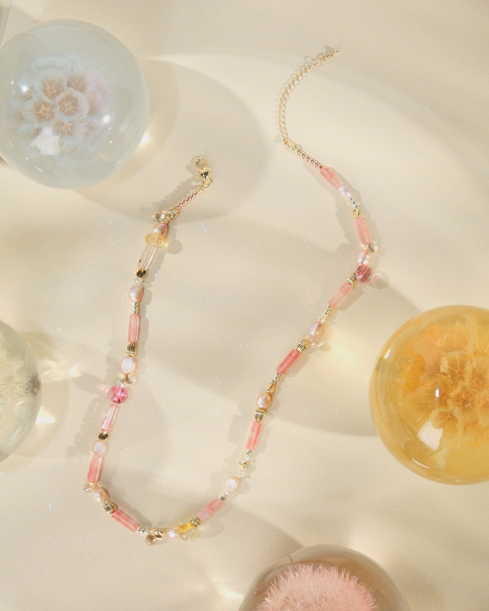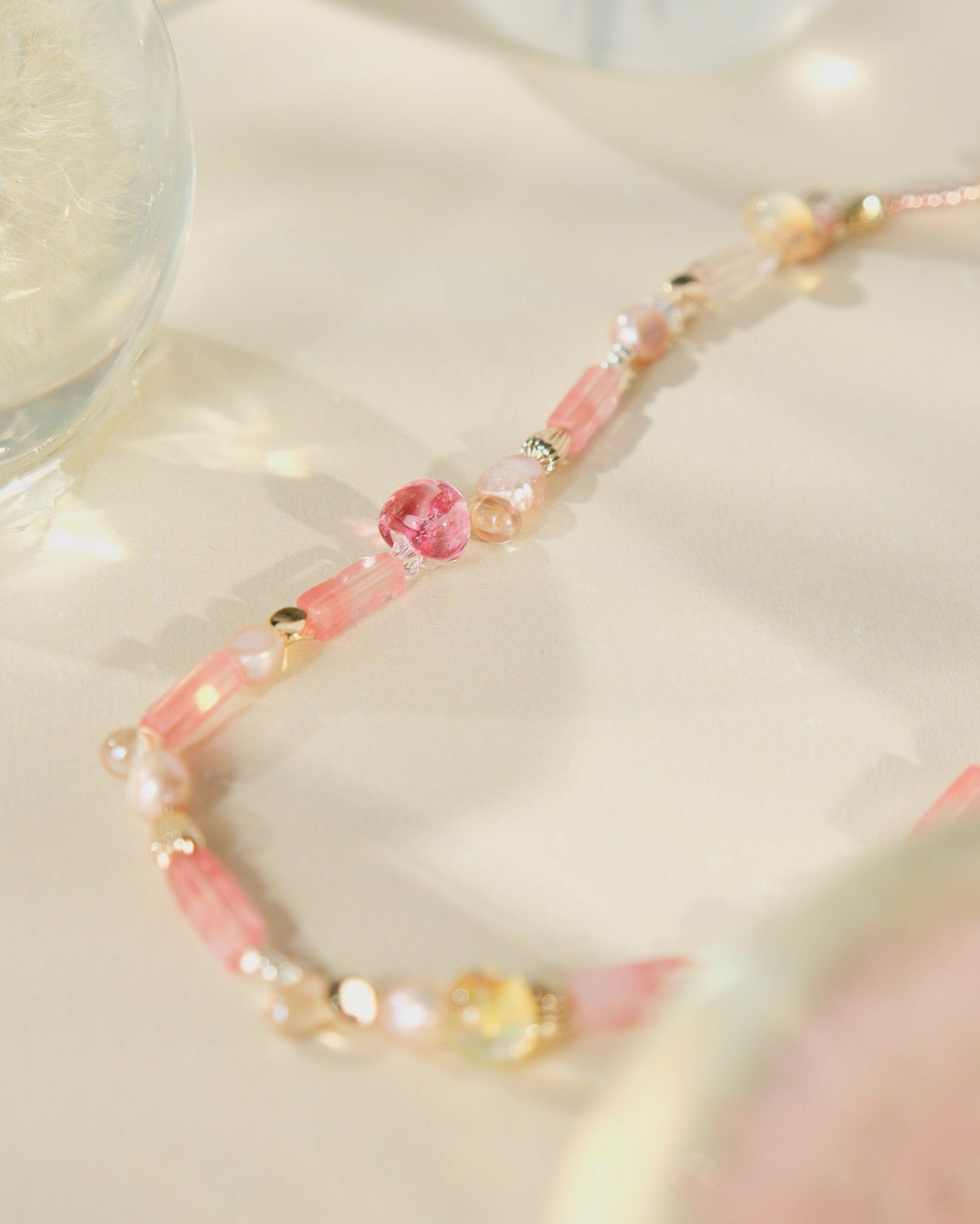 這款鎖骨鏈顆精選的巴洛克淡水珍珠串成,質感柔潤,光澤迷人,配搭上天然粉晶,讓整件作品更加鮮明、生動。作品粗細適中,與金屬細鏈的斯文氣質呈現更活潑率真的感覺。