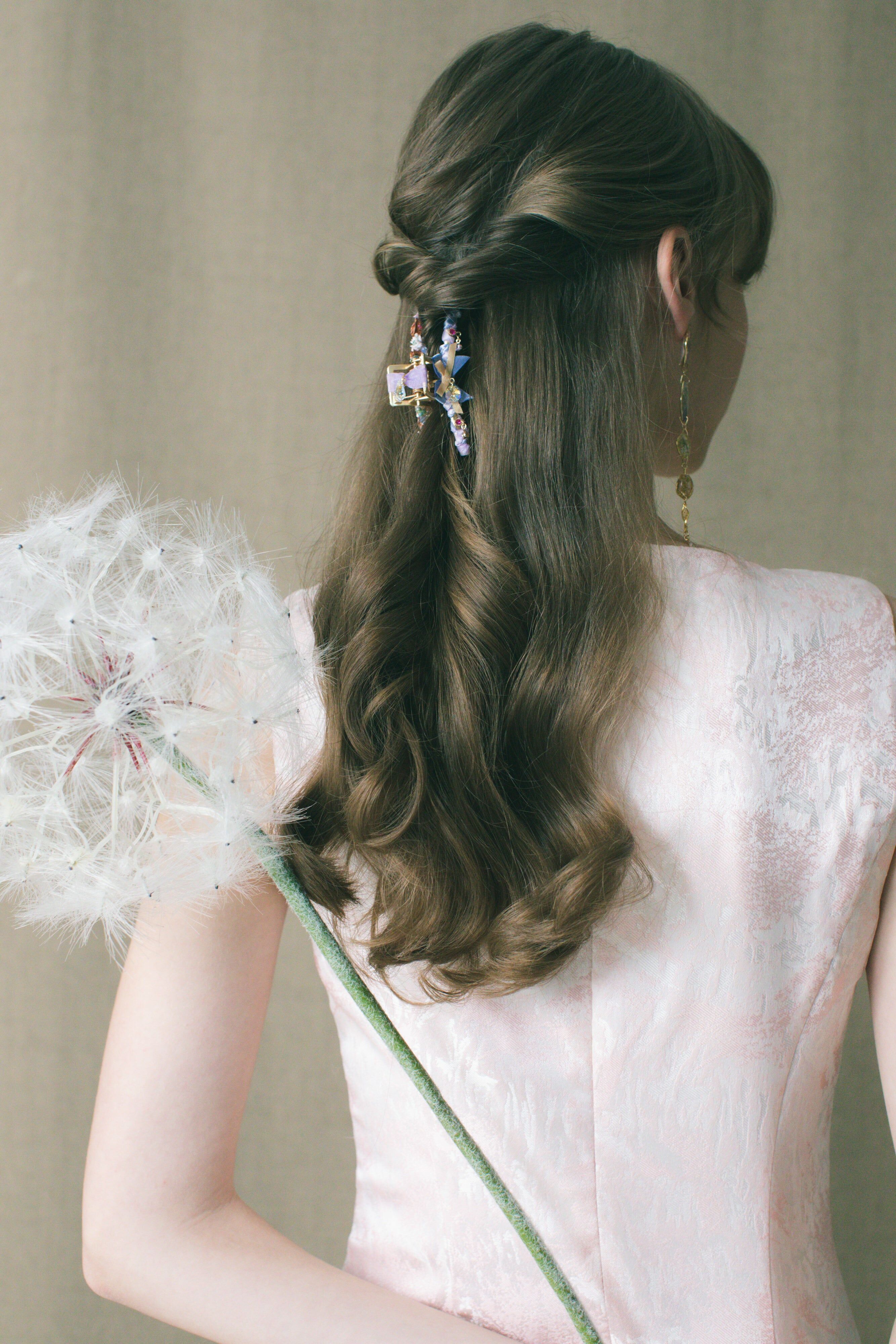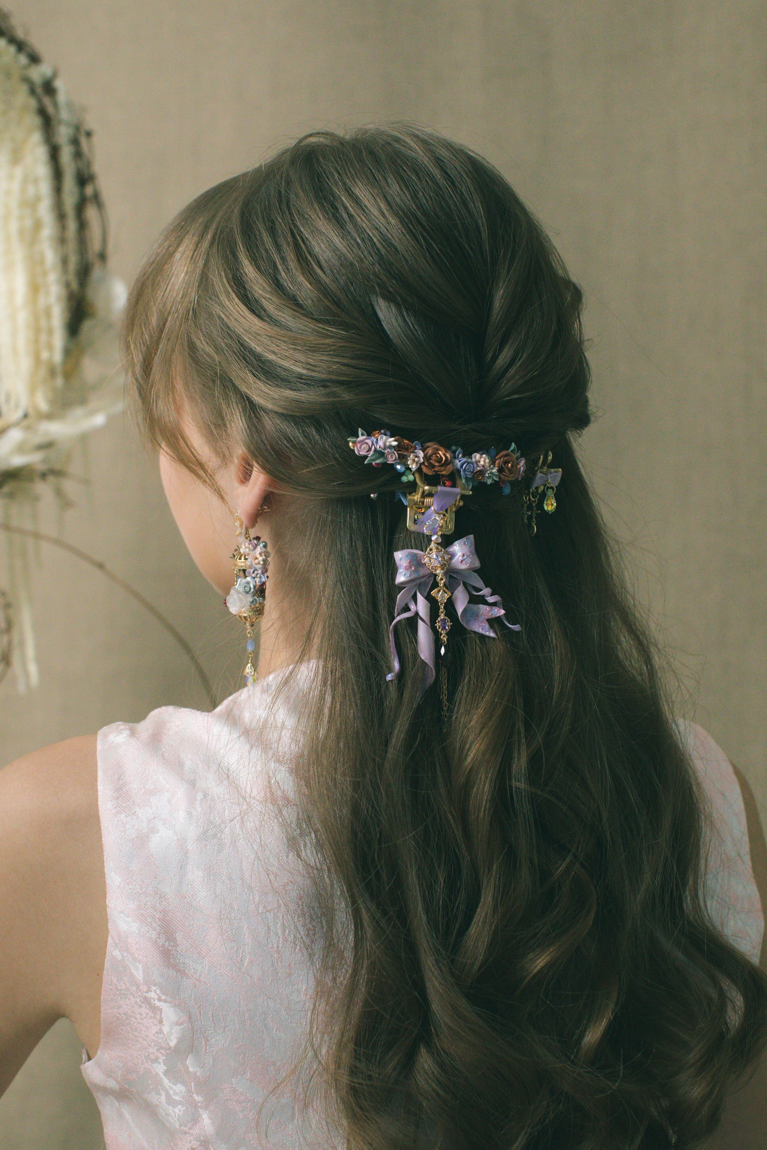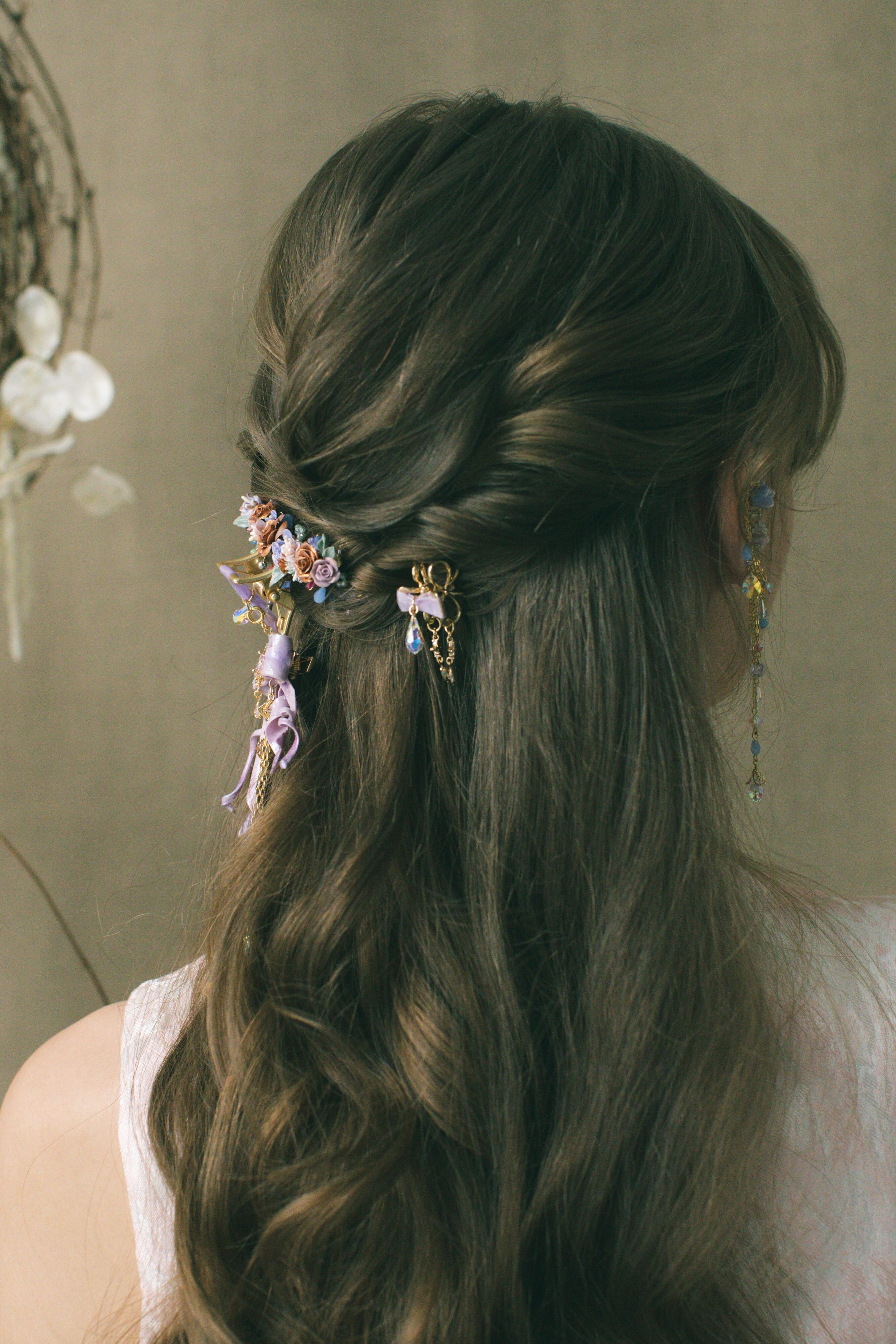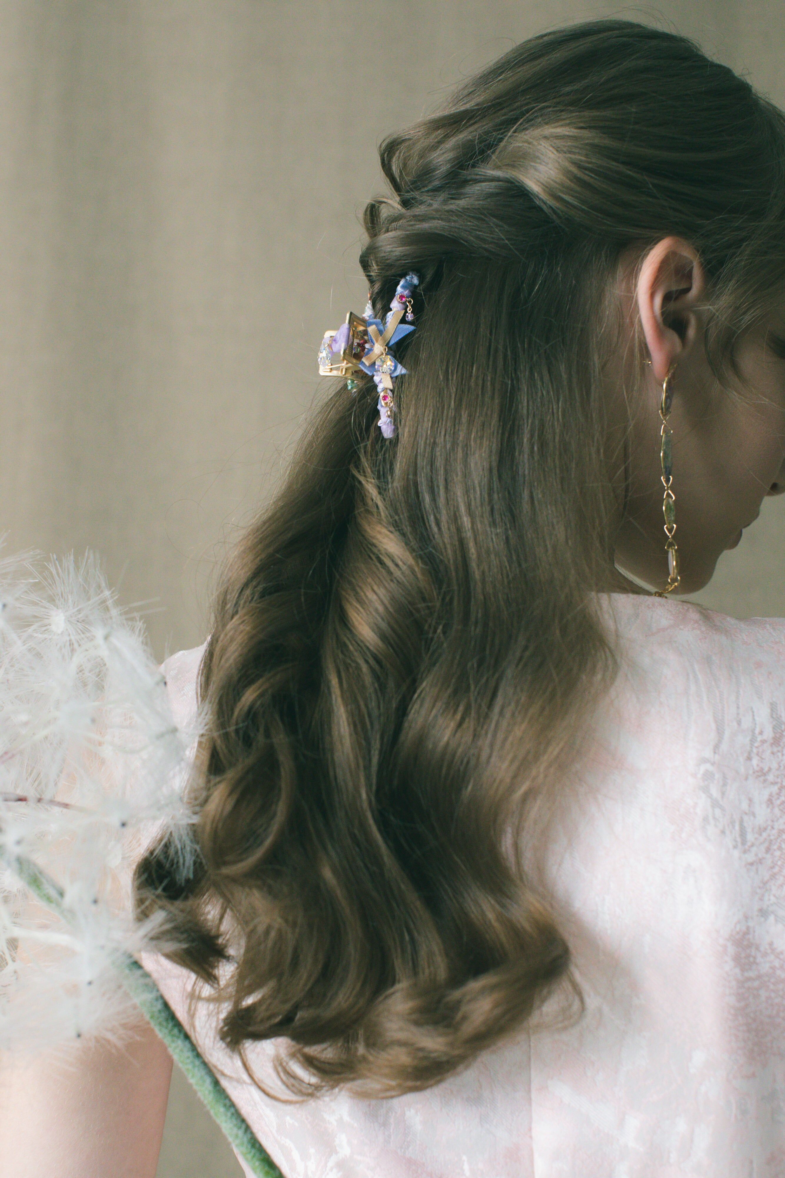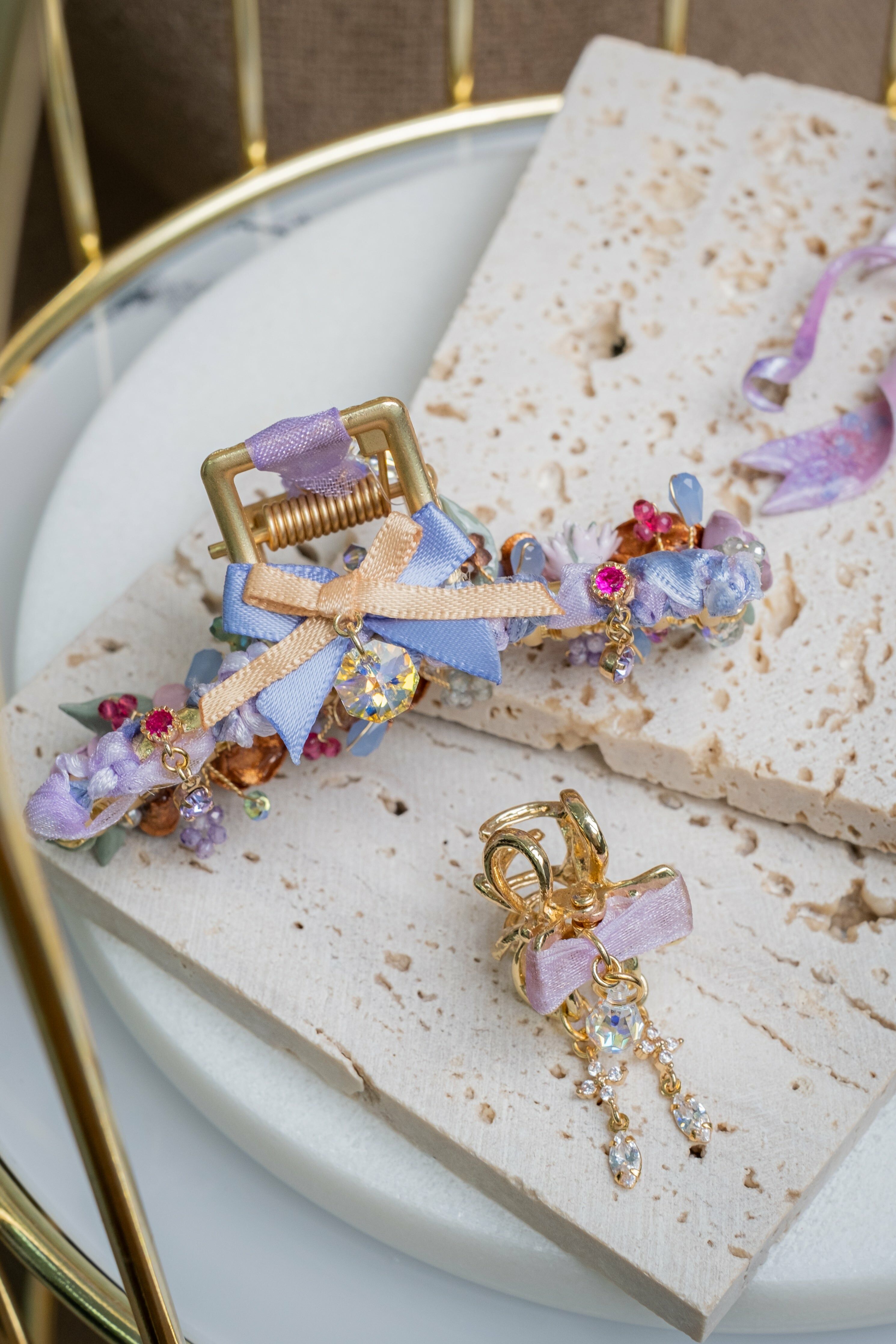 用堅硬的物料,造出最柔軟的姿態。滿花的鯊魚夾與金屬風的小鯊魚夾兩者互補之餘,再配上搶眼的粉紅緞帶蝴蝶結(以樹脂黏土製成),今晚你就是主角!